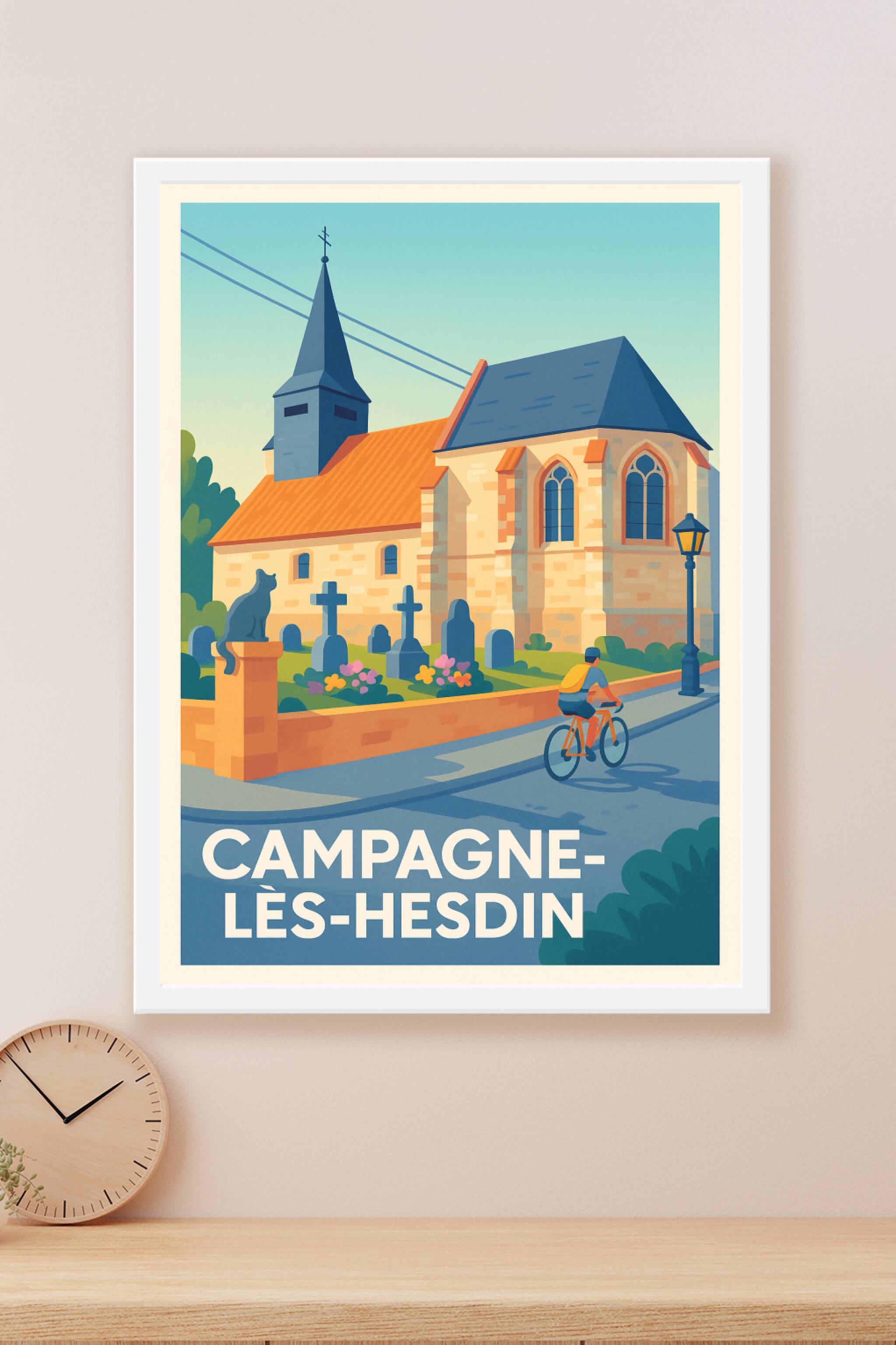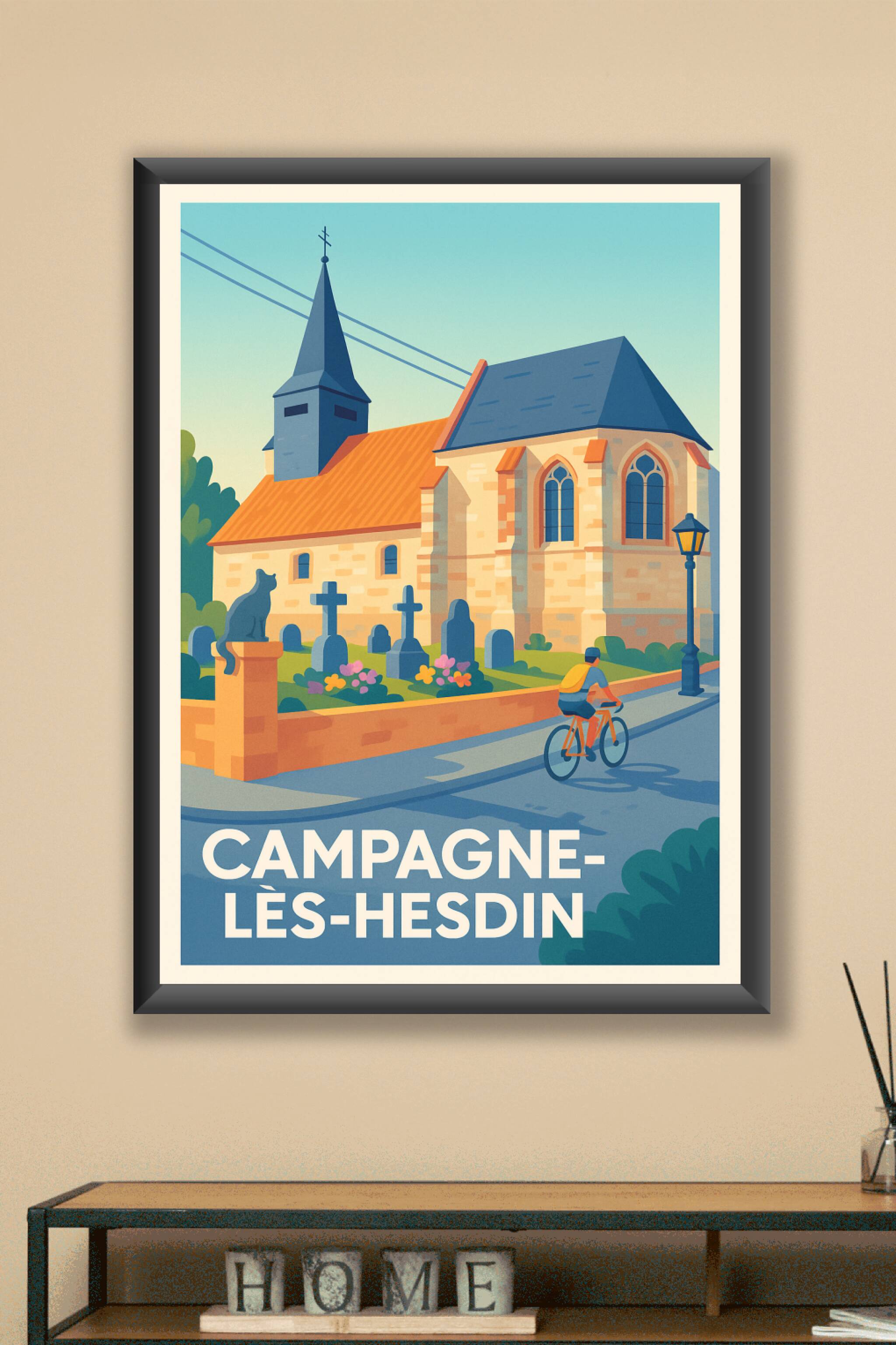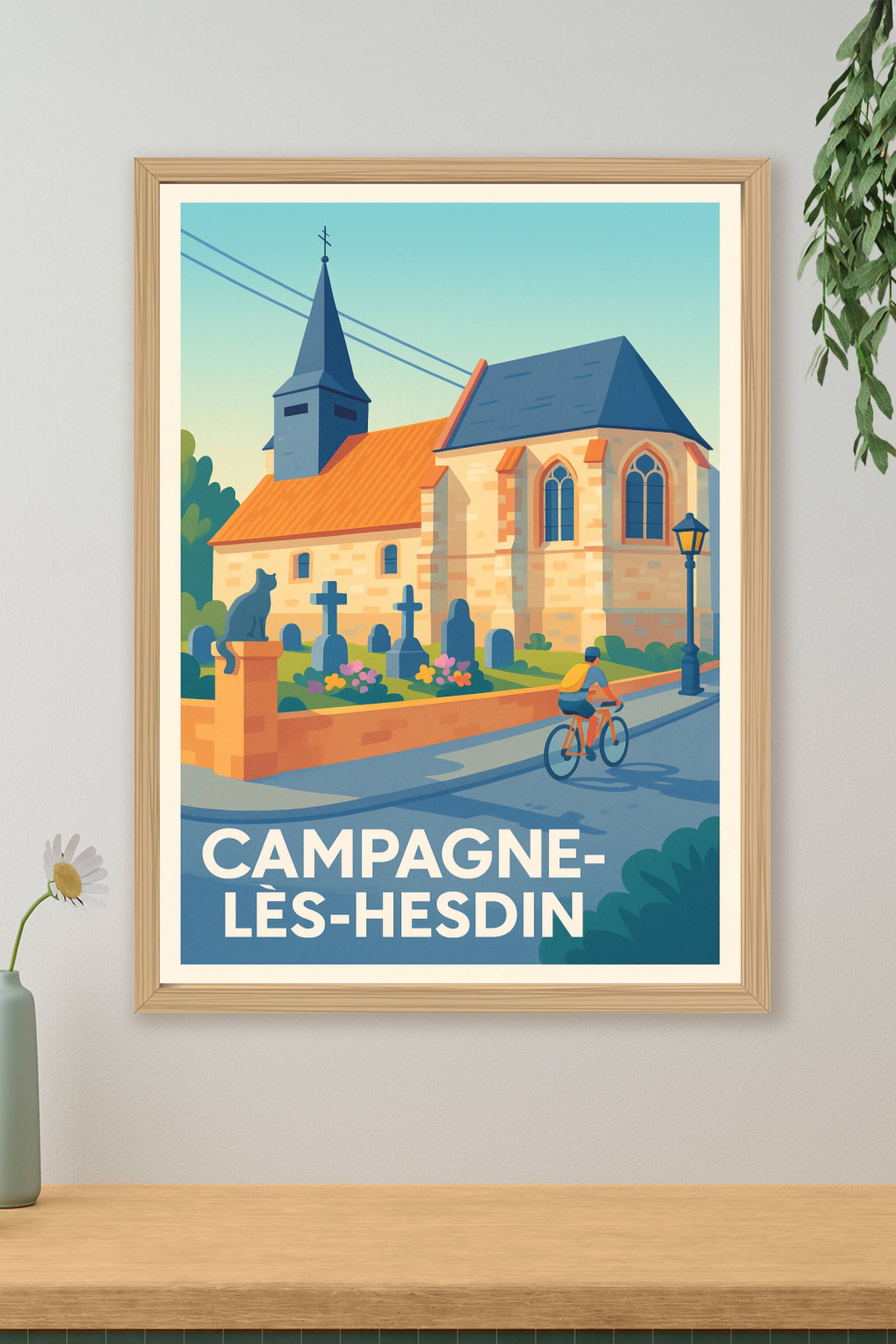 Découvrez le charme paisible de Campagne-lès-Hesdin à travers cette affiche illustrée mettant en scène une église pittoresque et un cycliste dans un décor bucolique. Ce poster capture l'essence d'un village authentique, parfait pour apporter une note de douceur et de calme à votre intérieur. Imprimée en tirage "Fine Art" sur un papier coton 305g de haute qualité, cette affiche offre des couleurs éclatantes et une finesse de détails remarquable. Disponible en plusieurs formats du A1 au A4, avec ou sans cadre, elle s'adapte à tous les espaces et styles de décoration. Offrez-vous ou offrez un souvenir unique et raffiné de Campagne-lès-Hesdin avec cette affiche de qualité premium, 100% fabriquée en France.