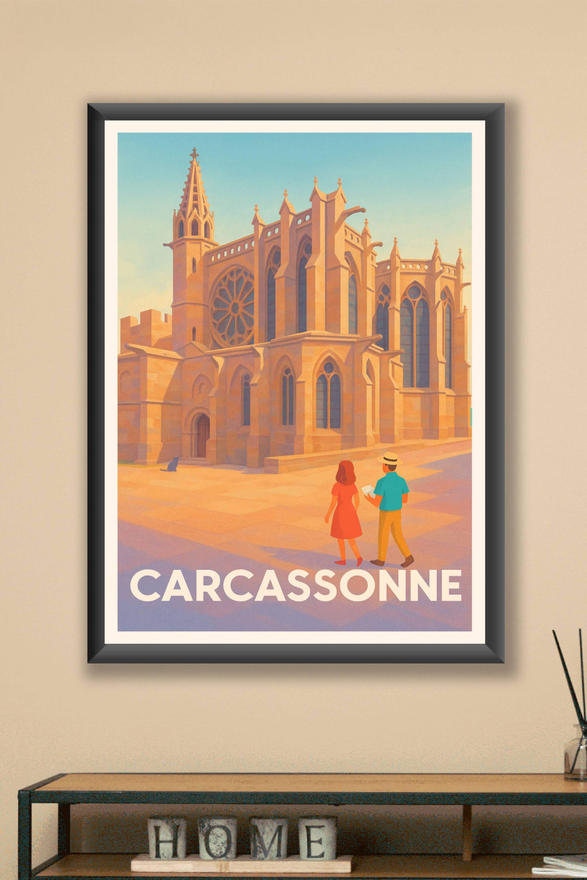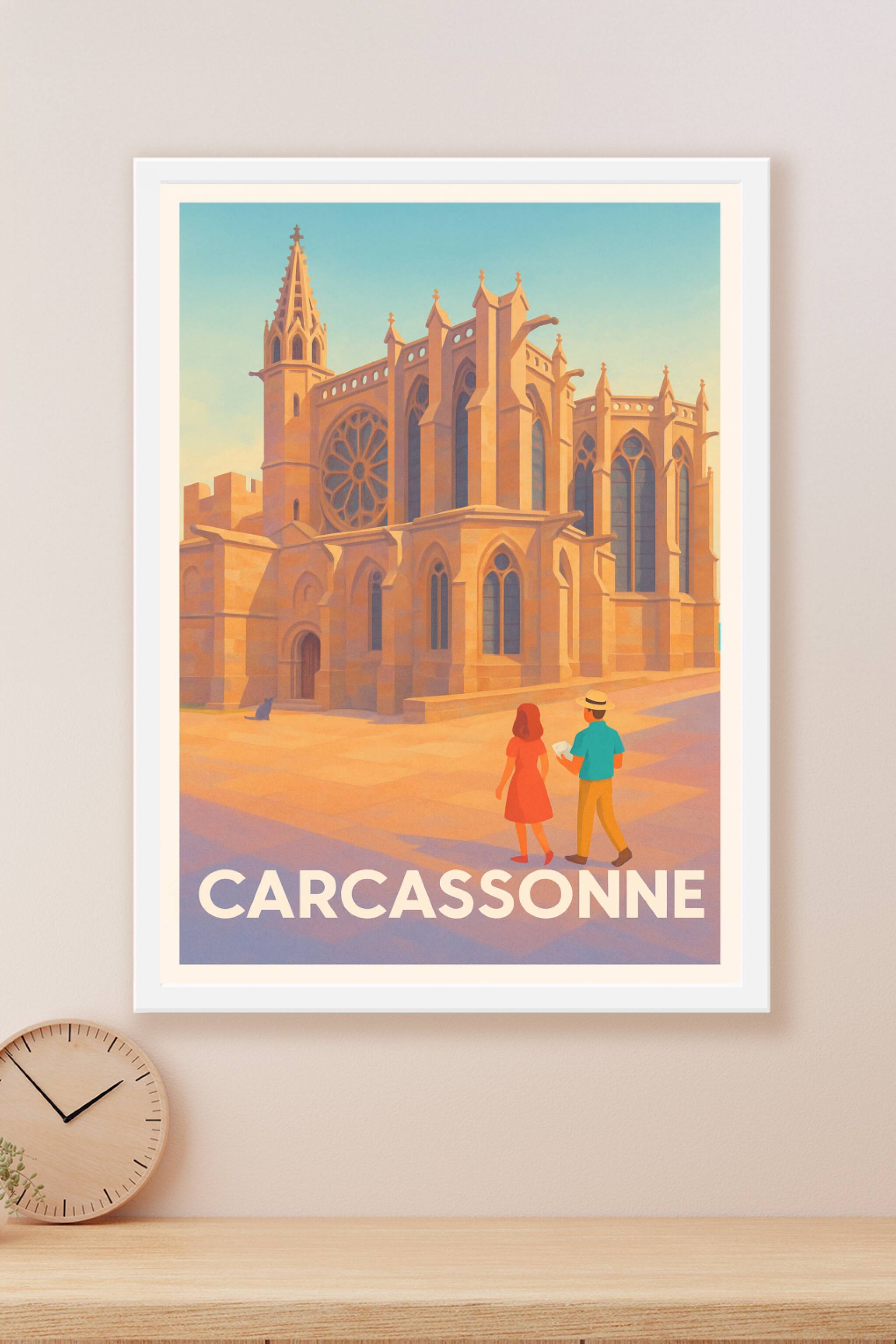 Découvrez l'atmosphère unique de Carcassonne avec cette affiche représentant son architecture gothique emblématique sous une lumière douce et chale...