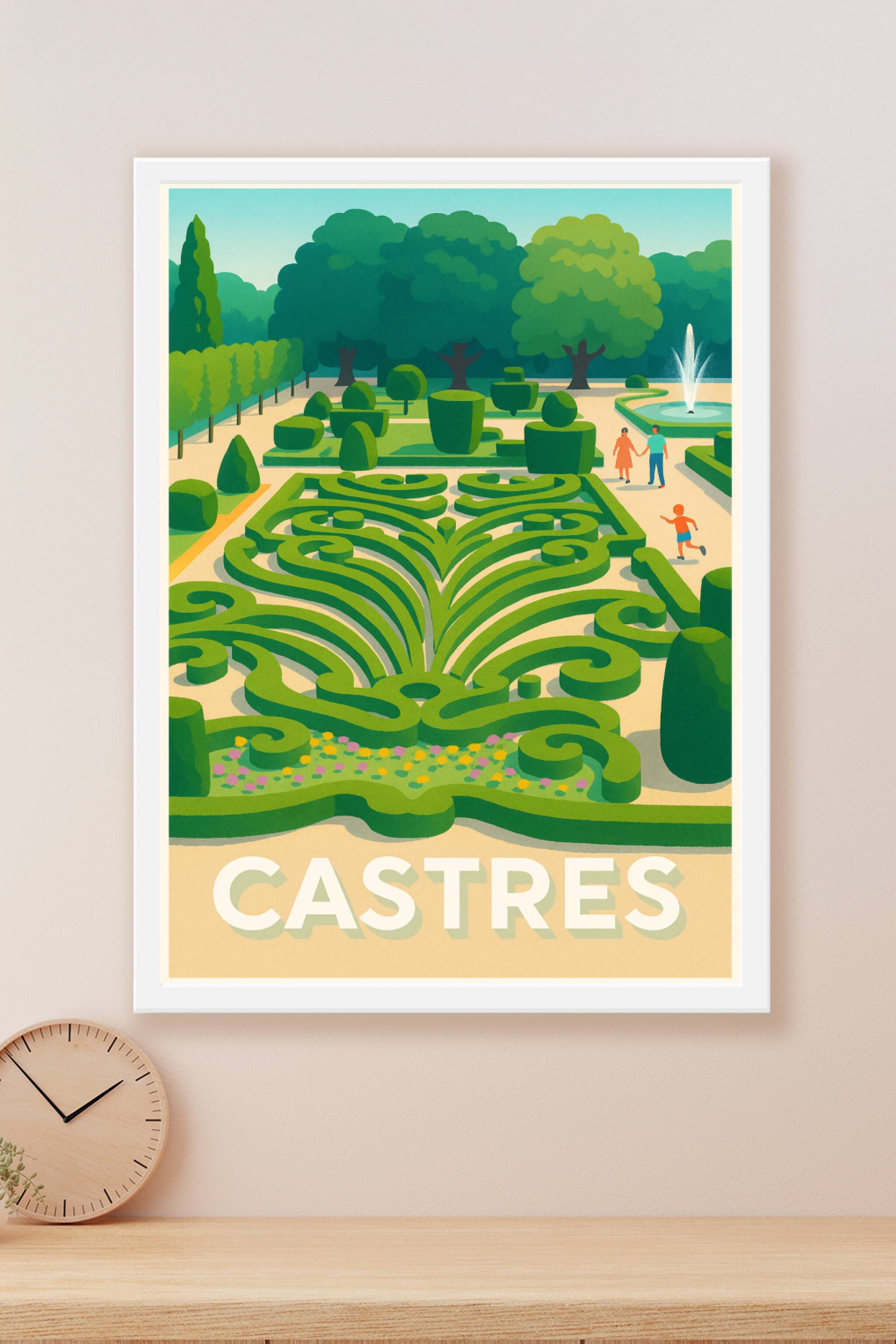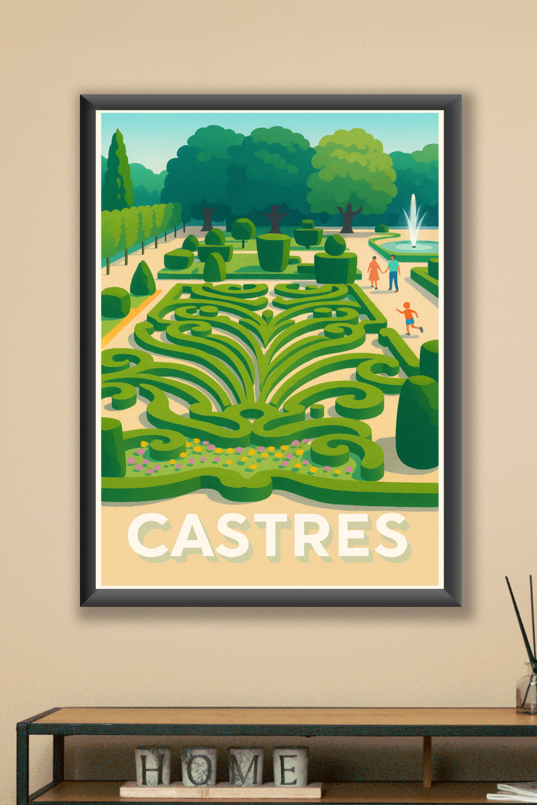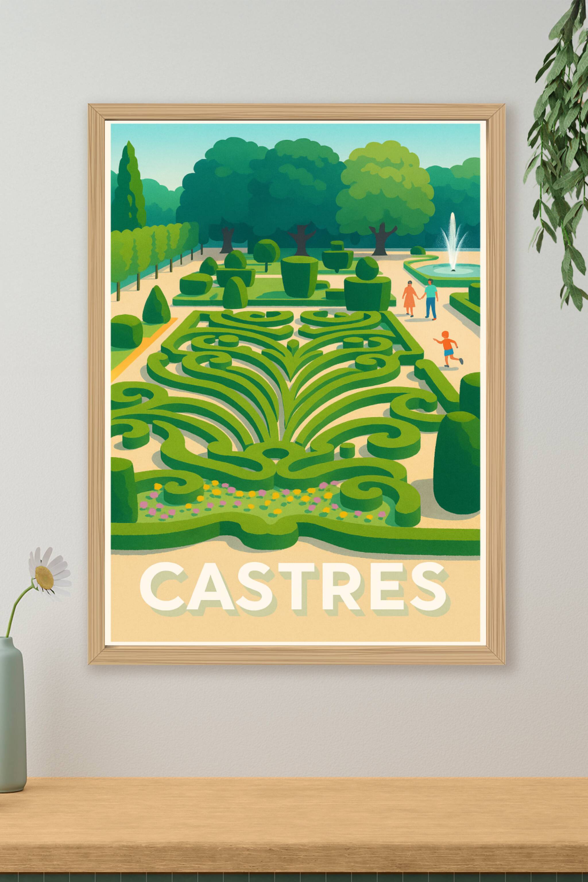 Découvrez la beauté géométrique et apaisante des jardins à la française de Castres grâce à cette affiche au style vintage et coloré. Ce poster met ...