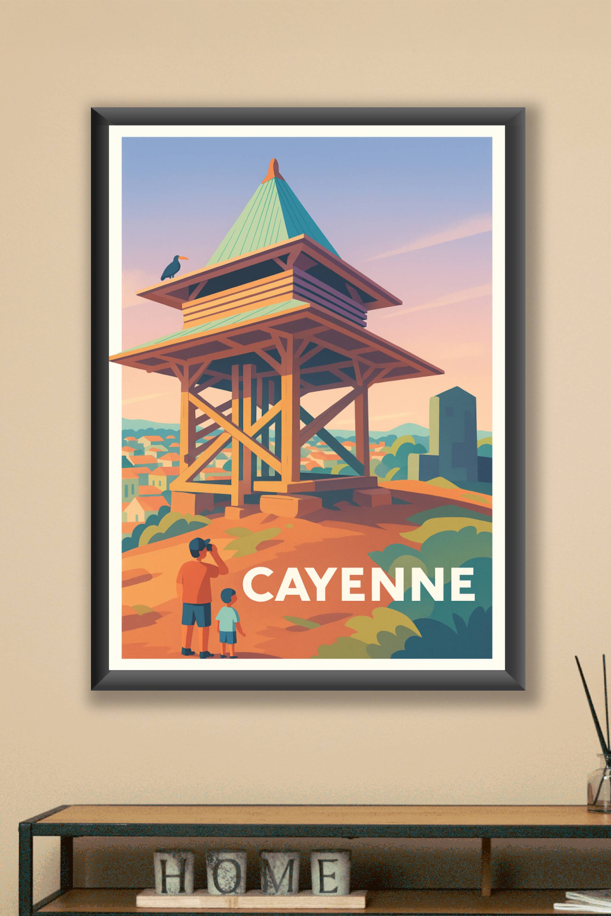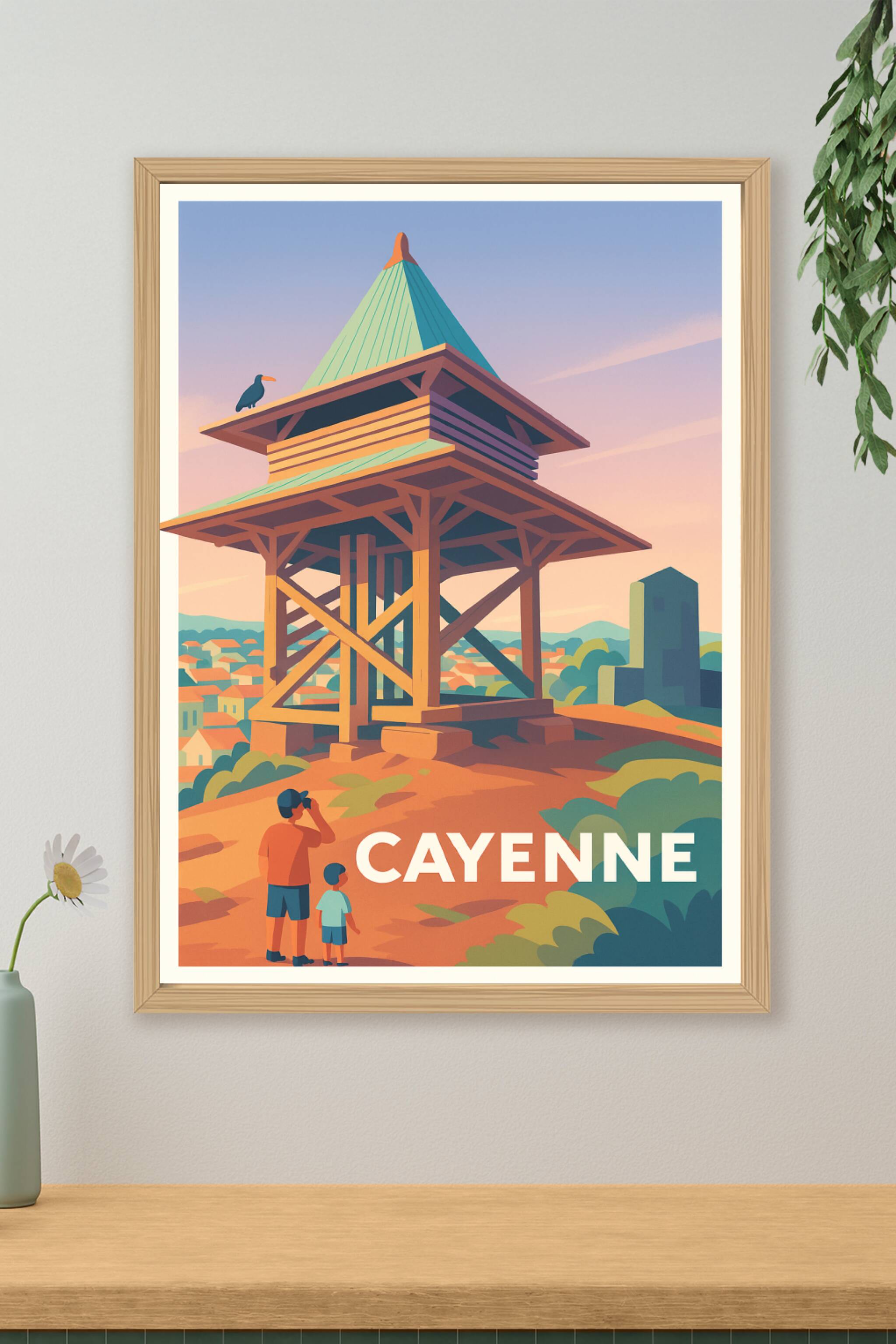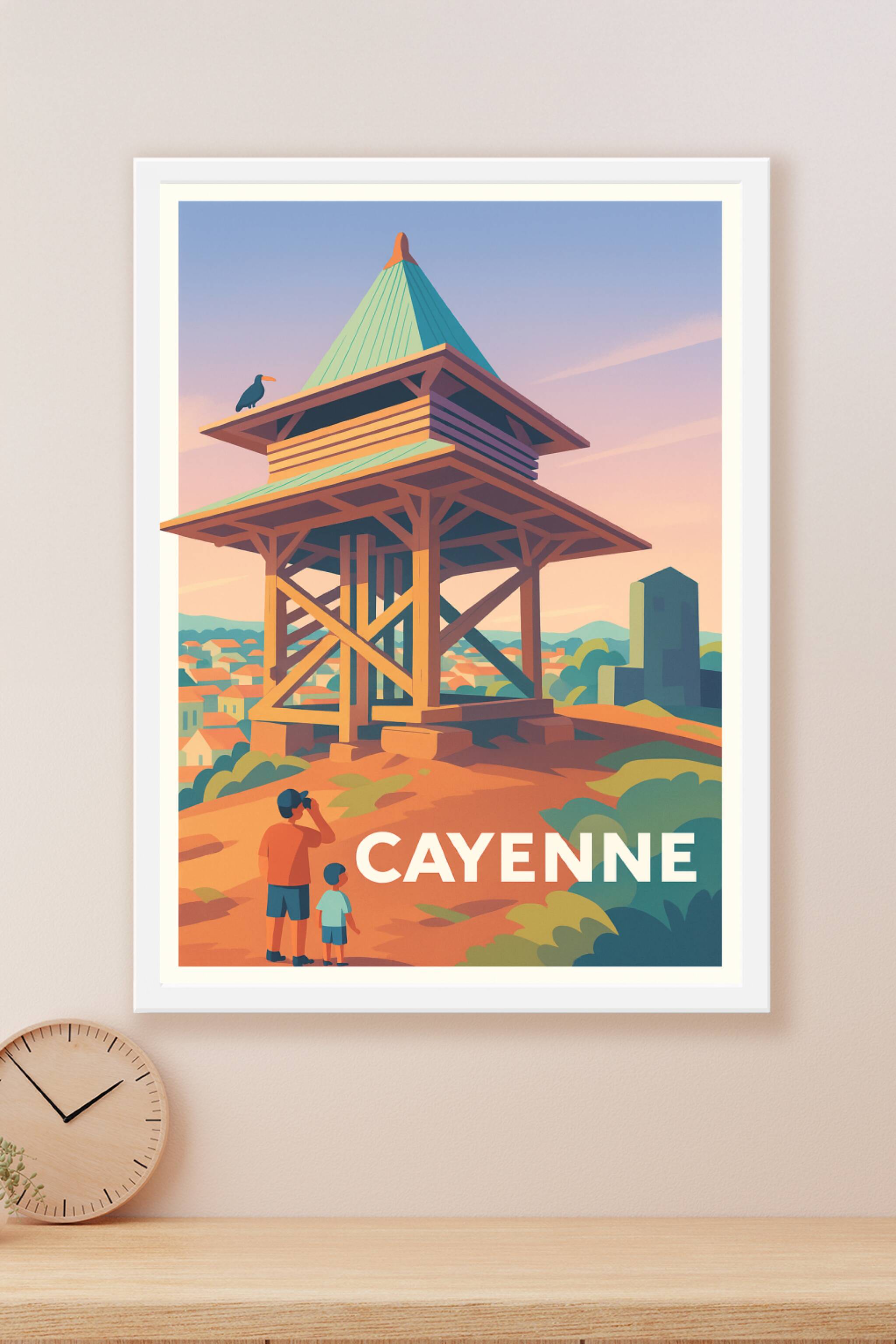 Découvrez la beauté unique de Cayenne avec cette affiche illustrée qui capture l'atmosphère paisible d'un point de vue célèbre sur la ville. Ce pos...