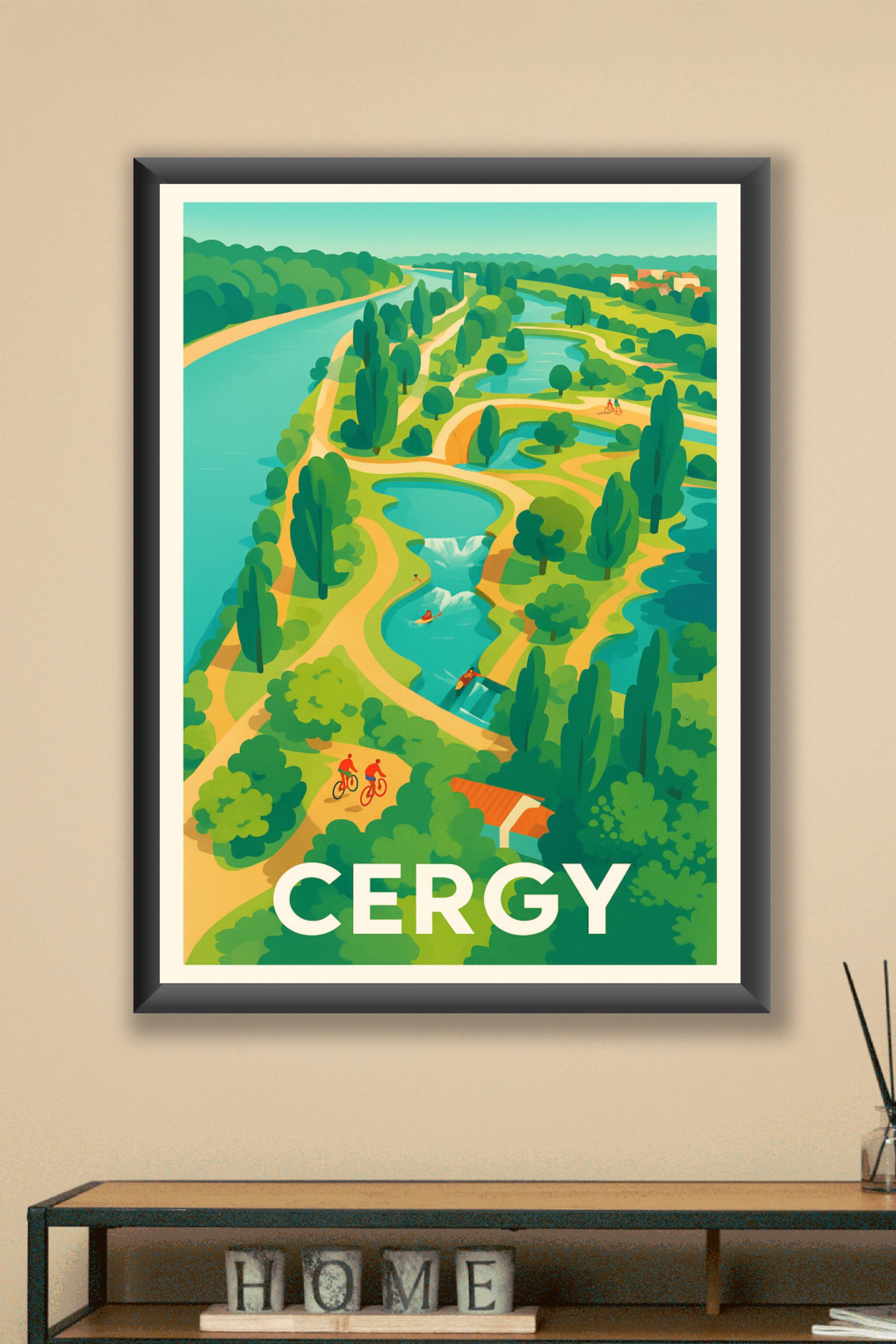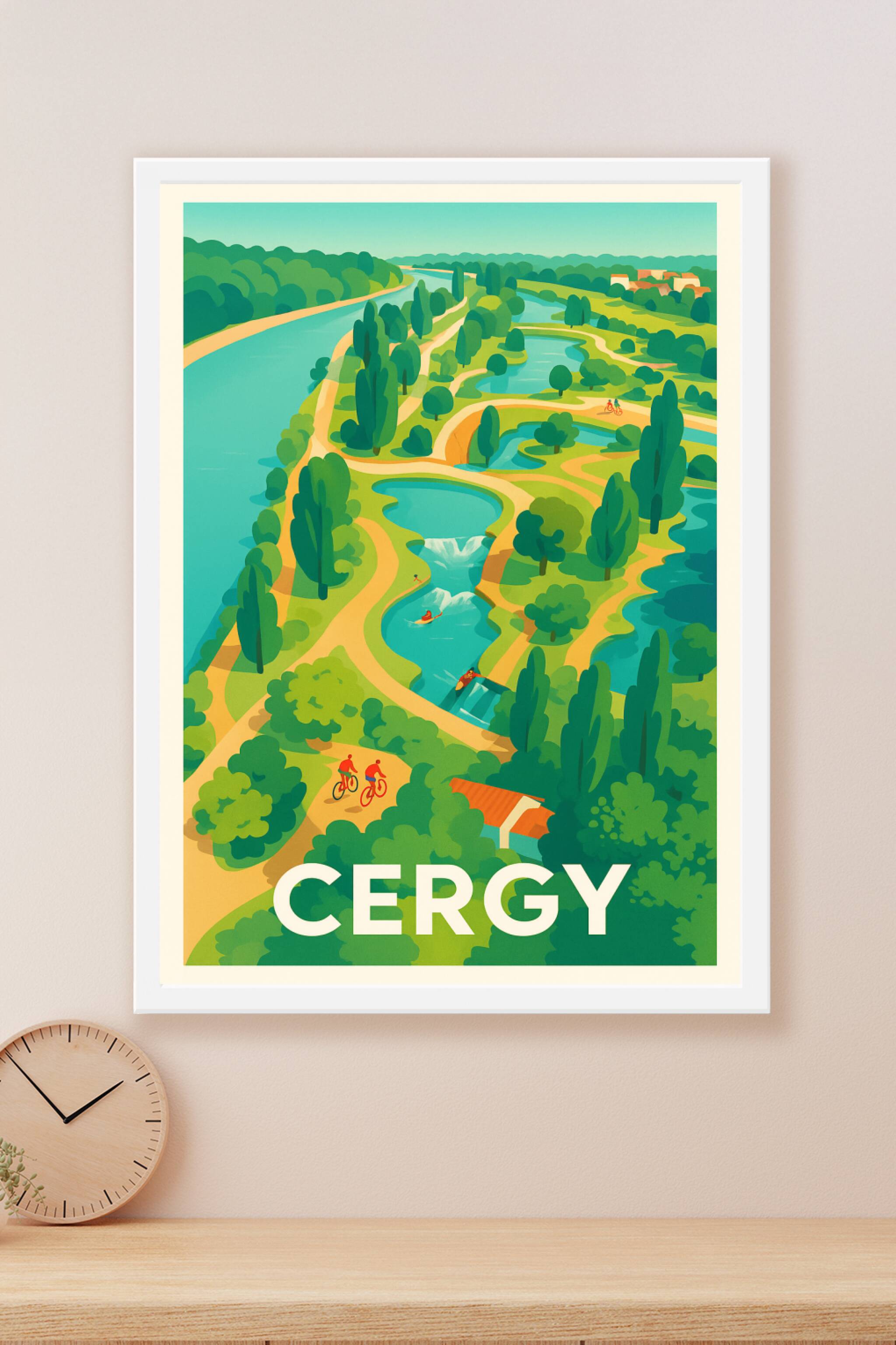 Découvrez la sérénité et le dynamisme de Cergy avec cette affiche illustrée mettant en scène ses espaces verts luxuriants et ses eaux paisibles. Ce...