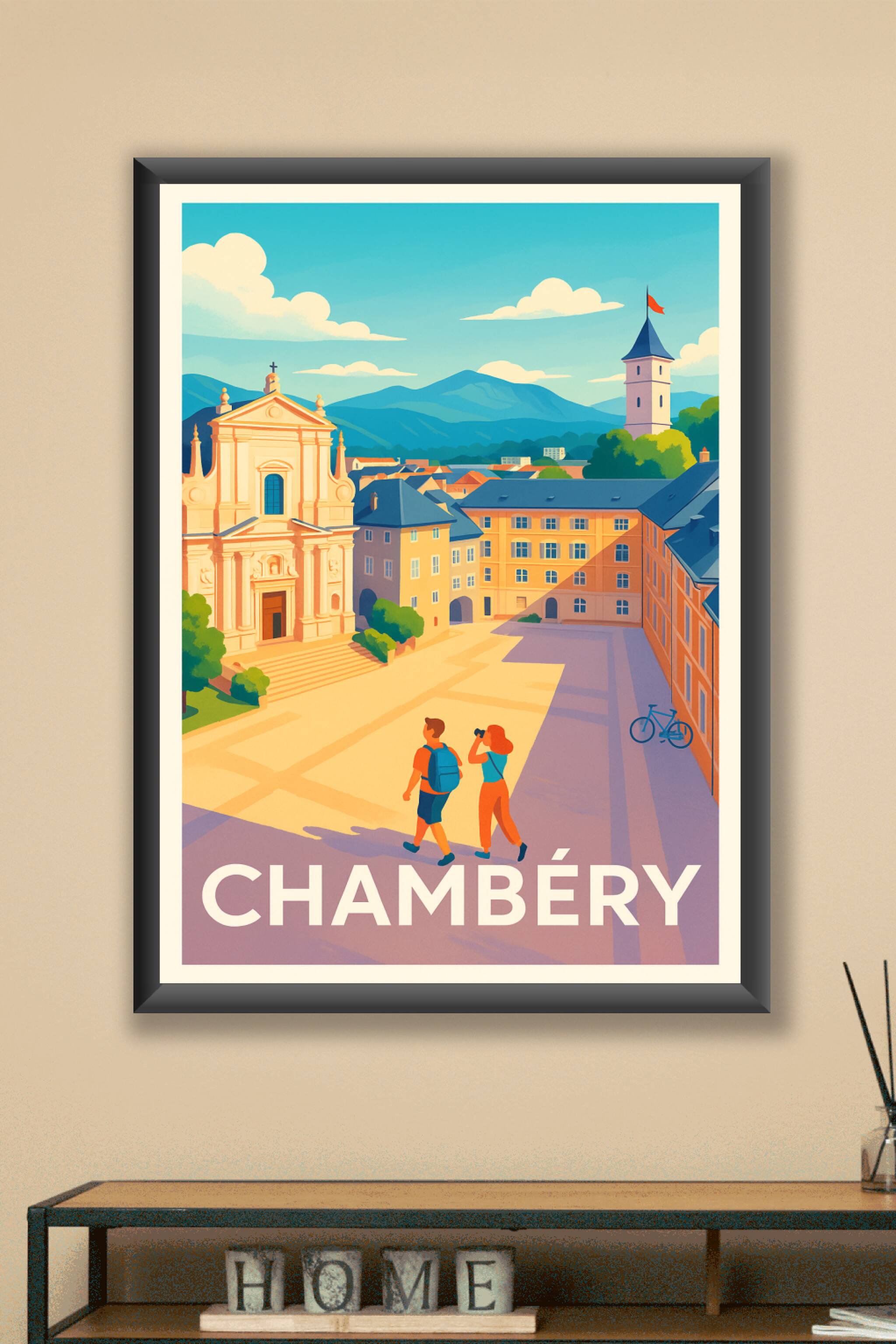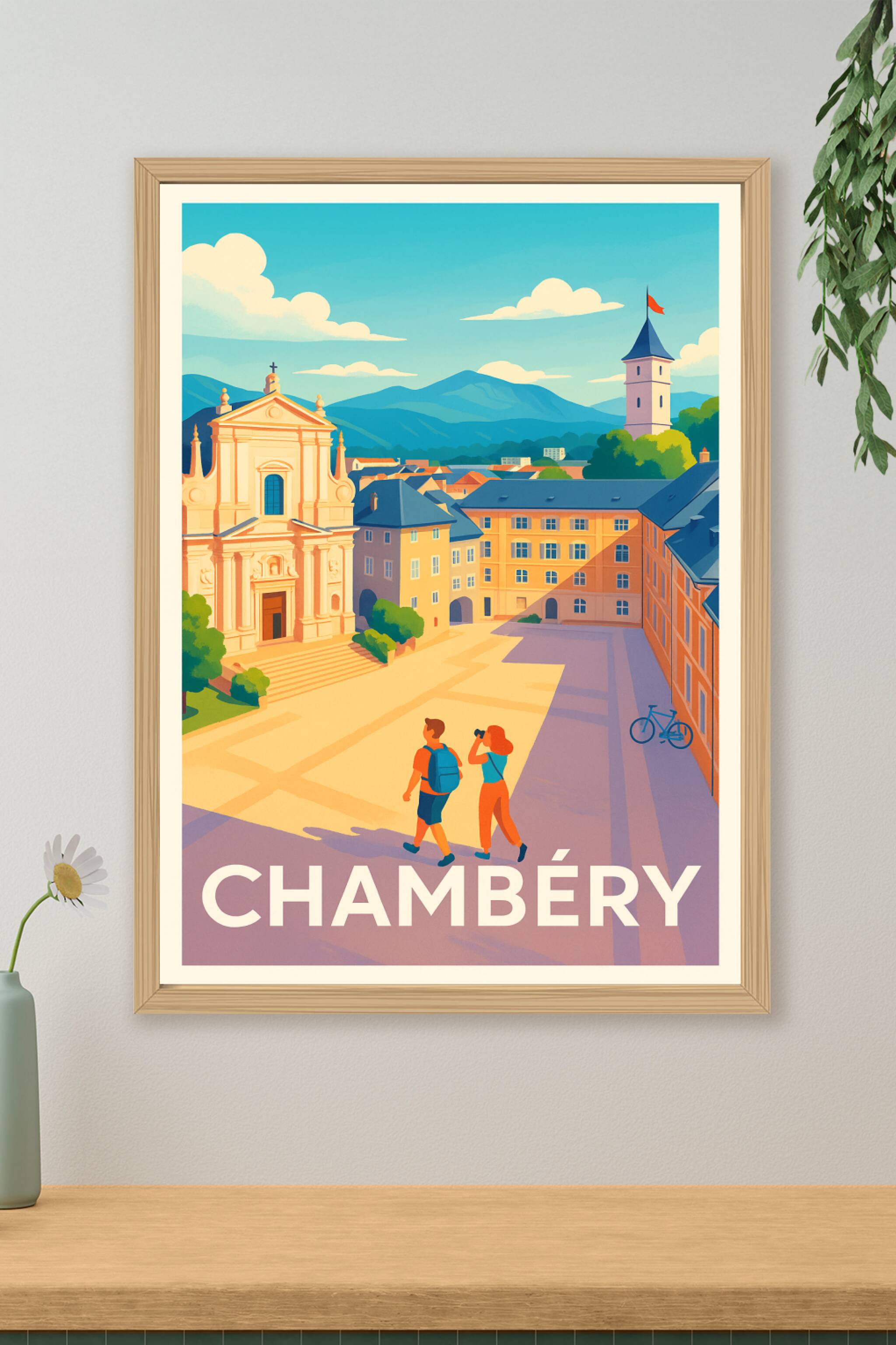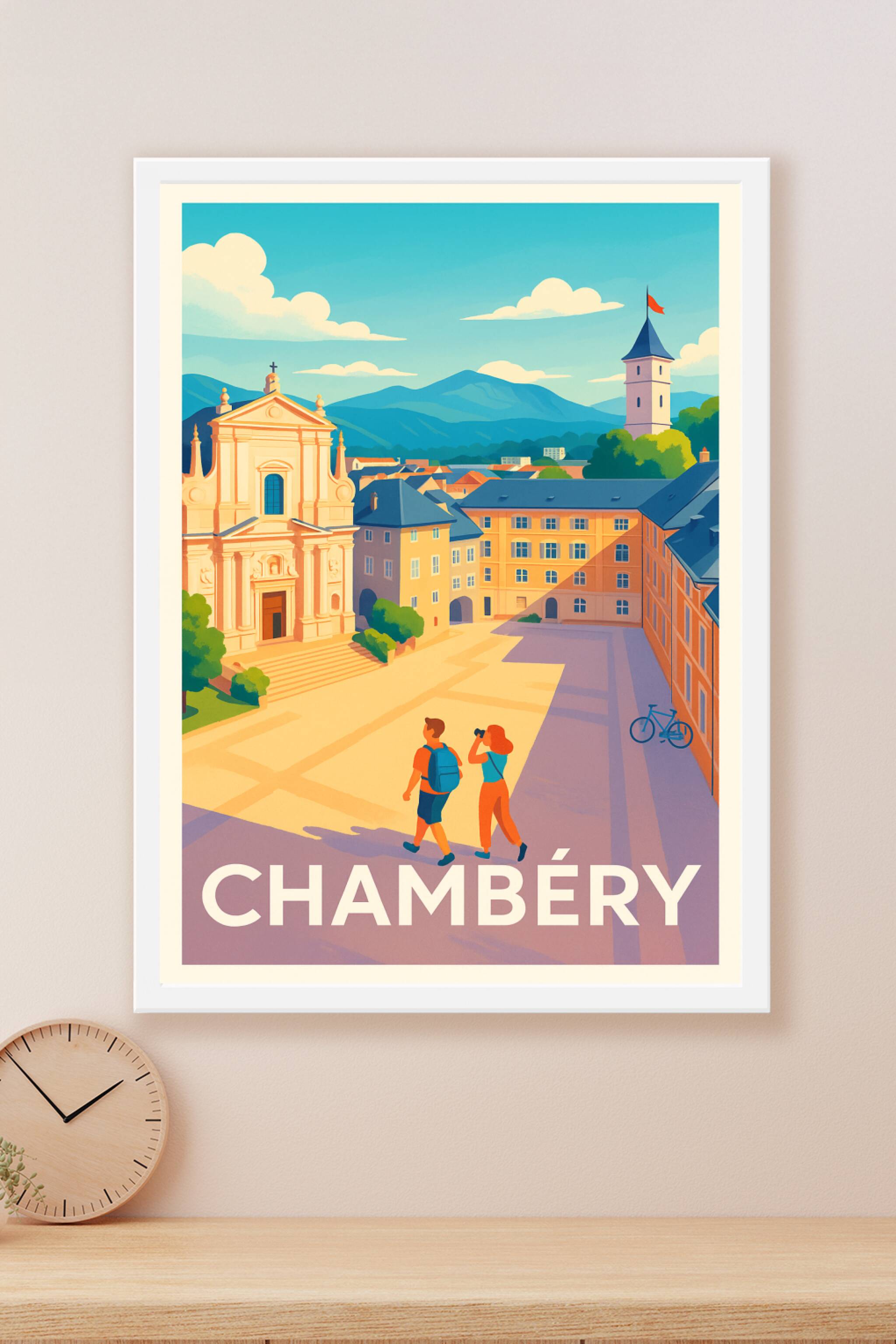 Découvrez tout le charme historique et architectural de Chambéry à travers cette affiche au style rétro illustré avec des couleurs chaudes et lumin...
