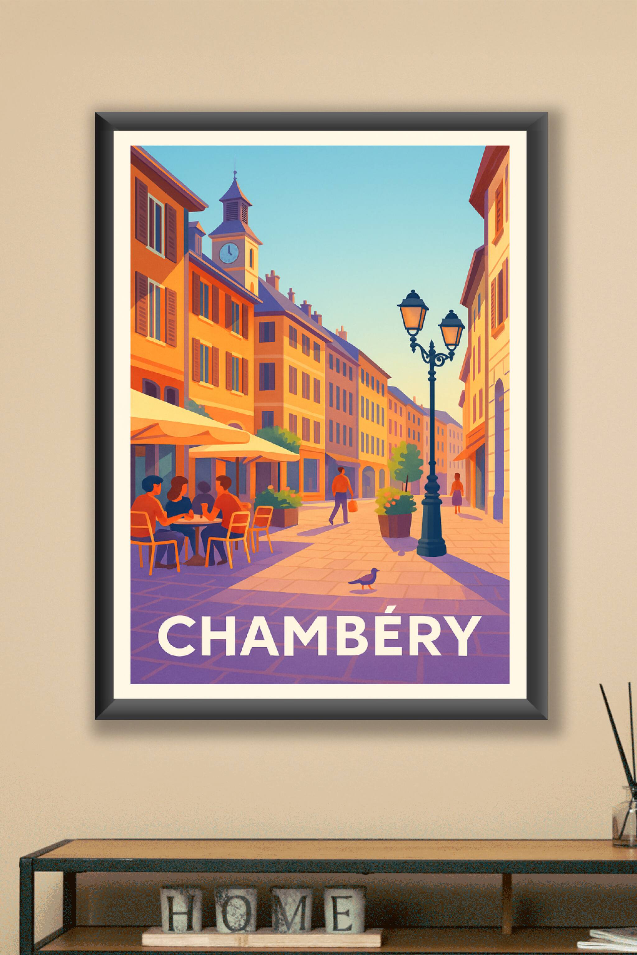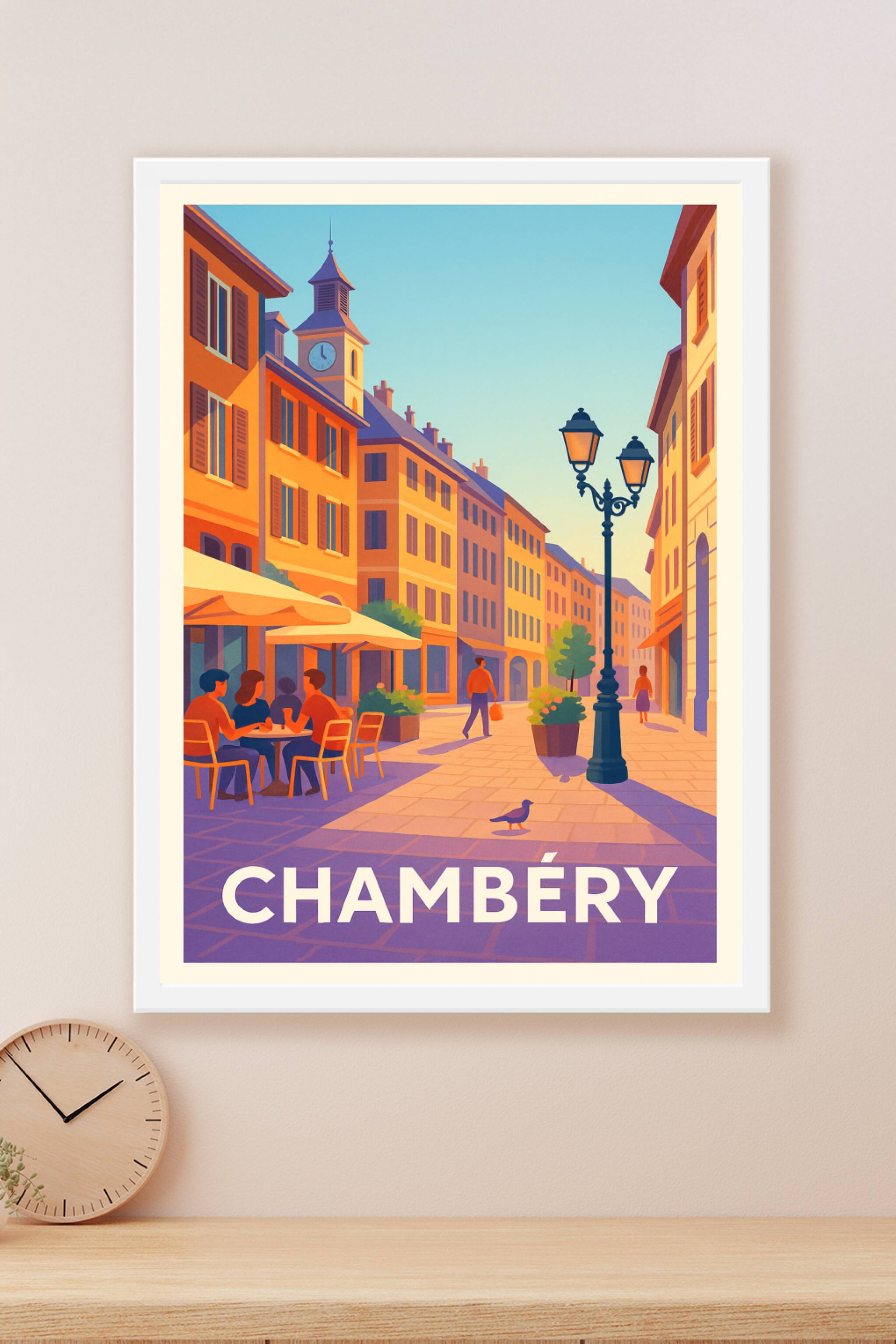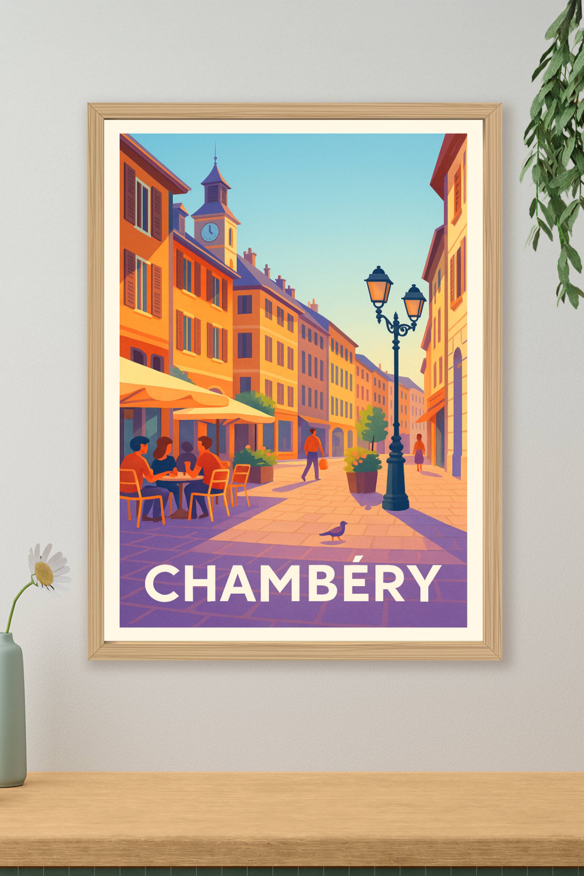 Découvrez l'atmosphère chaleureuse et typique des ruelles de Chambéry à travers cette affiche illustrée au style vintage moderne. L'illustration me...