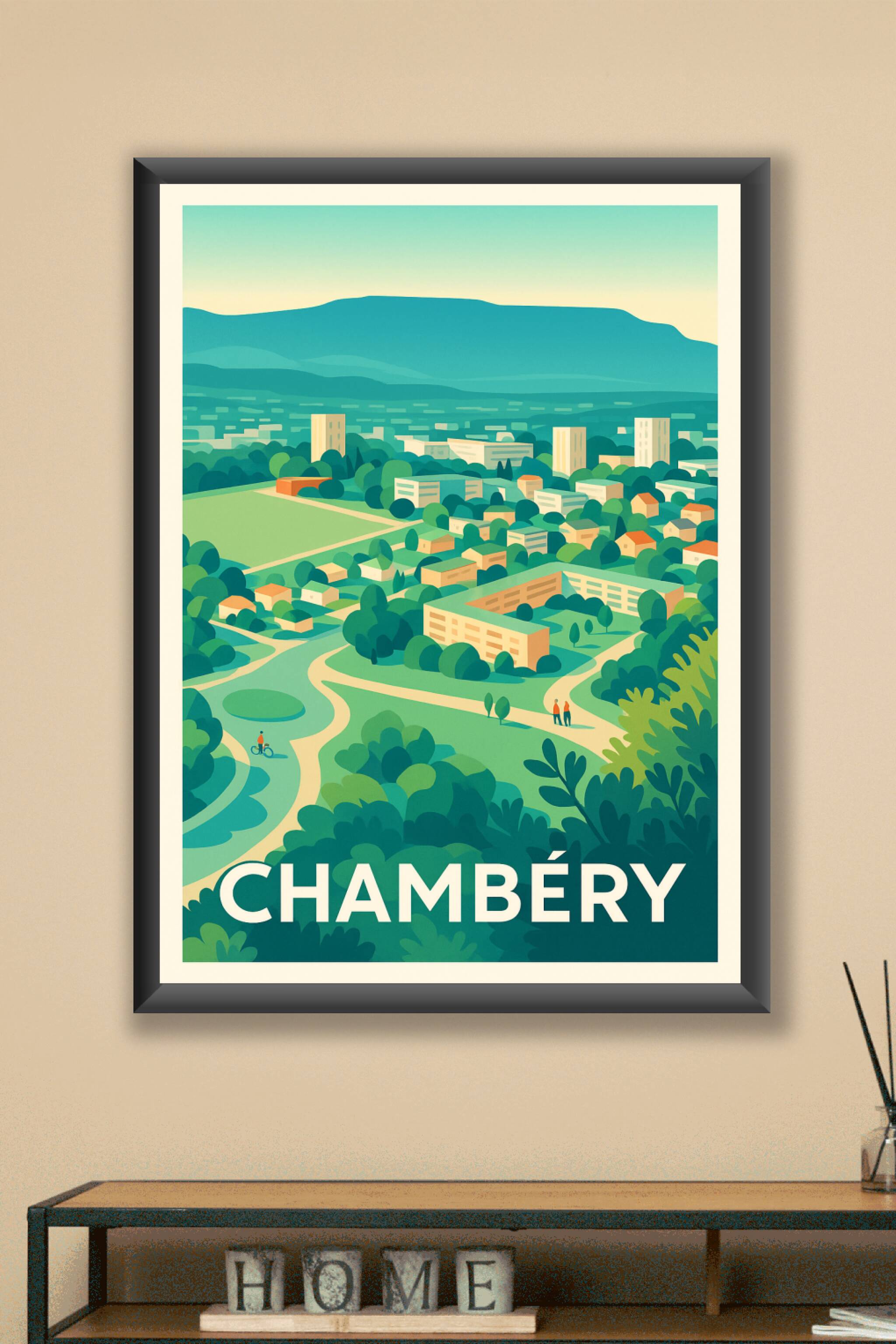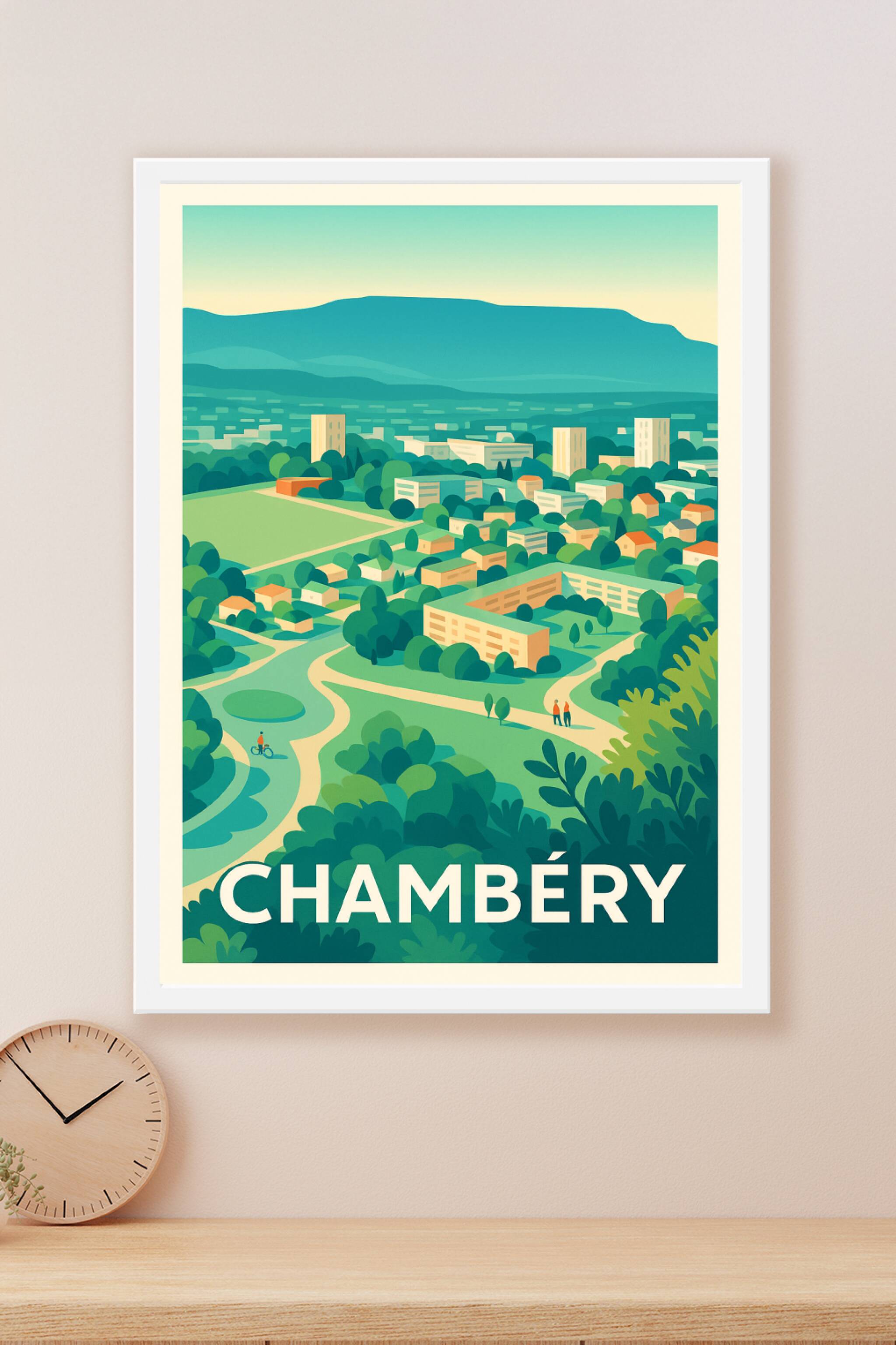 Découvrez l'harmonie entre nature et urbanisme avec cette affiche représentant Chambéry, nichée au cœur des montagnes. Le poster offre une perspect...