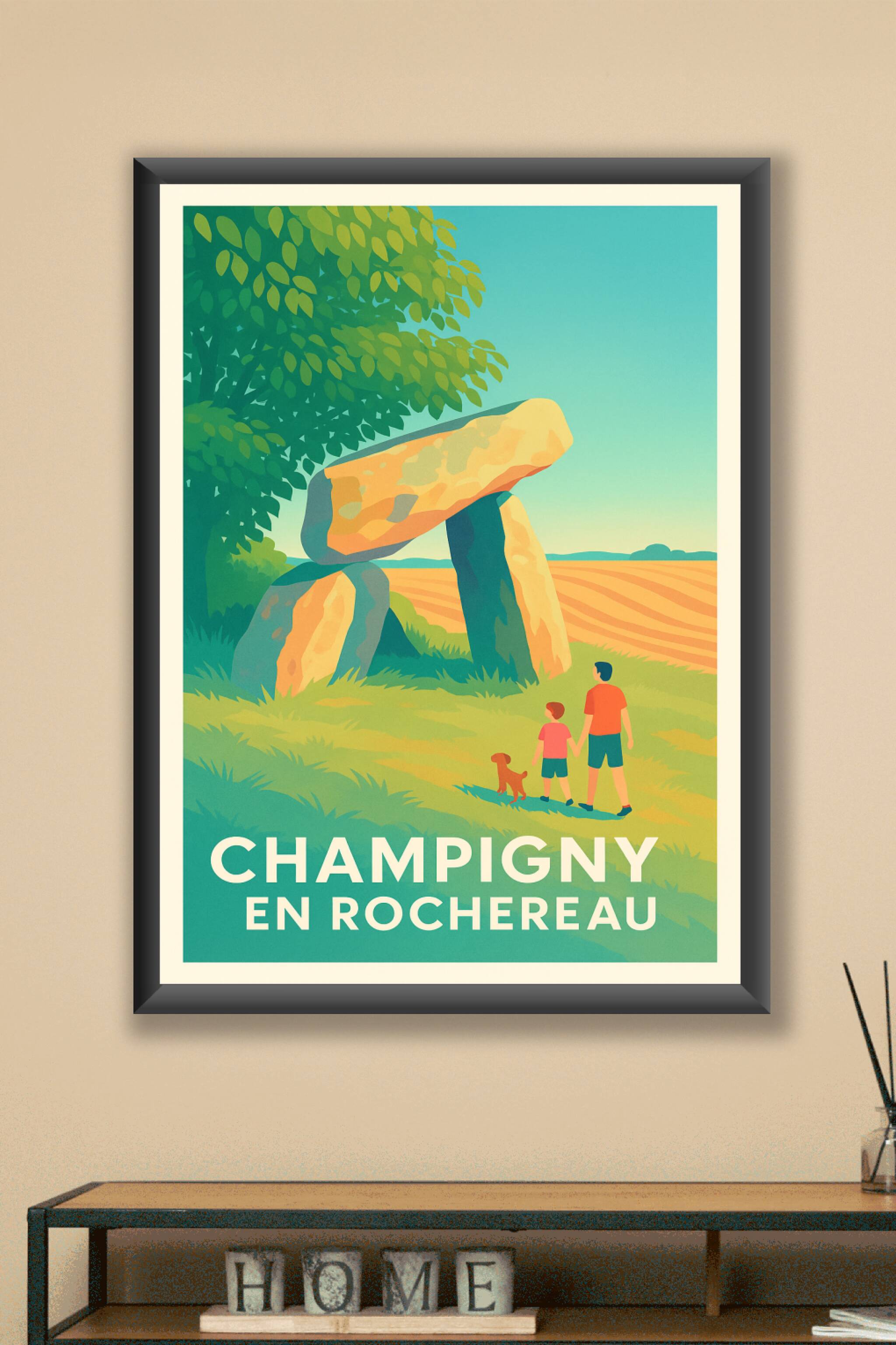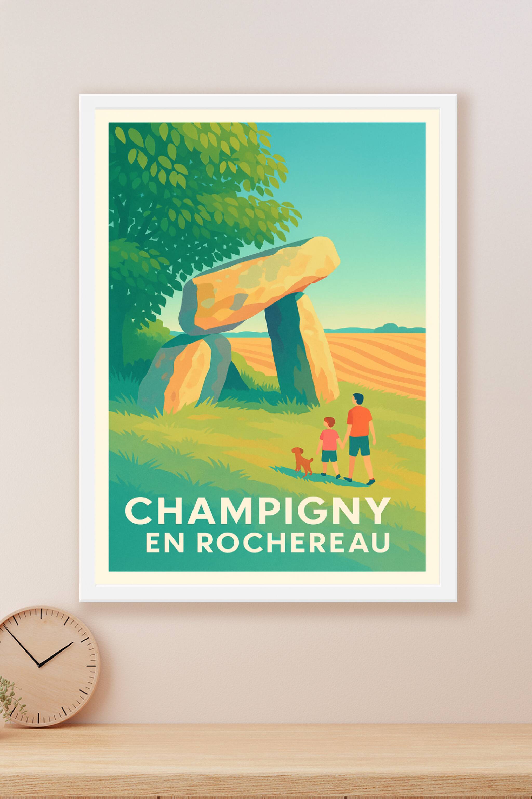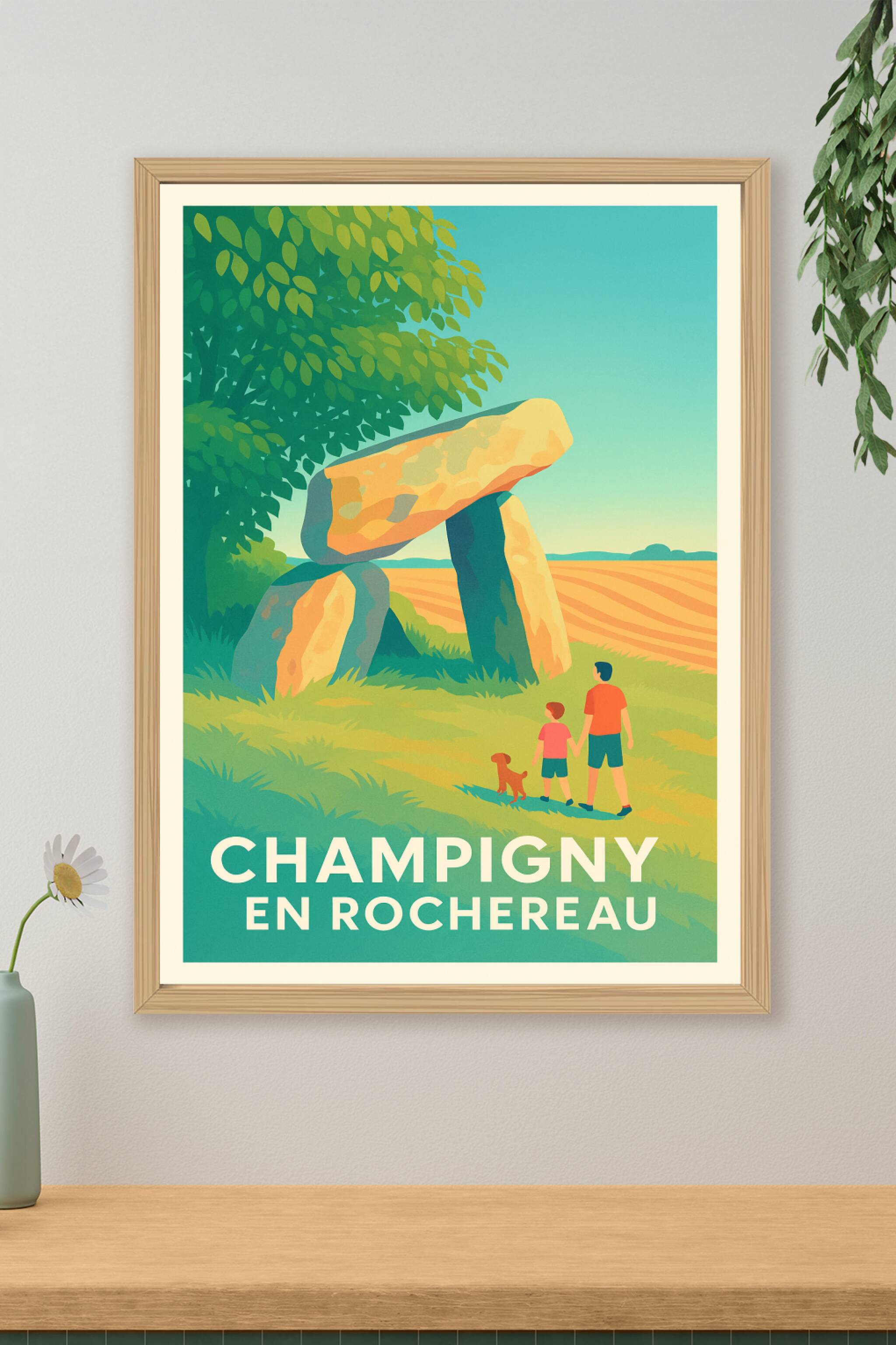 Découvrez la beauté et le mystère de Champigny en Rochereau avec cette affiche illustrée mettant en scène un monument mégalithique emblématique au ...