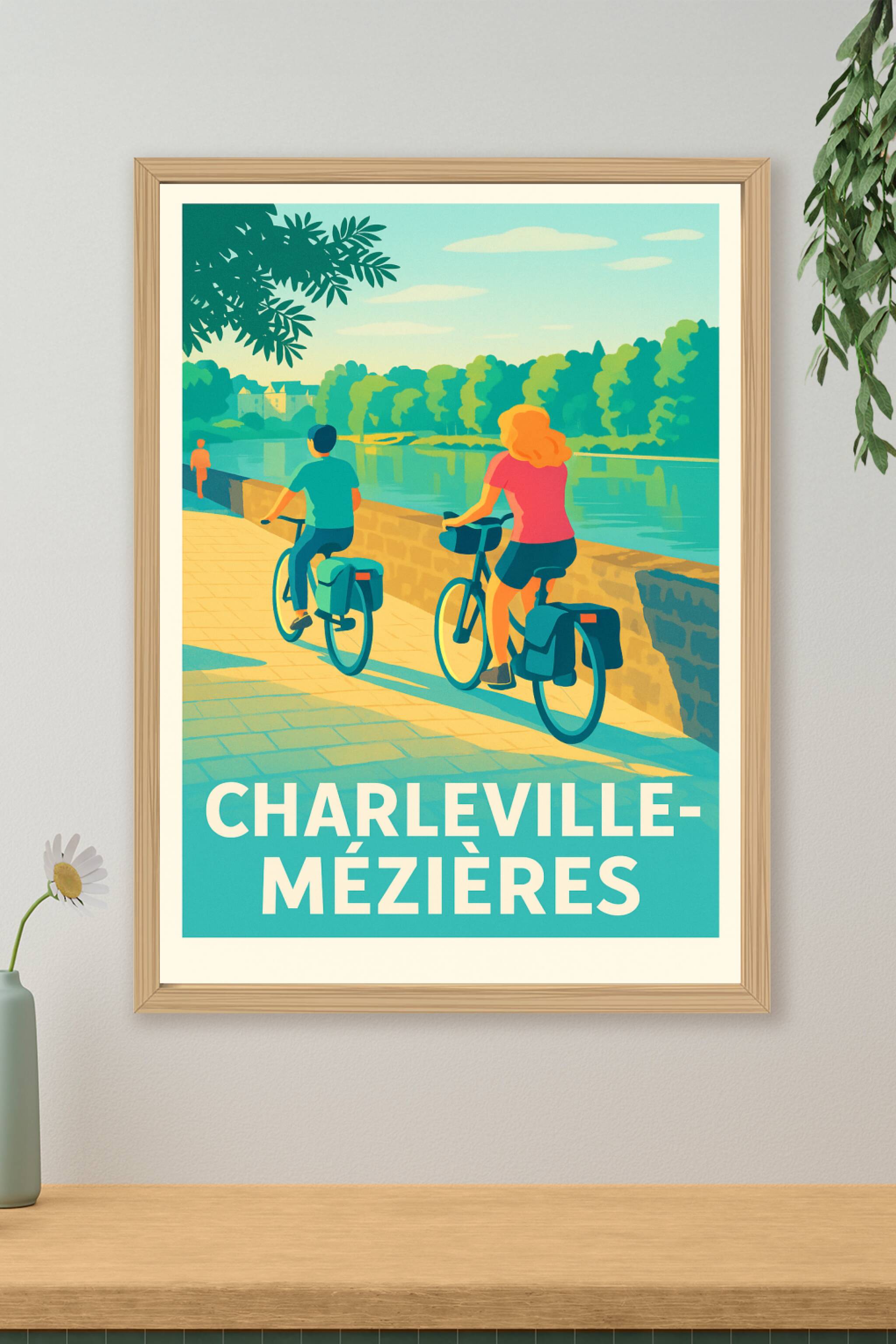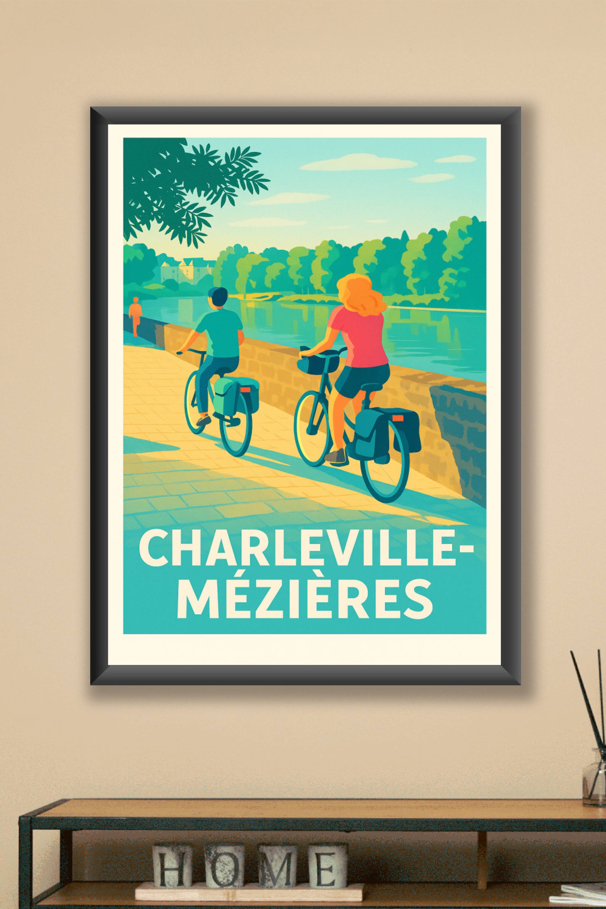 Découvrez la douceur de vivre de Charleville-Mézières à travers cette affiche vintage réinventée, qui met en scène une balade à vélo le long d'une ...