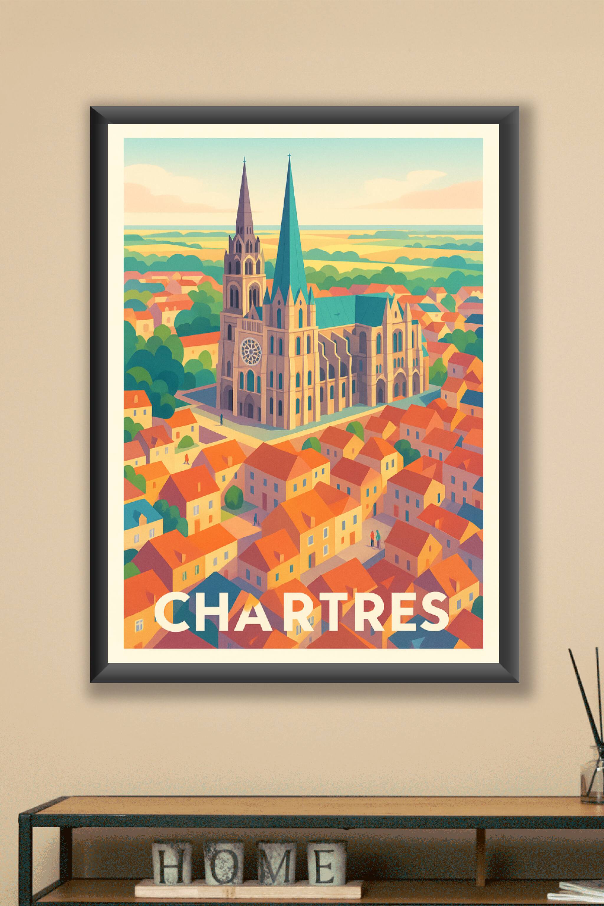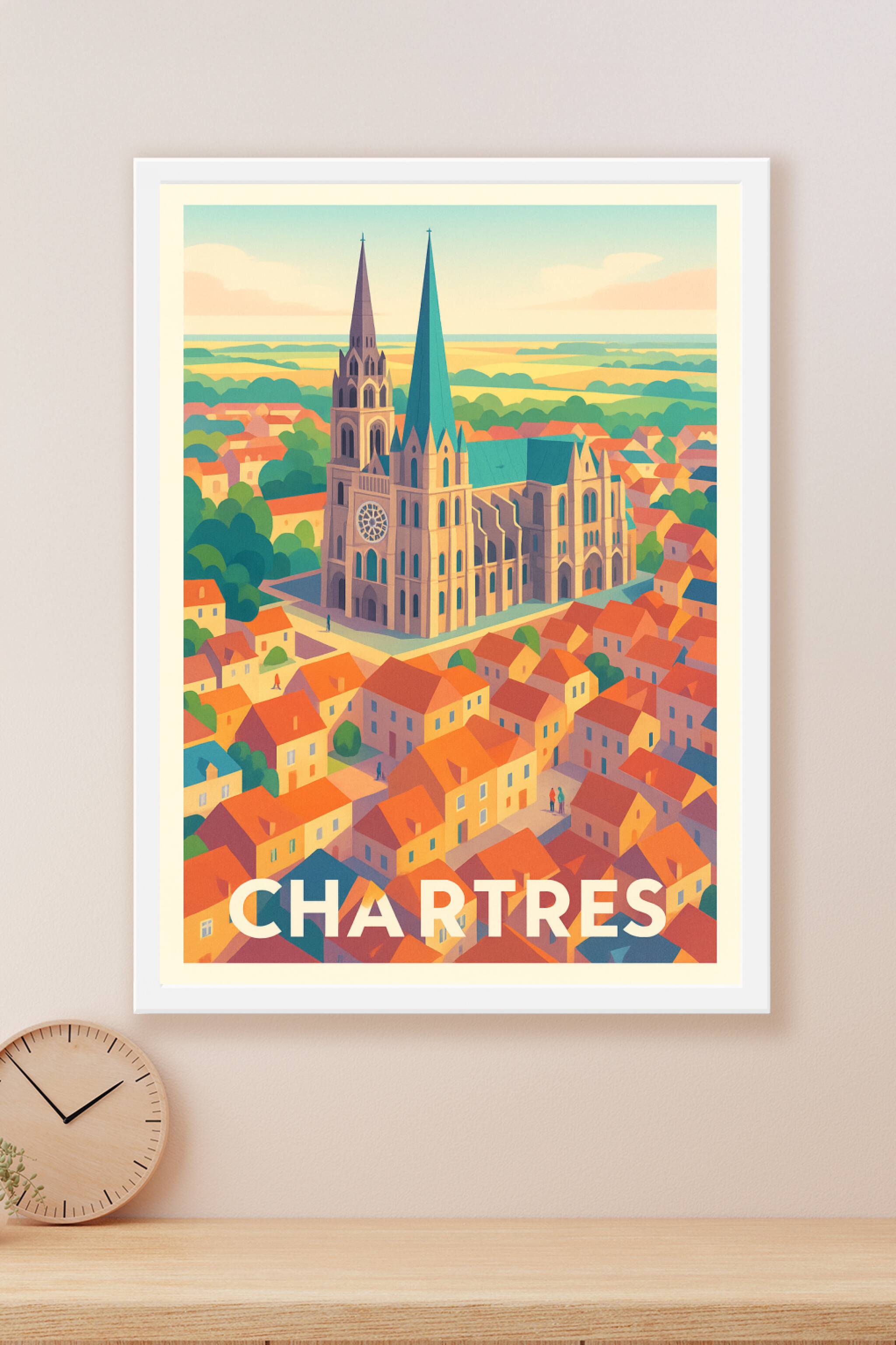 Découvrez la beauté intemporelle de Chartres avec cette affiche illustrée mettant à l'honneur la célèbre cathédrale et son environnement pittoresqu...