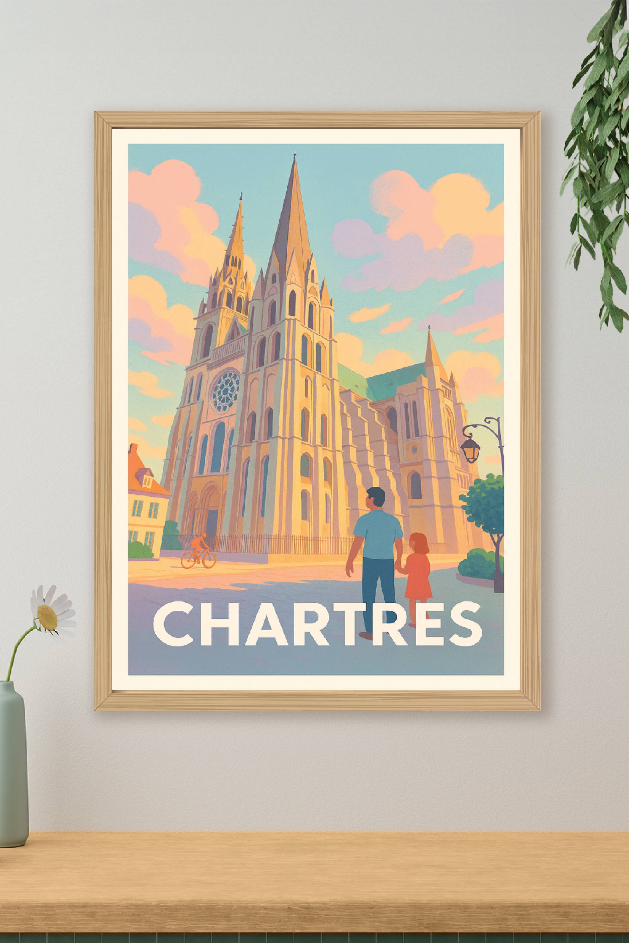 Découvrez la majestueuse cathédrale de Chartres sublimée dans cette affiche au style illustratif doux et coloré. Ce poster met en lumière l'archite...