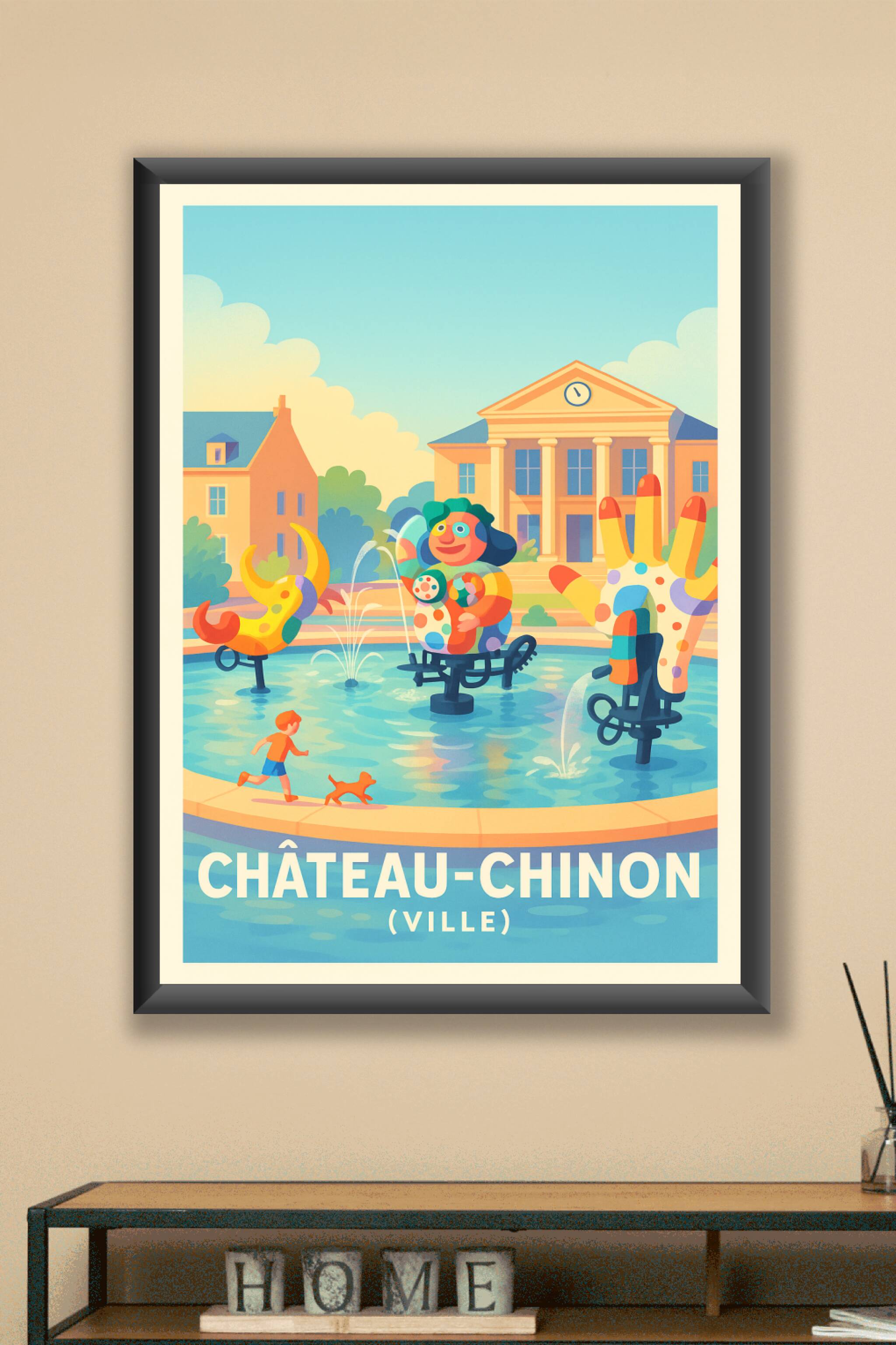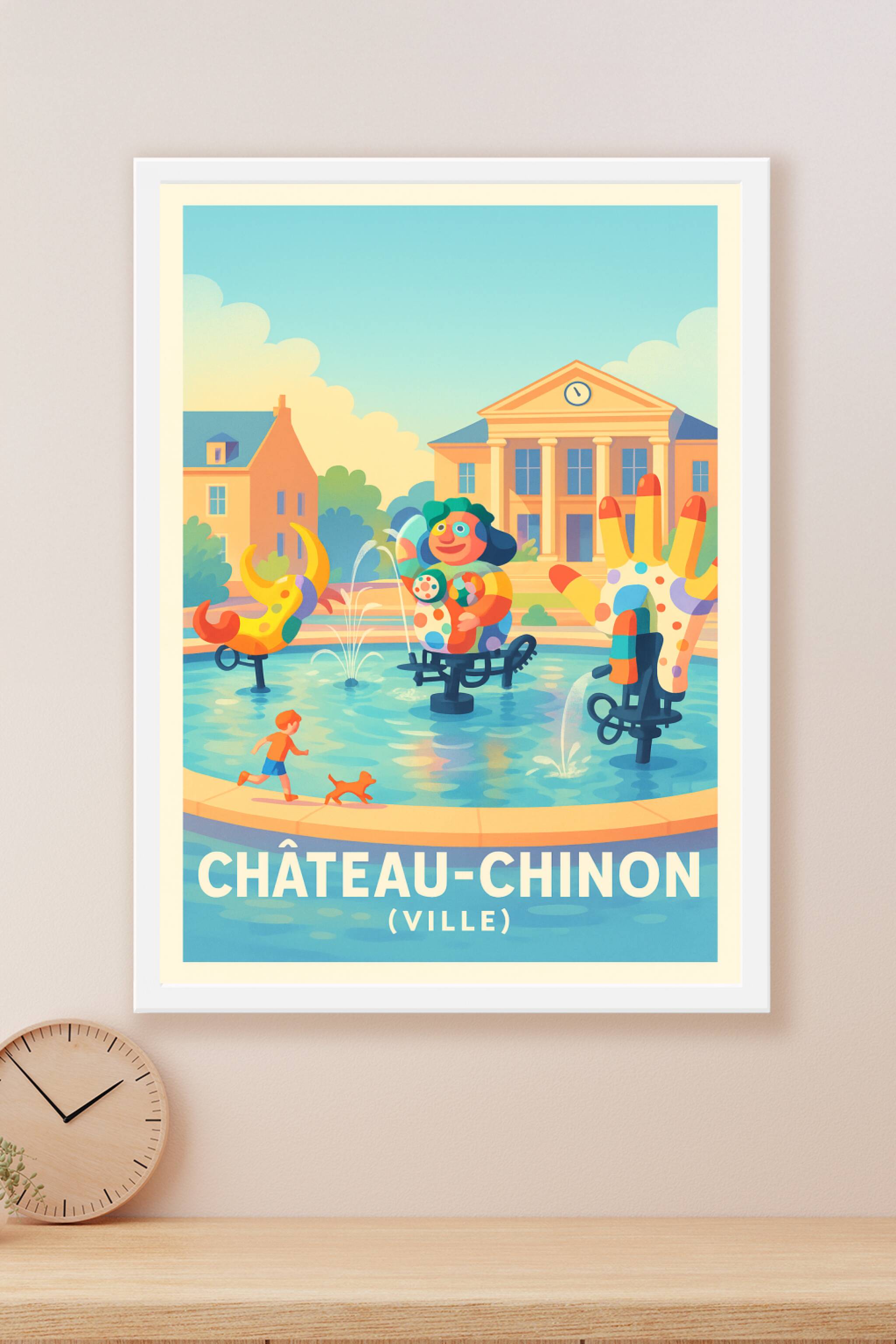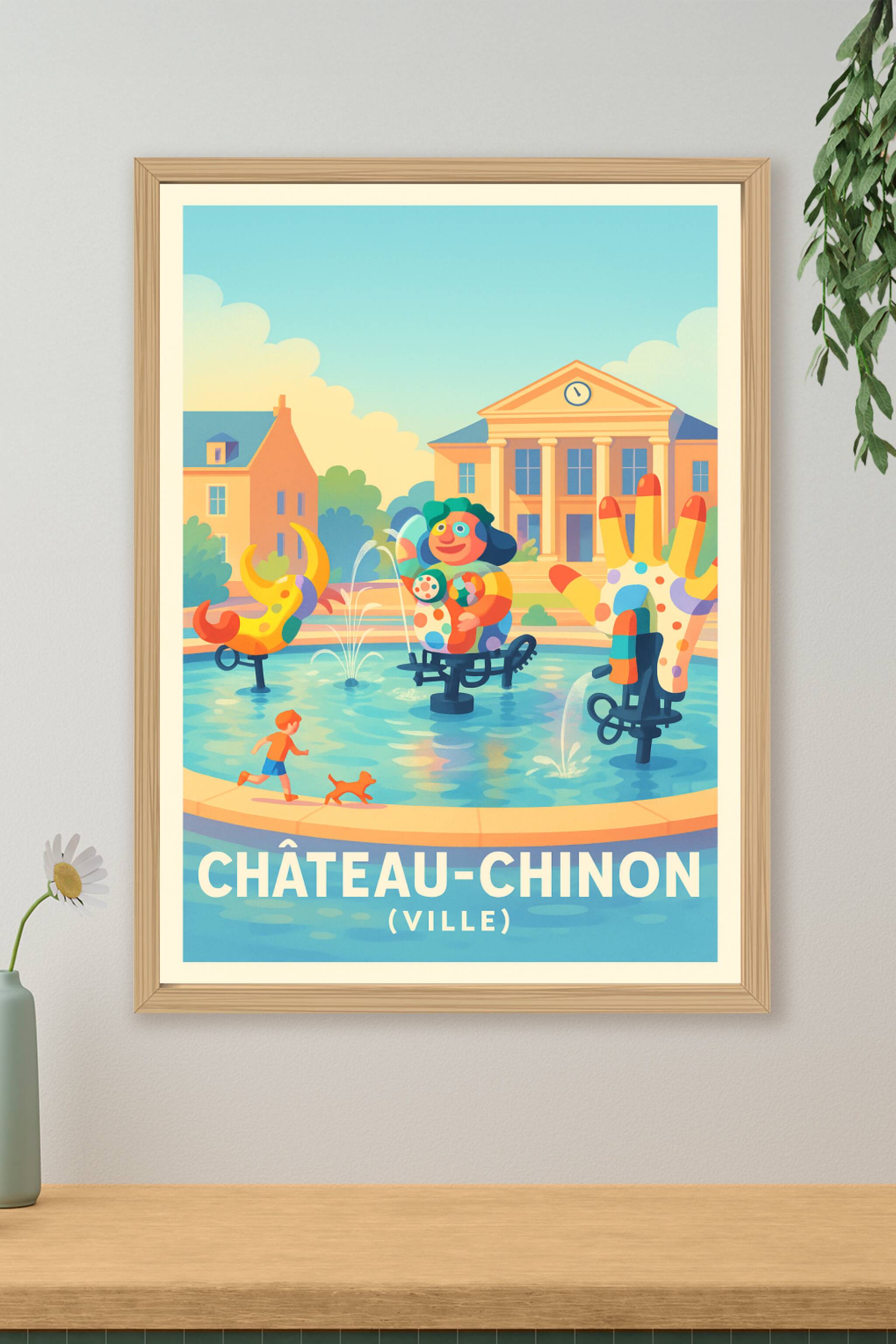Découvrez l'animation colorée de Château-Chinon avec ce poster vibrant illustrant la célèbre fontaine aux sculptures ludiques, emblème de la ville....
