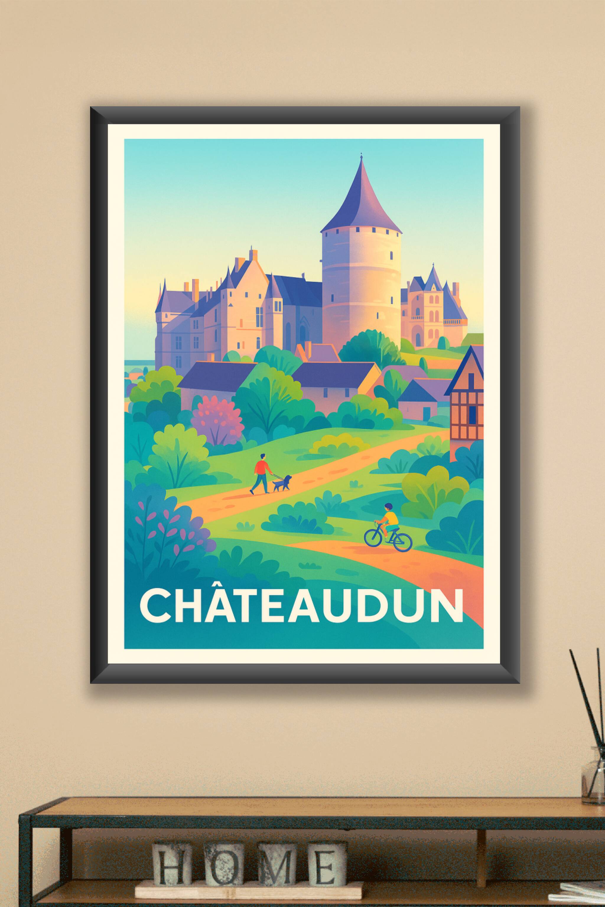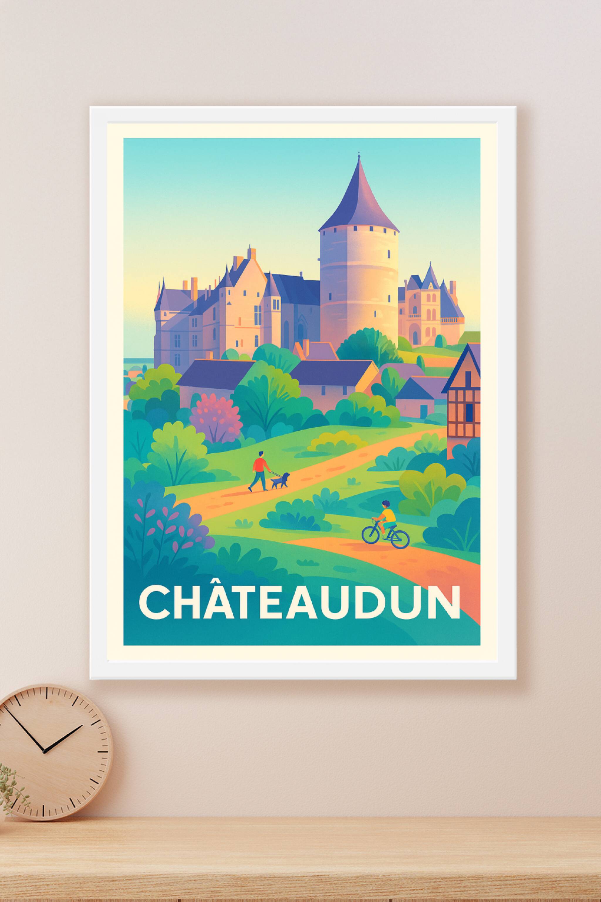 Découvrez l'élégance et l'histoire de Châteaudun à travers cette affiche illustrée aux couleurs douces et lumineuses mettant en valeur son célèbre ...