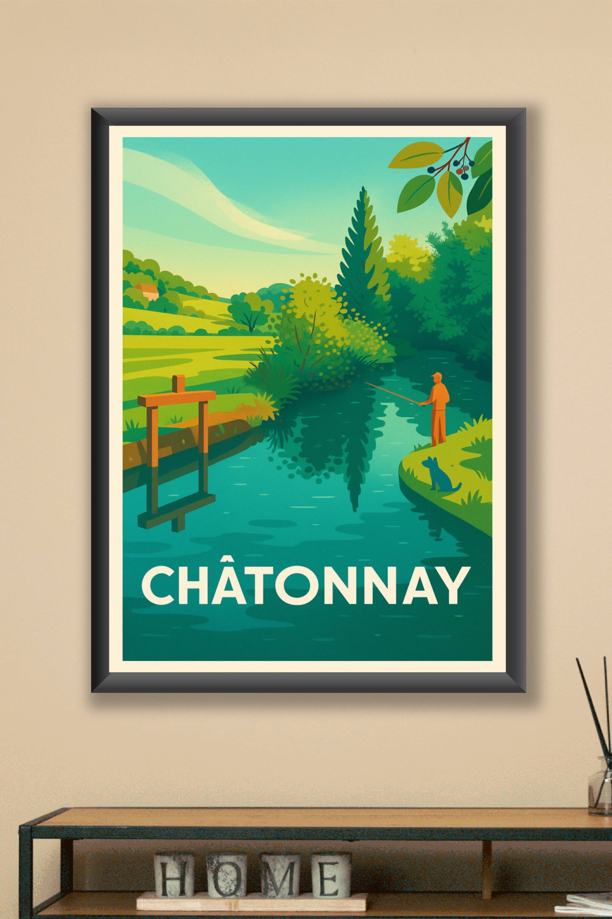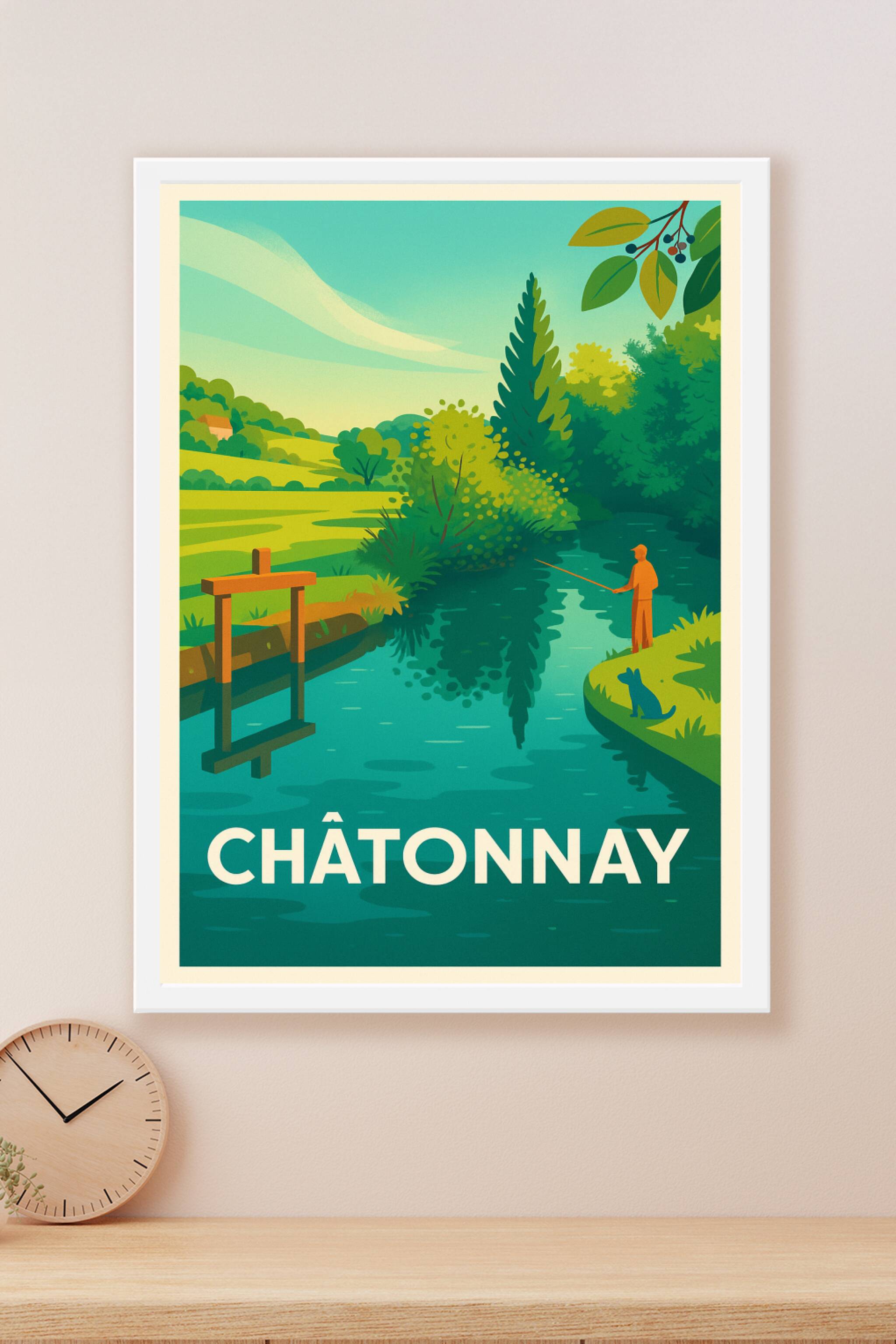 Découvrez la sérénité de la campagne avec cette magnifique affiche illustrée représentant un paisible moment de pêche au bord de la rivière à Châtonnay. Les couleurs douces et le style rétro invitent à la détente et à l'évasion naturelle. Ce poster est imprimé en tirage "Fine Art" sur papier 305g coton, garantissant une qualité d'impression exceptionnelle et une durabilité optimale. Disponible en formats A1 à A4, avec ou sans cadre, cette affiche apportera une touche de fraîcheur et de quiétude à votre décoration intérieure. Profitez d'un produit premium fabriqué en France, parfait pour embellir votre intérieur ou offrir un souvenir unique de Châtonnay.