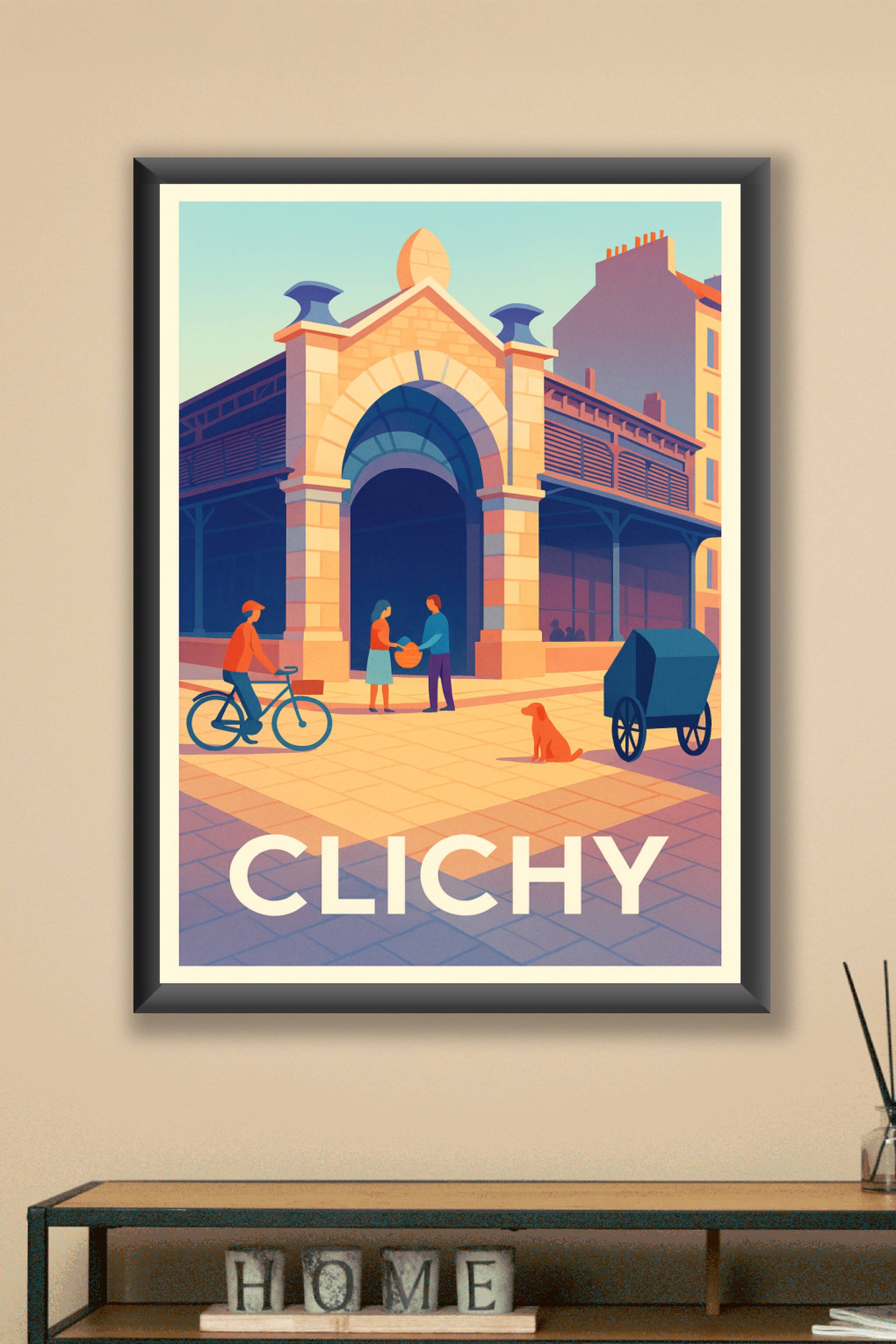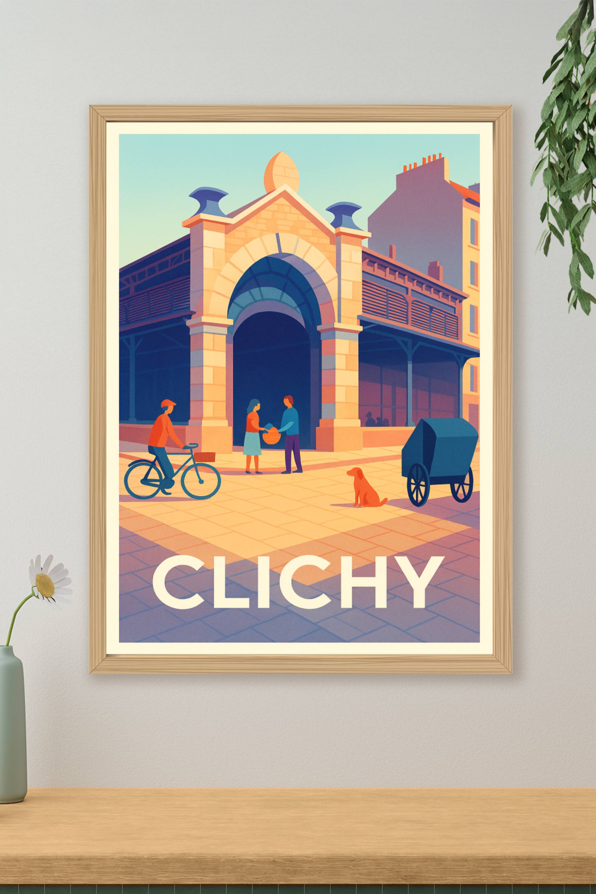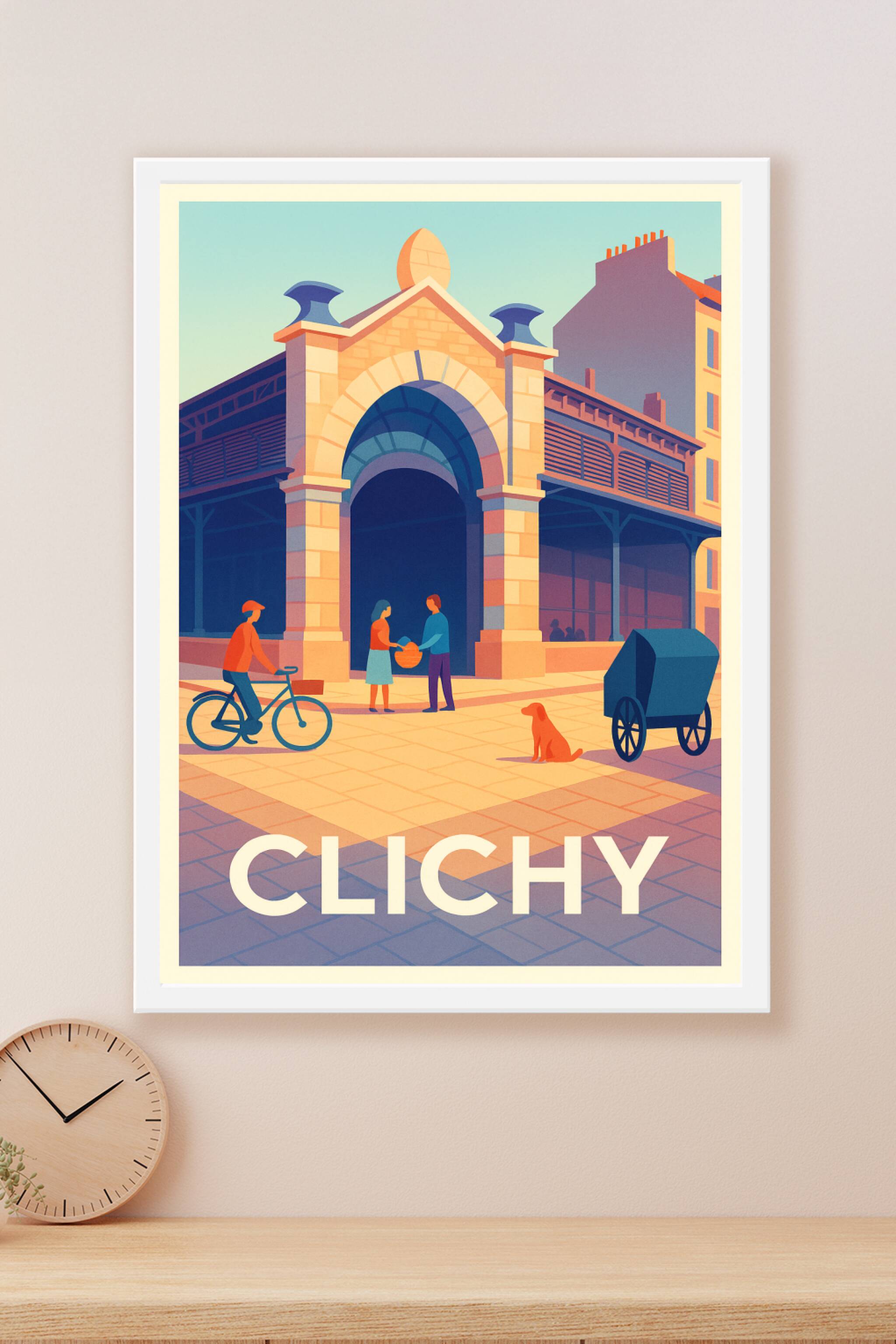 Découvrez l'atmosphère unique de Clichy à travers cette affiche illustrée qui capture un moment de vie paisible et coloré devant une architecture t...