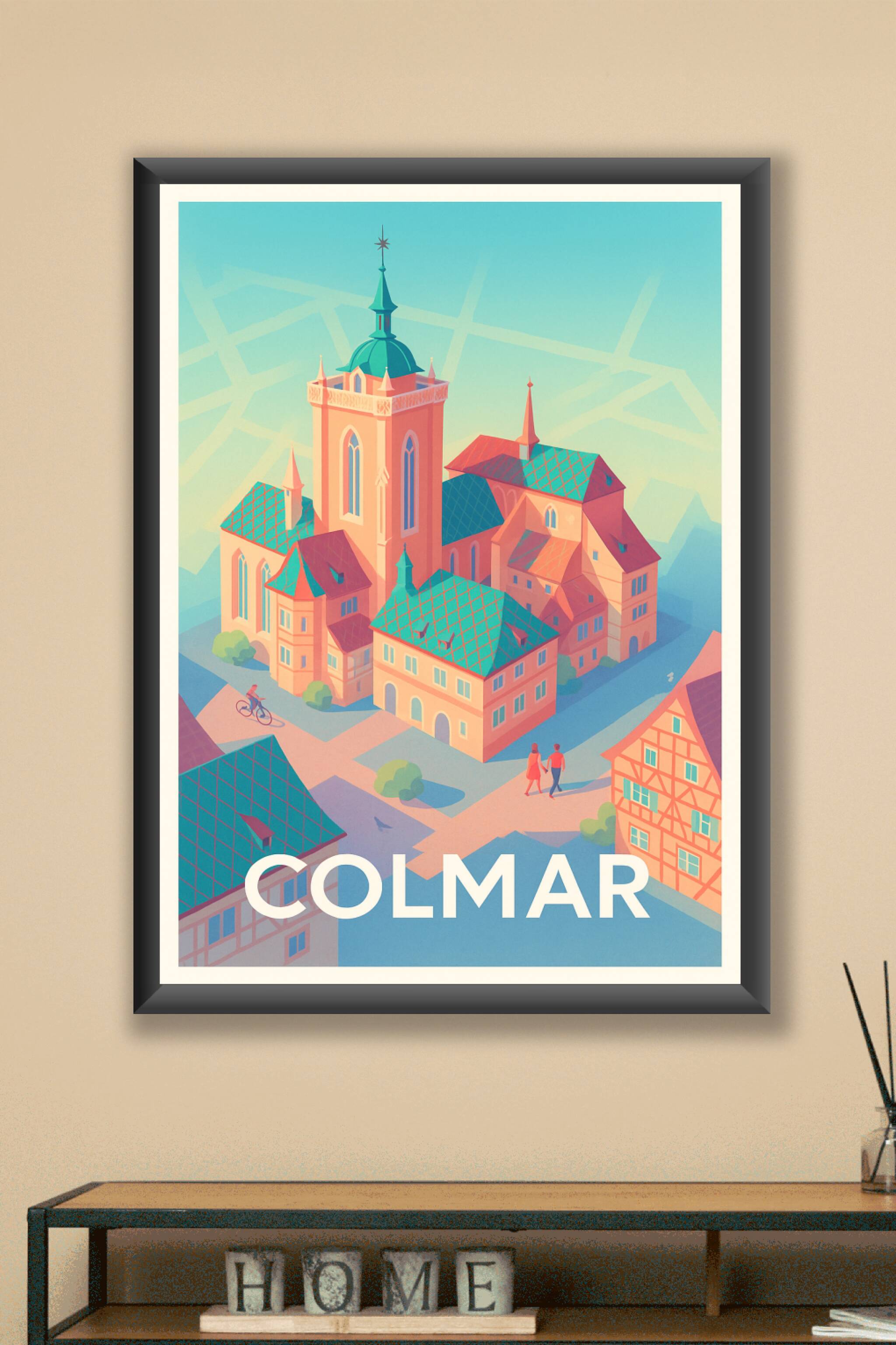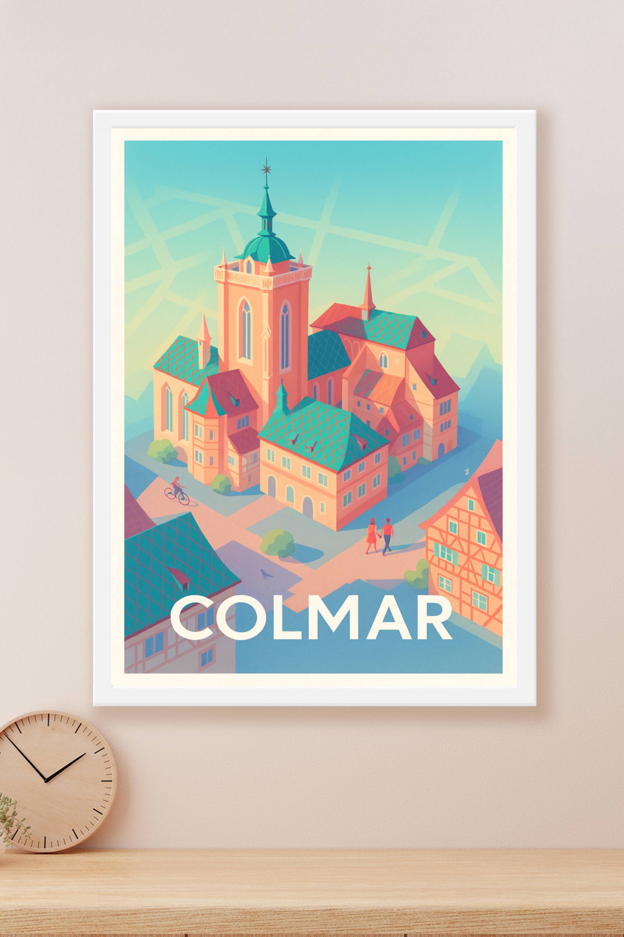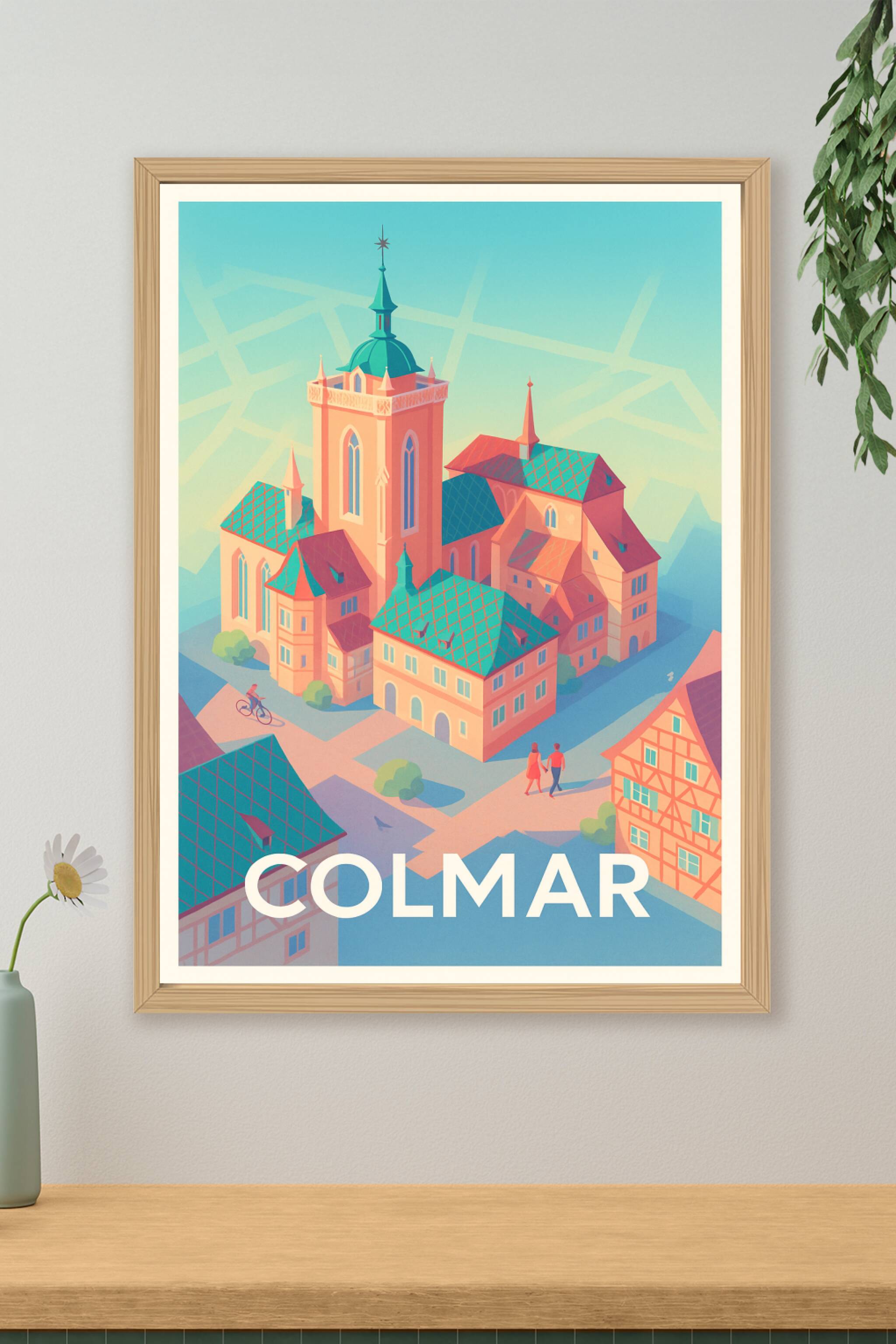 Découvrez l'élégance intemporelle de Colmar à travers cette affiche illustrée qui met en lumière ses maisons à colombages et sa célèbre architectur...