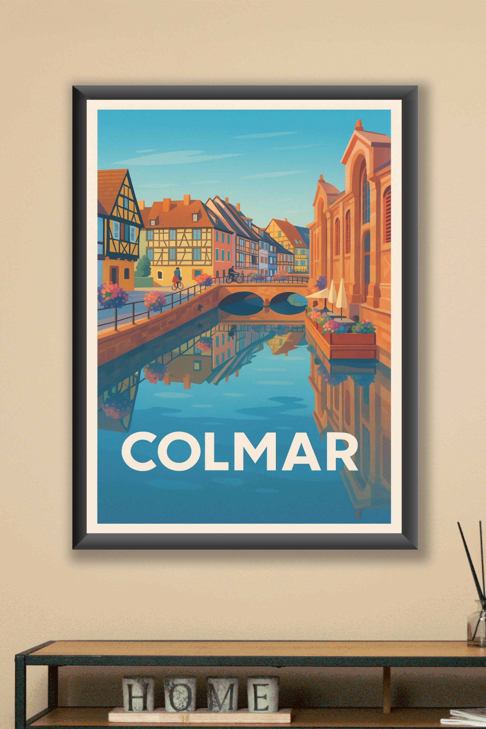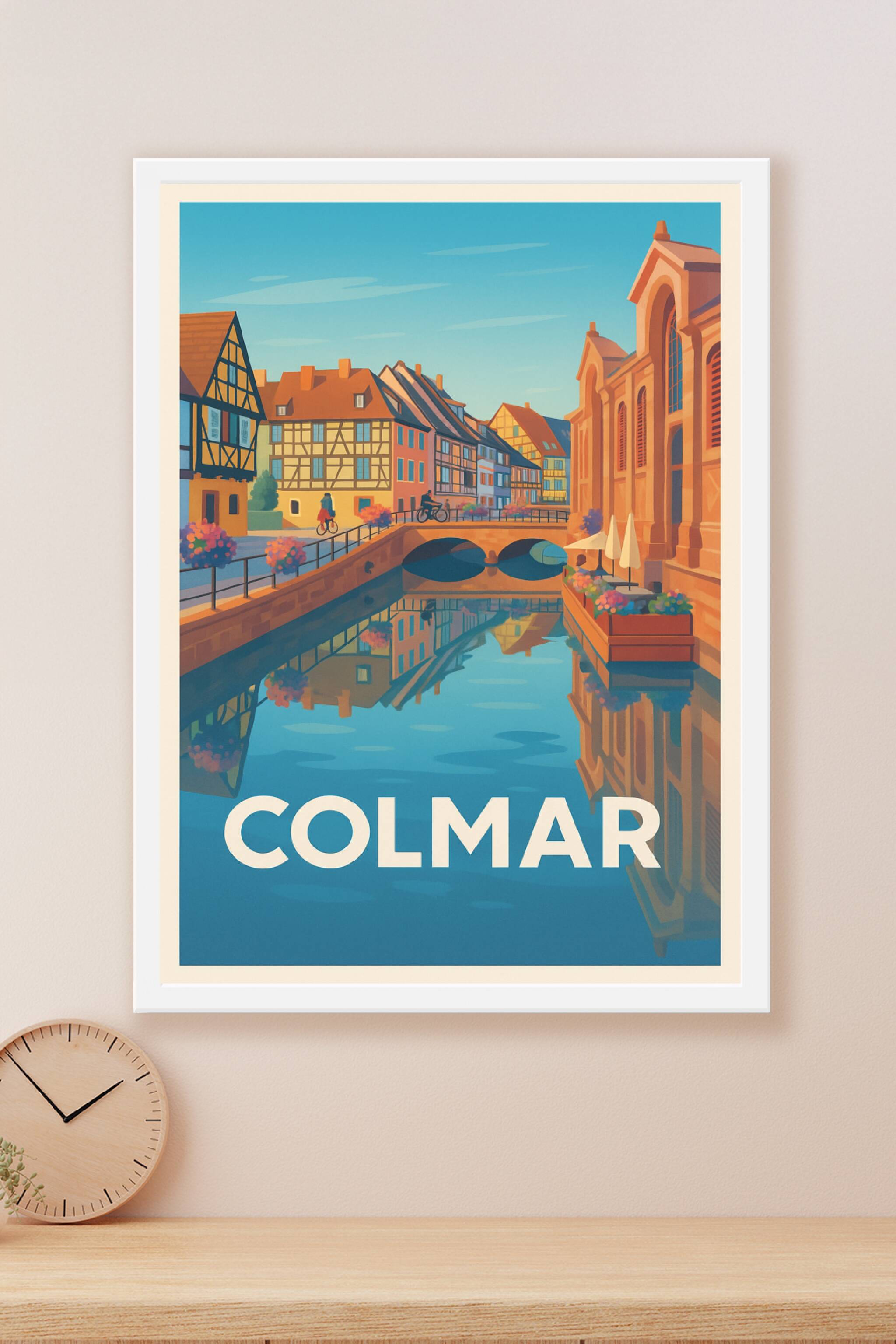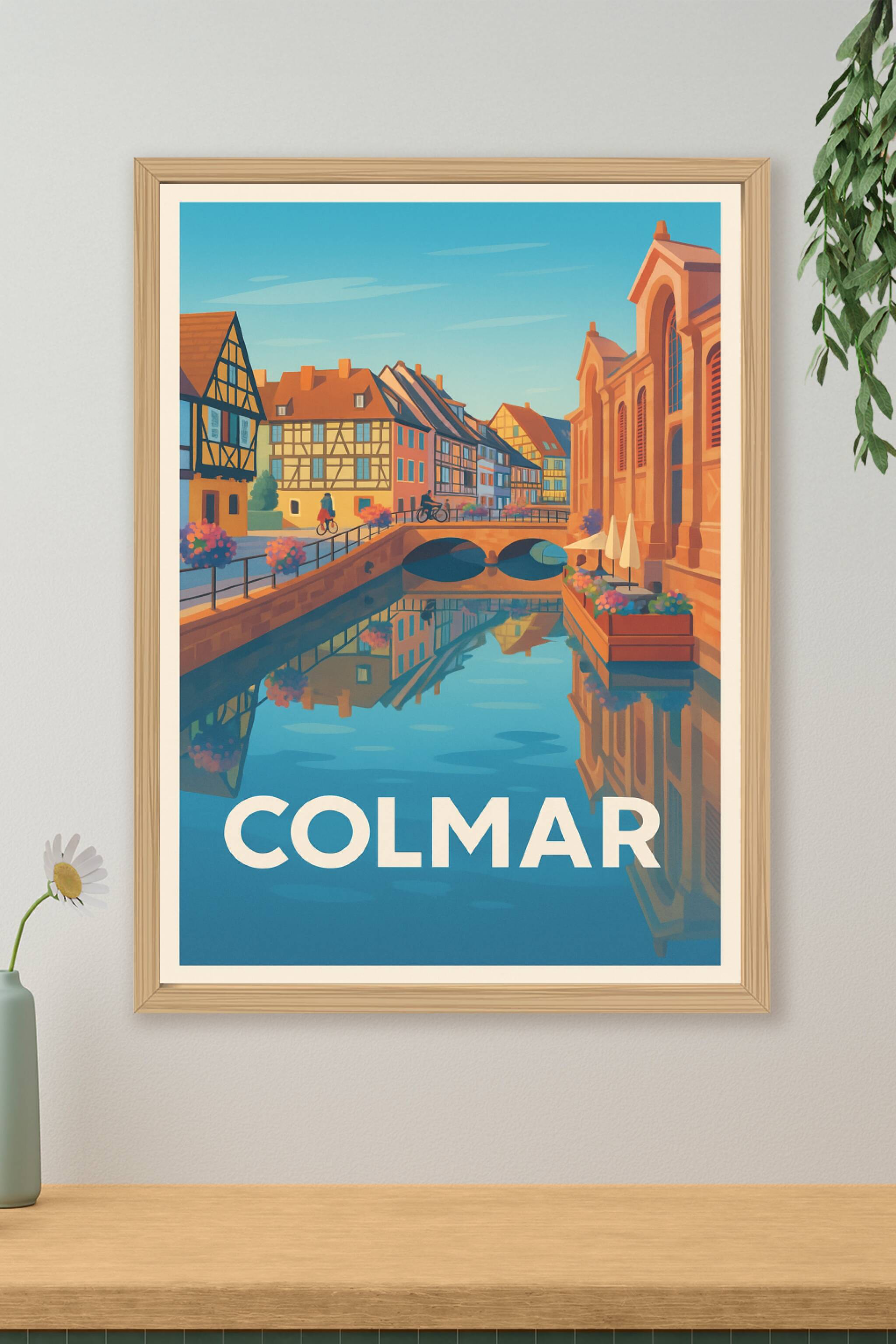 Découvrez l'atmosphère unique de Colmar avec cette affiche illustrée représentant ses célèbres maisons à colombages et ses canaux paisibles baignés...