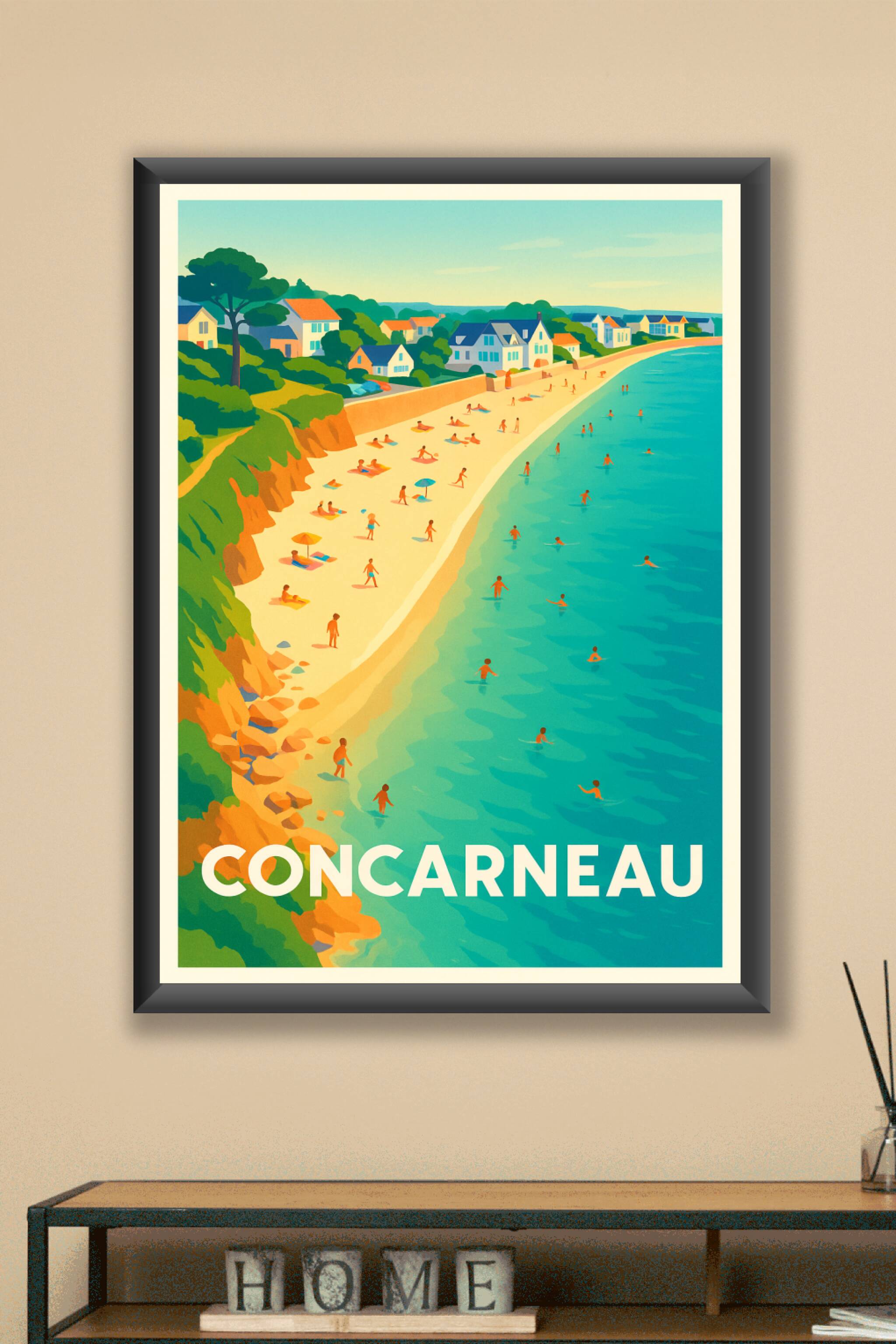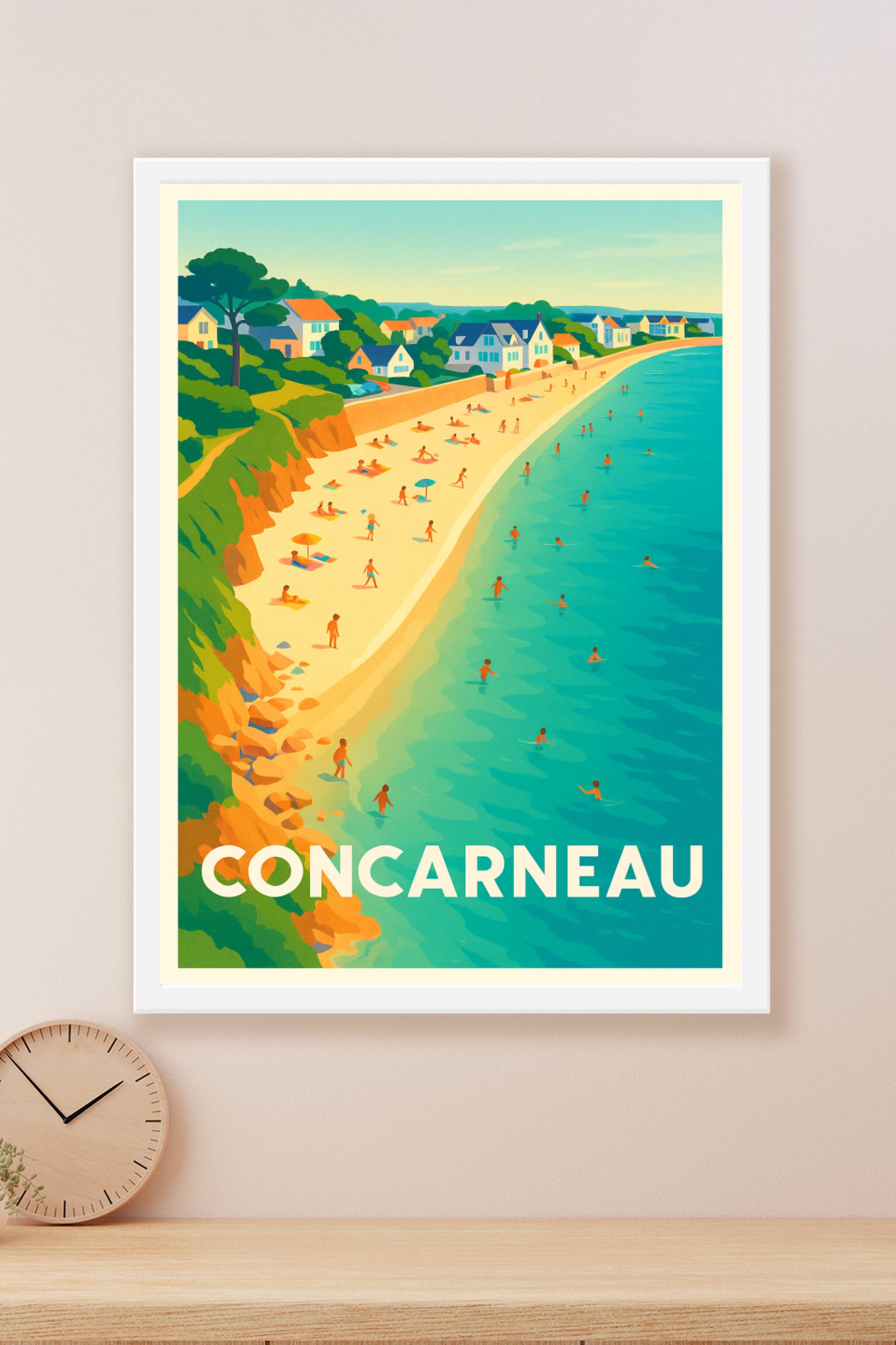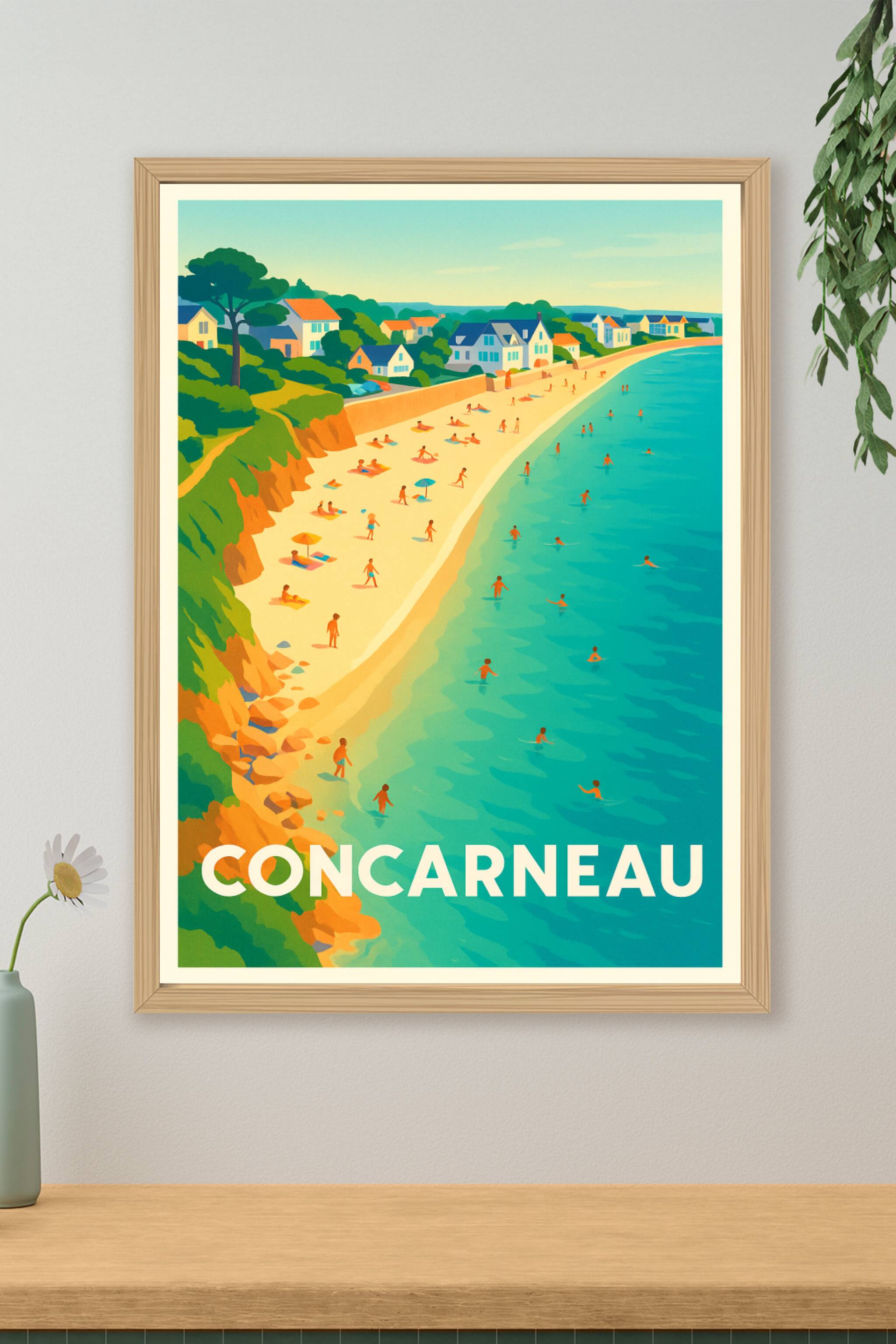 Découvrez la beauté paisible de Concarneau avec cette affiche vibrante qui capture l'atmosphère estivale de sa plage et ses maisons typiques en bor...