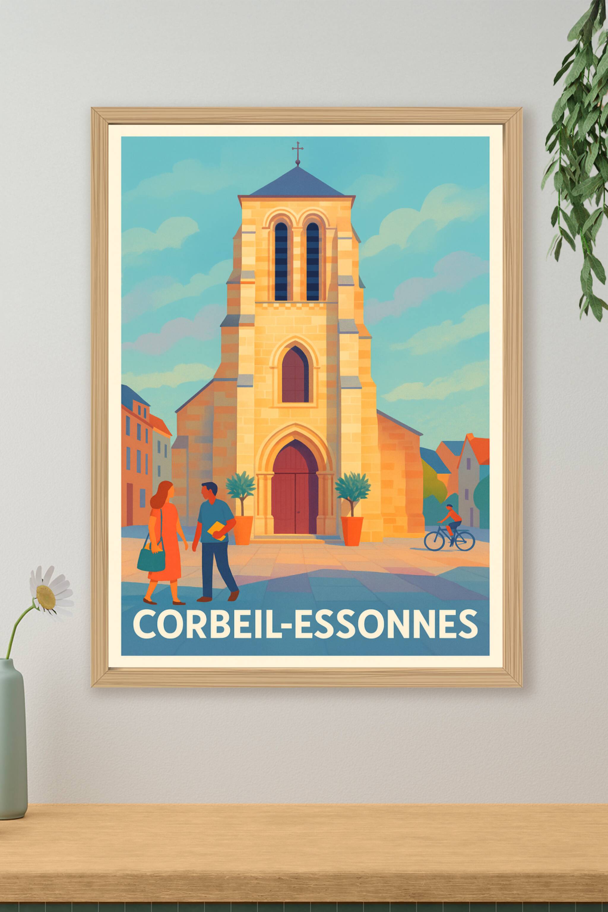 Découvrez cette magnifique affiche représentant l'église emblématique de Corbeil-Essonnes, capturée dans une illustration chaleureuse aux couleurs ...