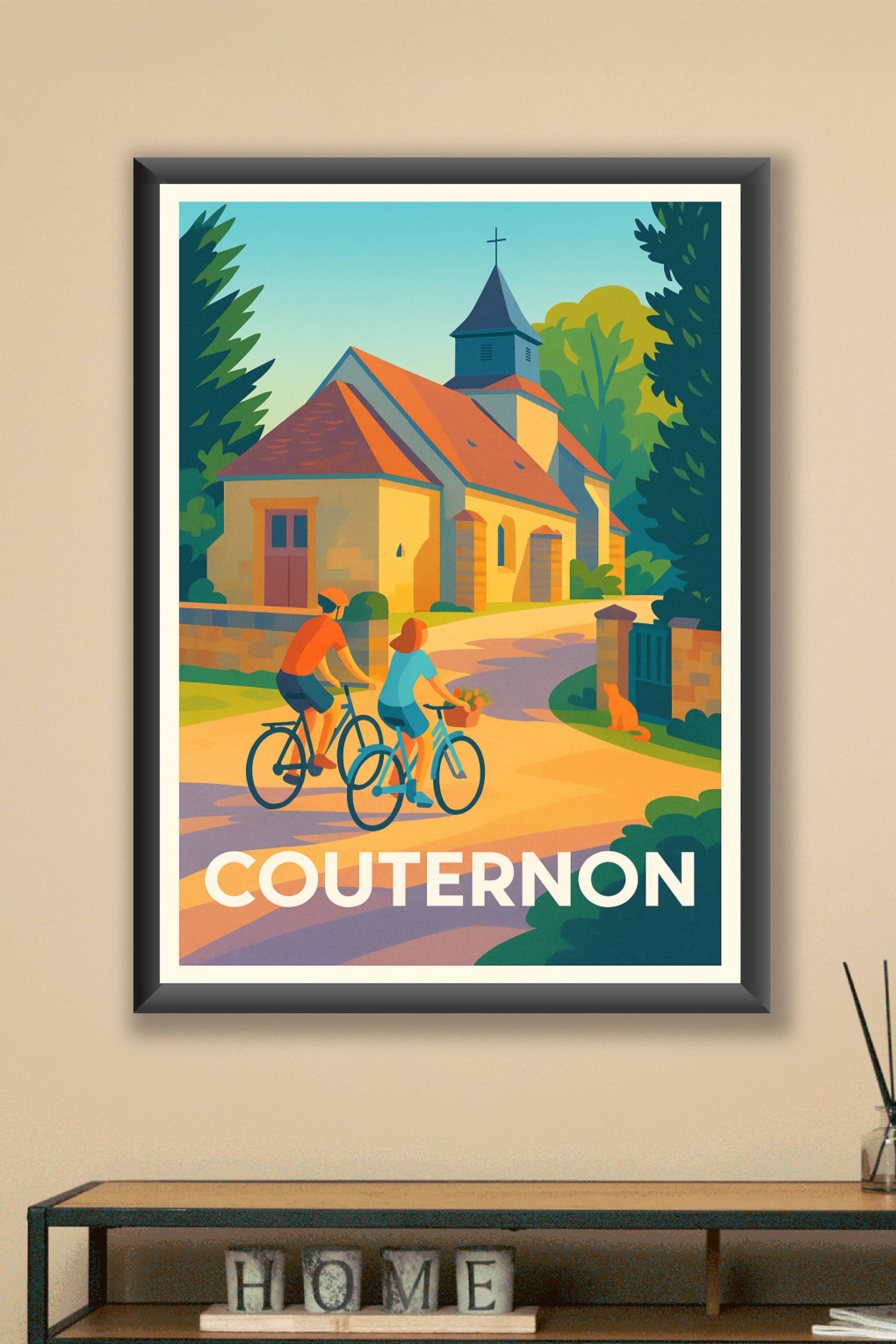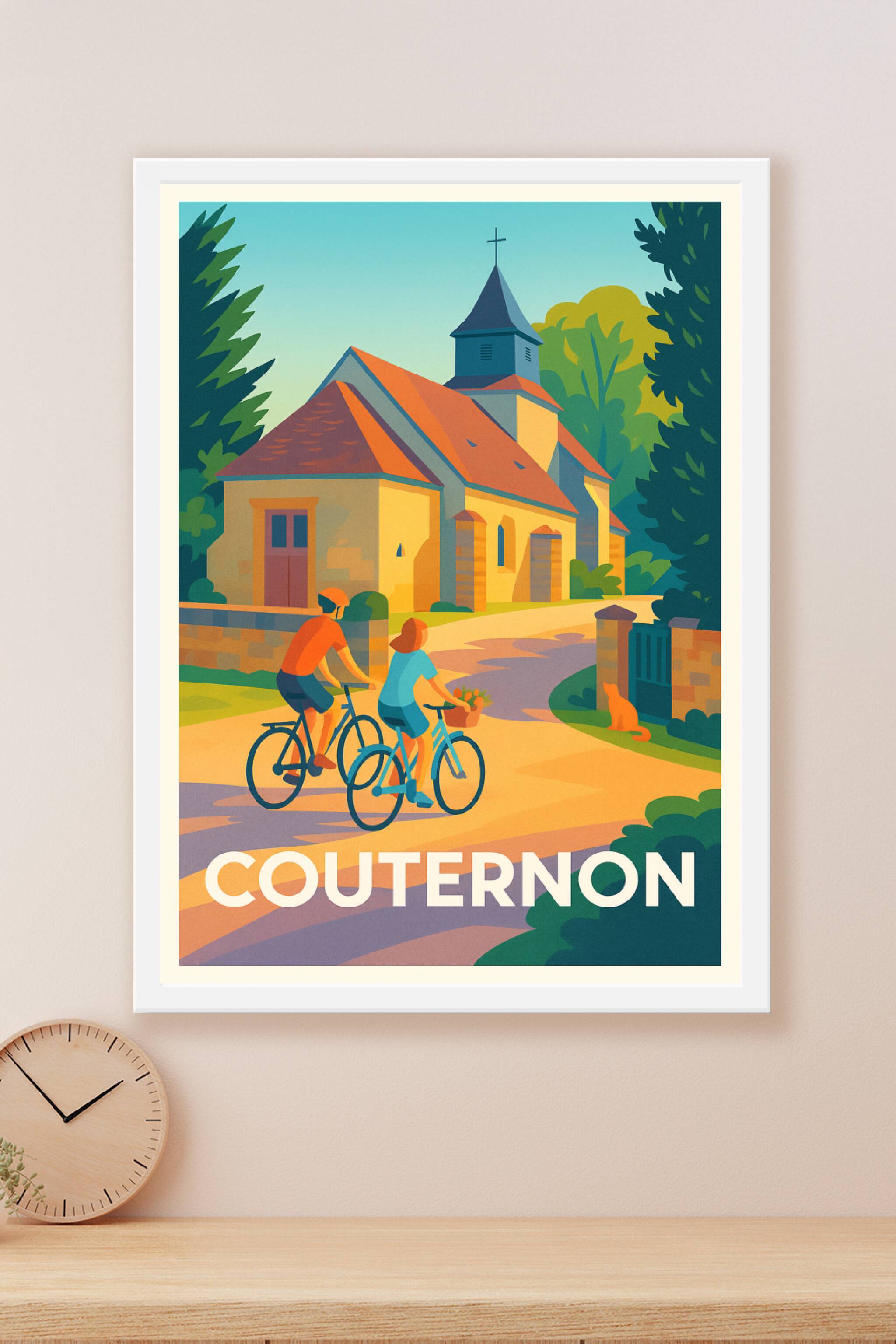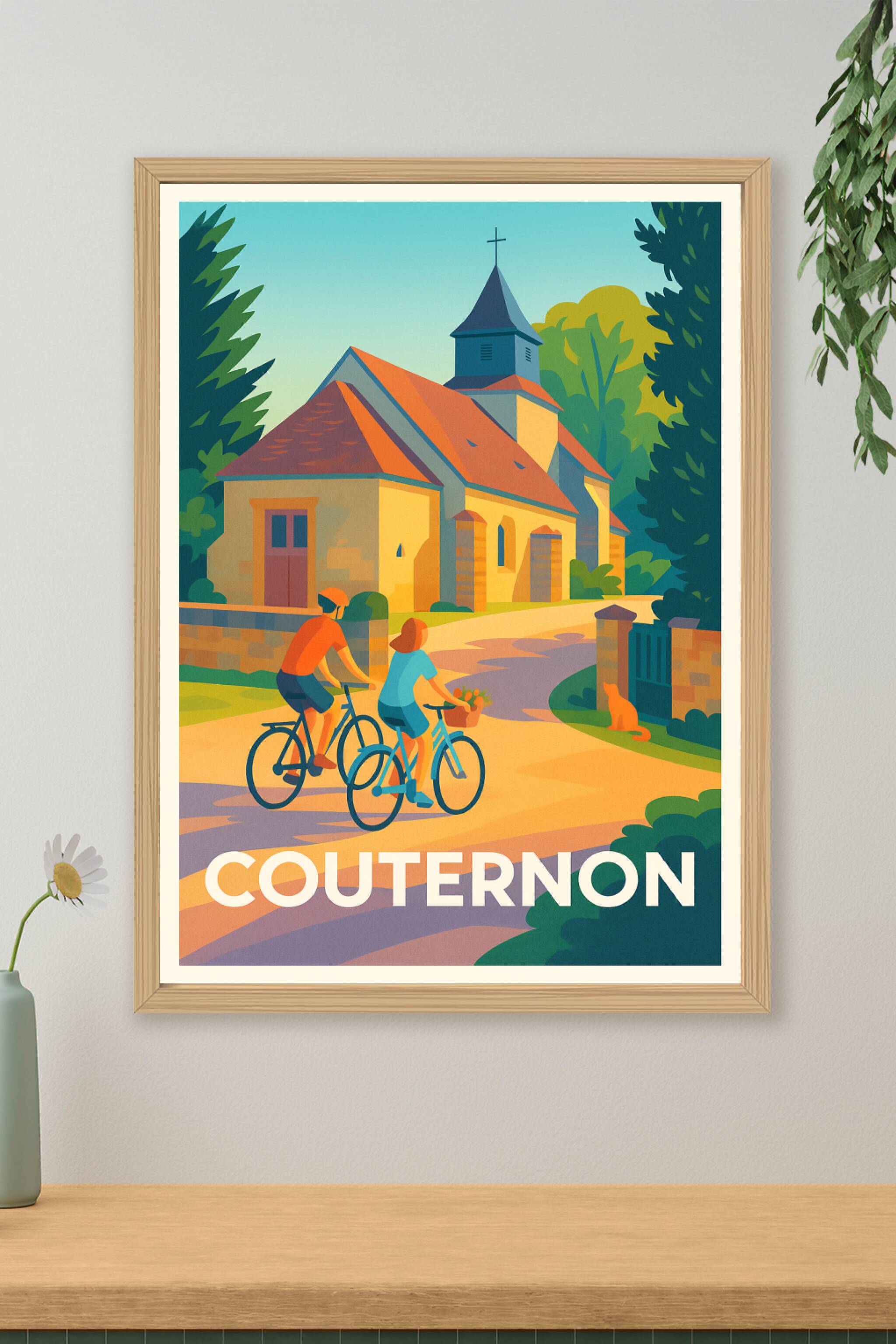 Découvrez l'atmosphère paisible et conviviale de Couternon avec cette affiche illustrée mettant en scène une scène de balade à vélo au cœur d'un vi...