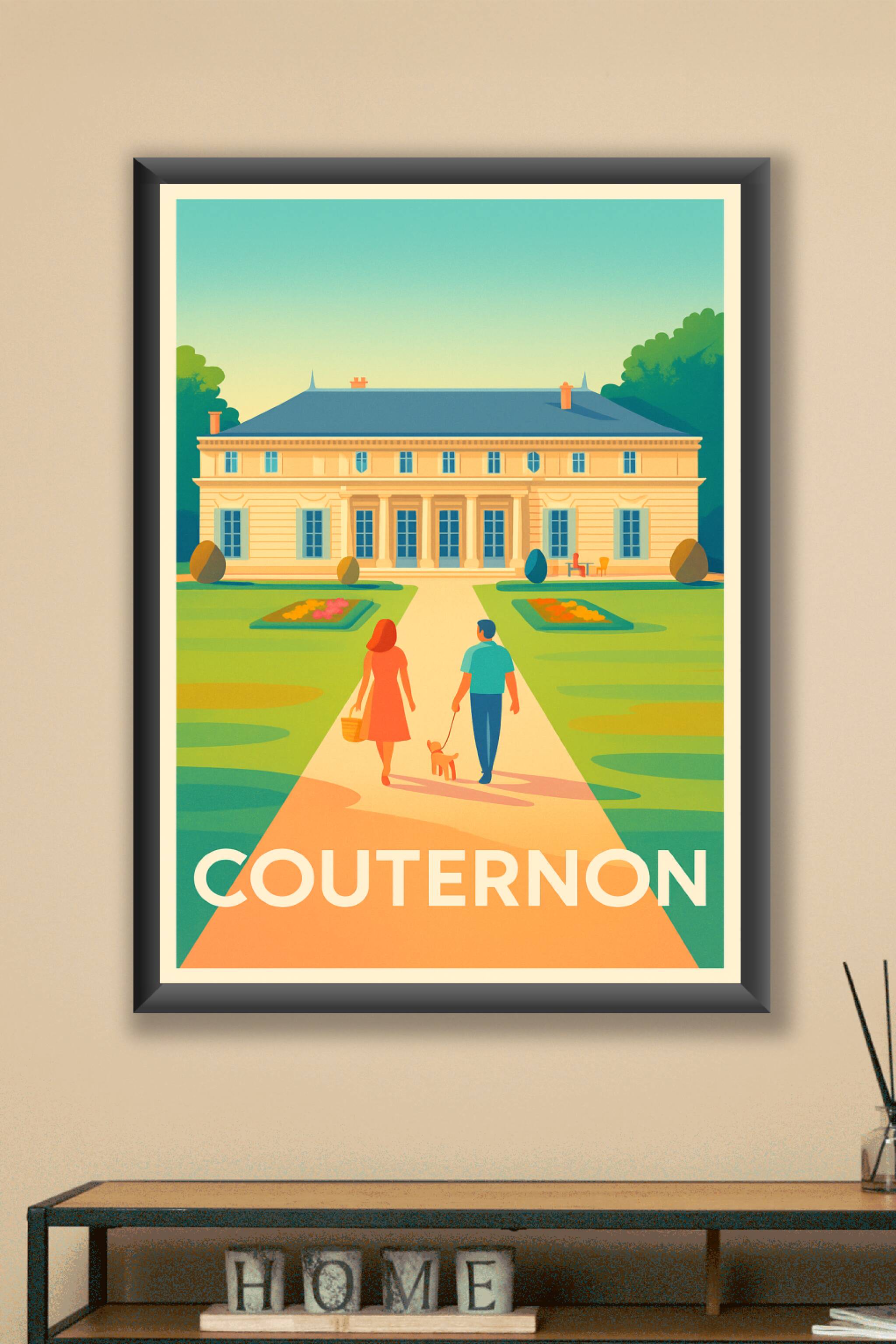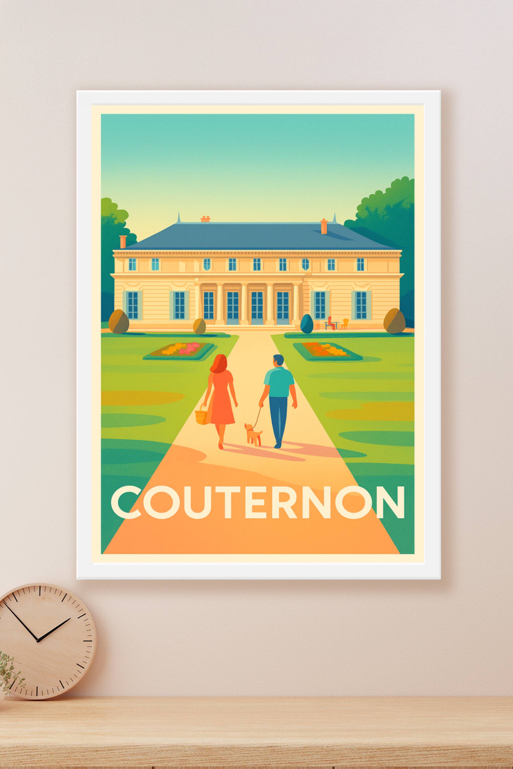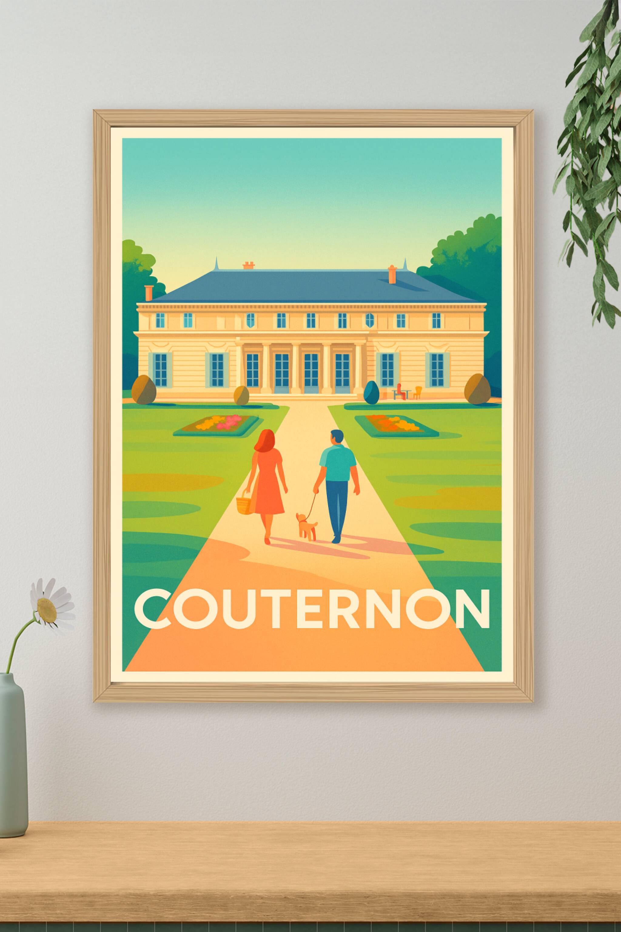 Découvrez la douceur de vivre de Couternon avec cette affiche illustrée qui met en scène une charmante balade dans les allées d'un élégant château....