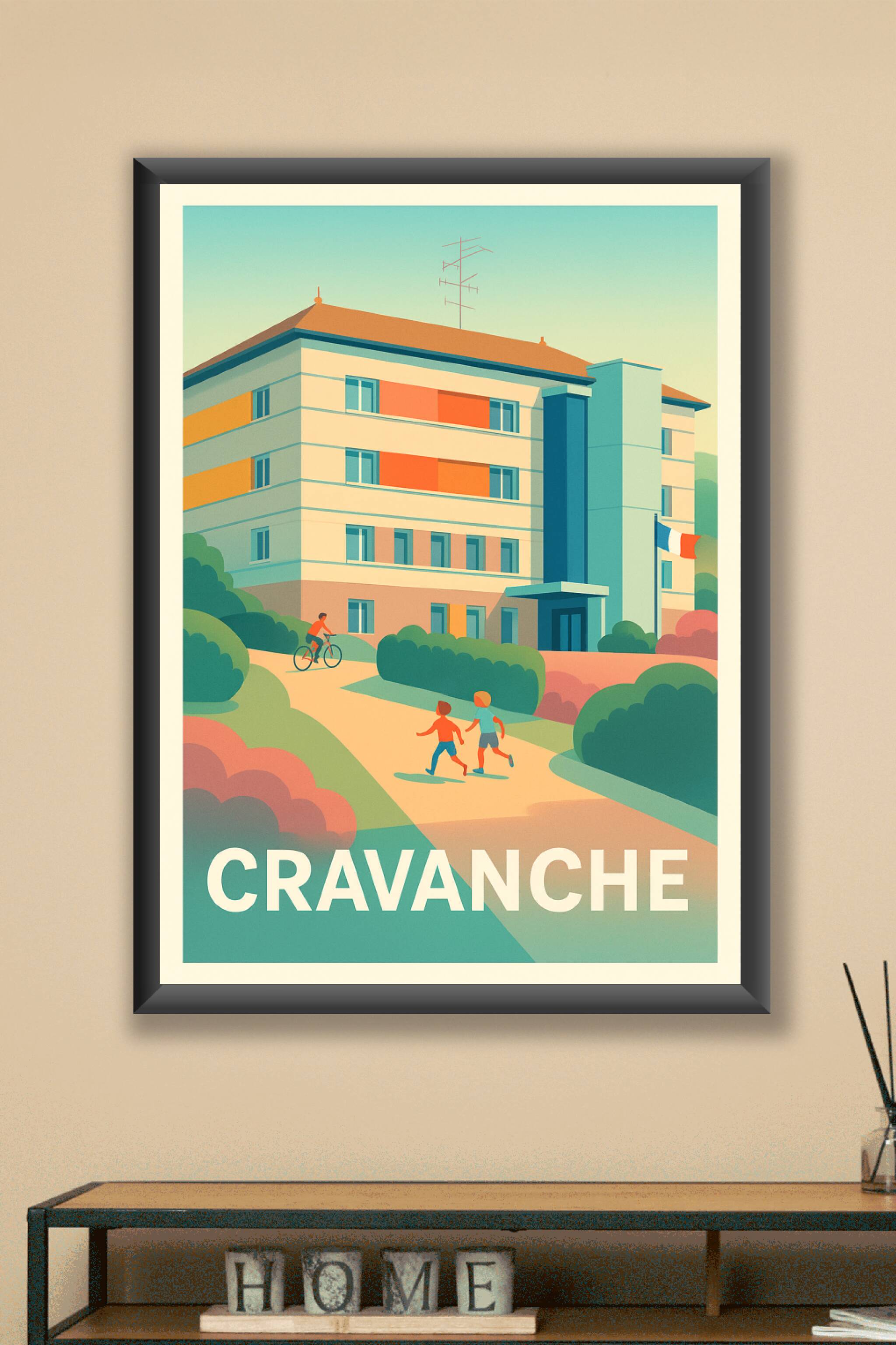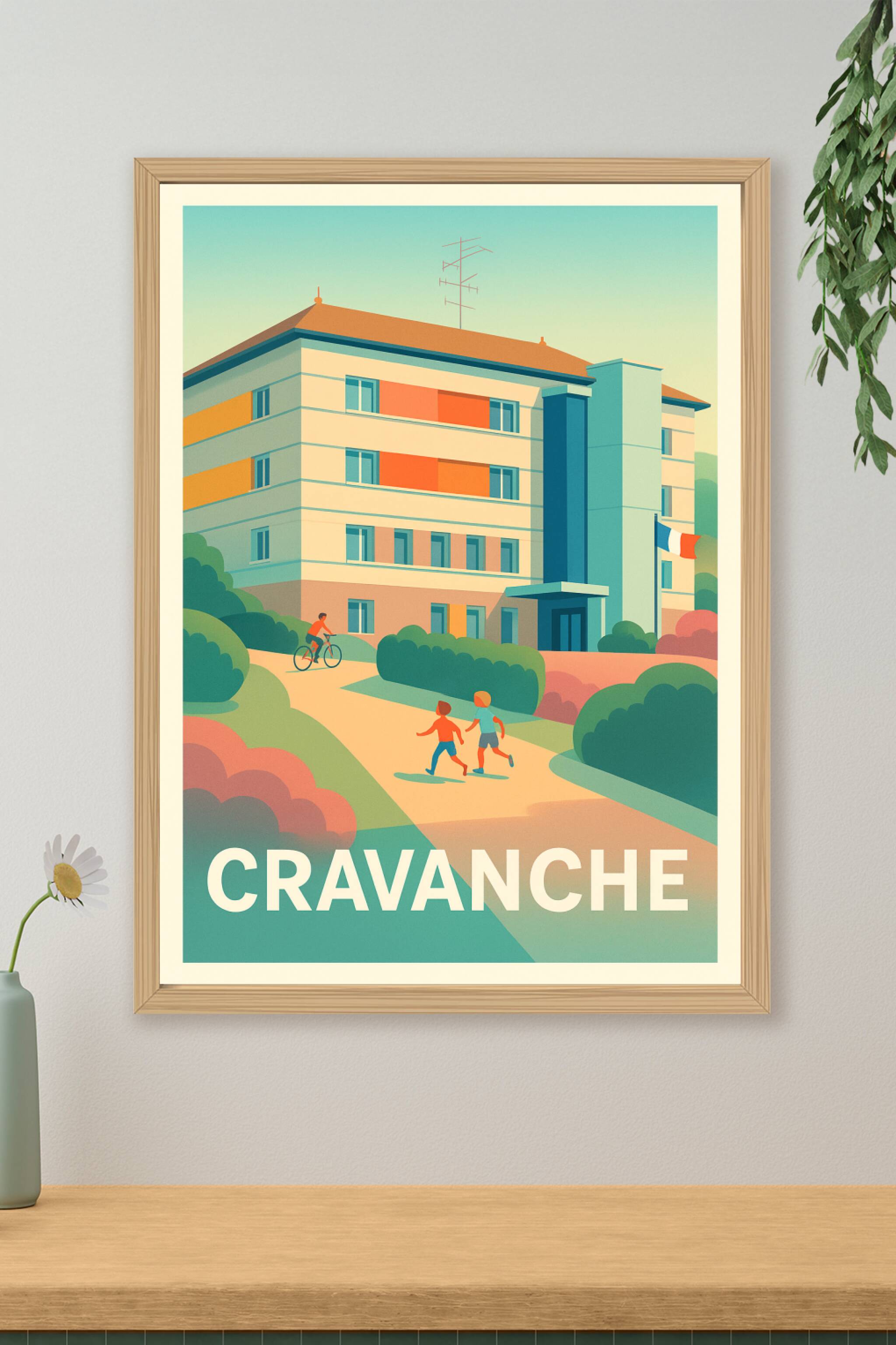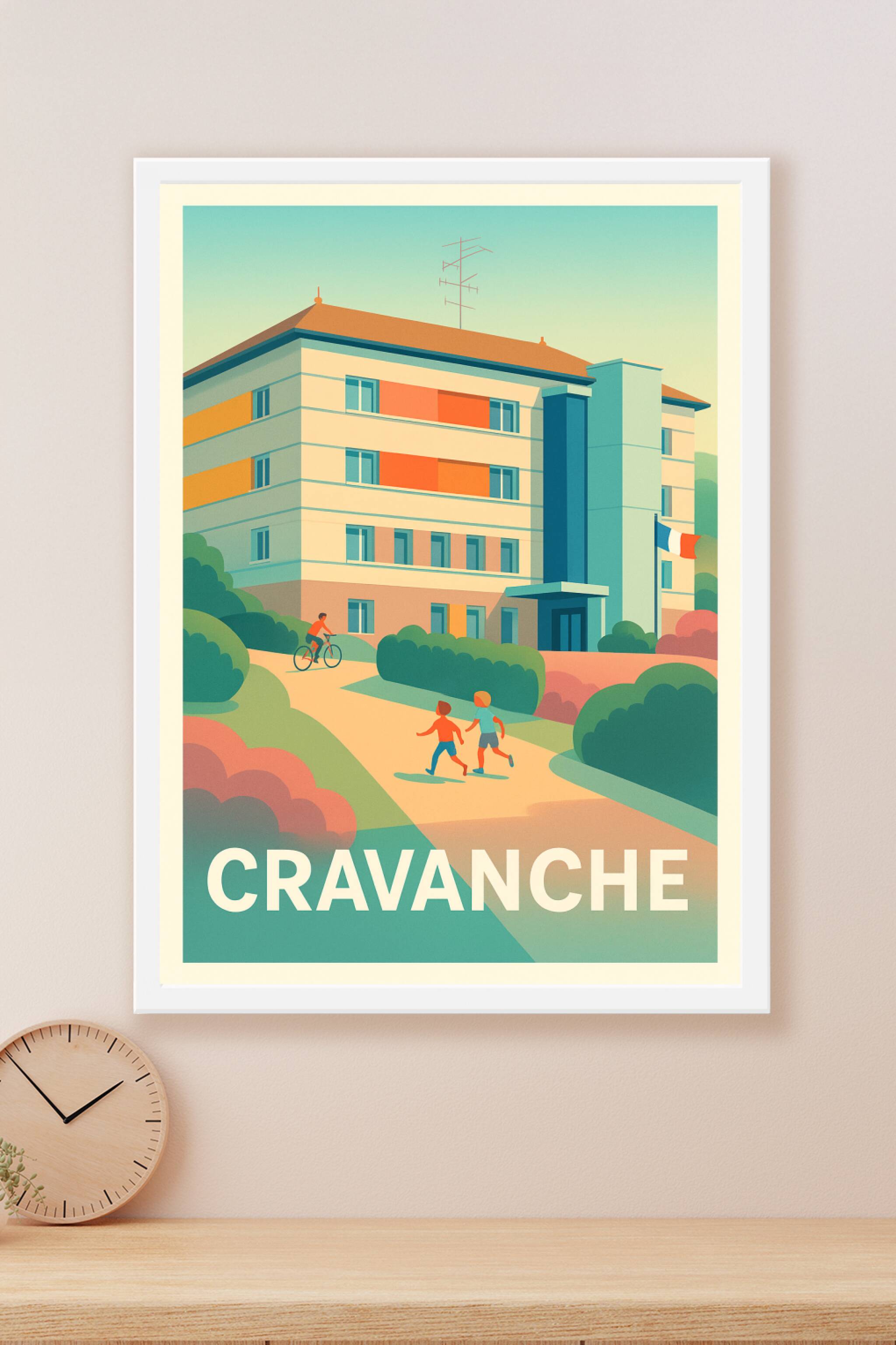 Découvrez l'atmosphère paisible et chaleureuse de Cravanche avec cette affiche illustrée aux couleurs douces et harmonieuses. L'illustration met en...