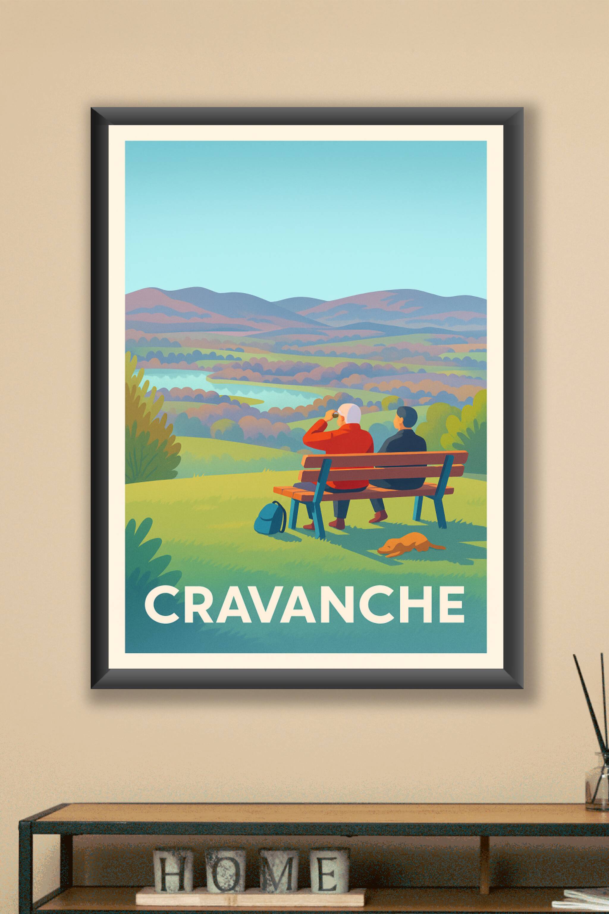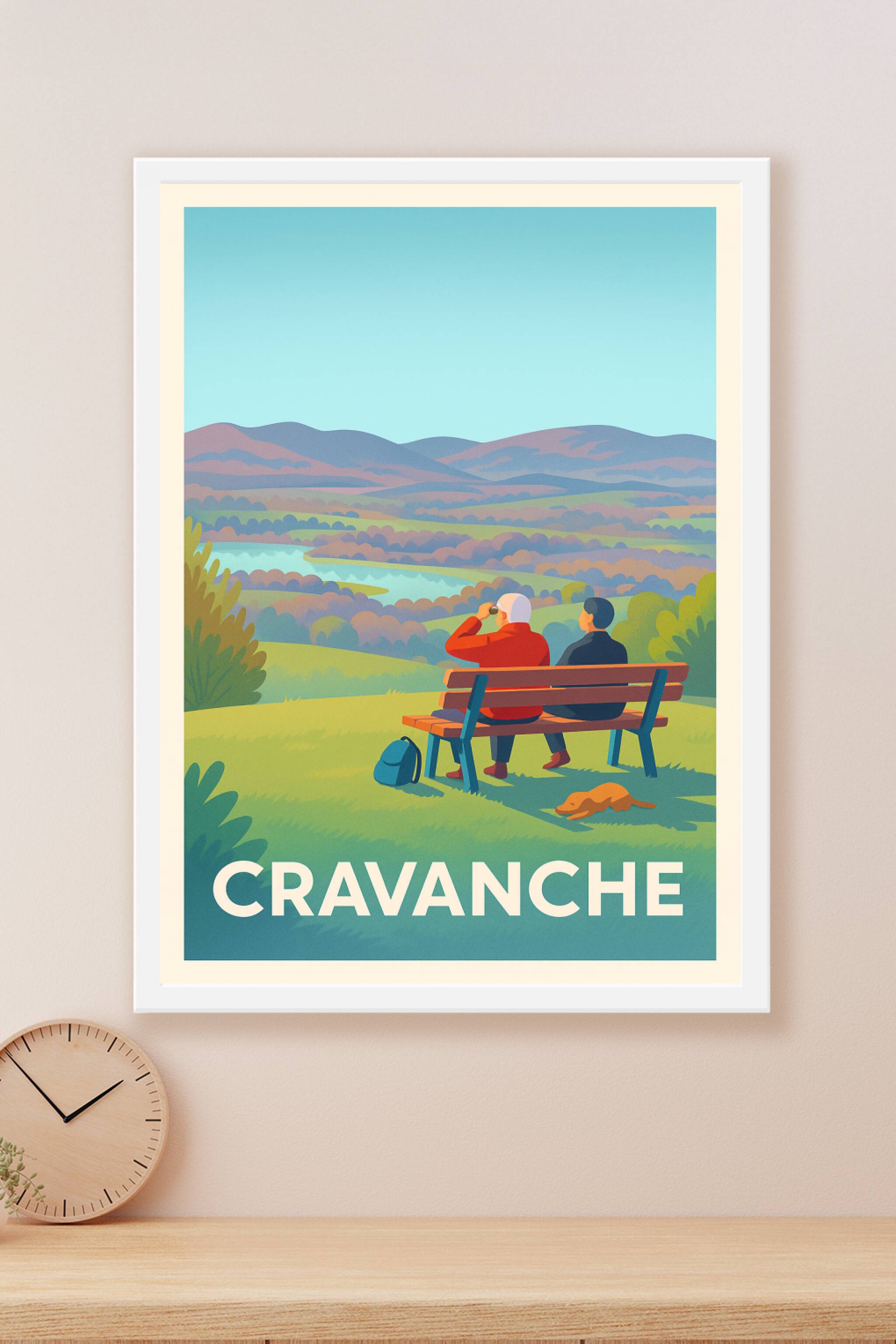 Découvrez l'élégance tranquille de Cravanche à travers cette affiche artistique qui capture un instant de sérénité entre deux promeneurs sur un ban...