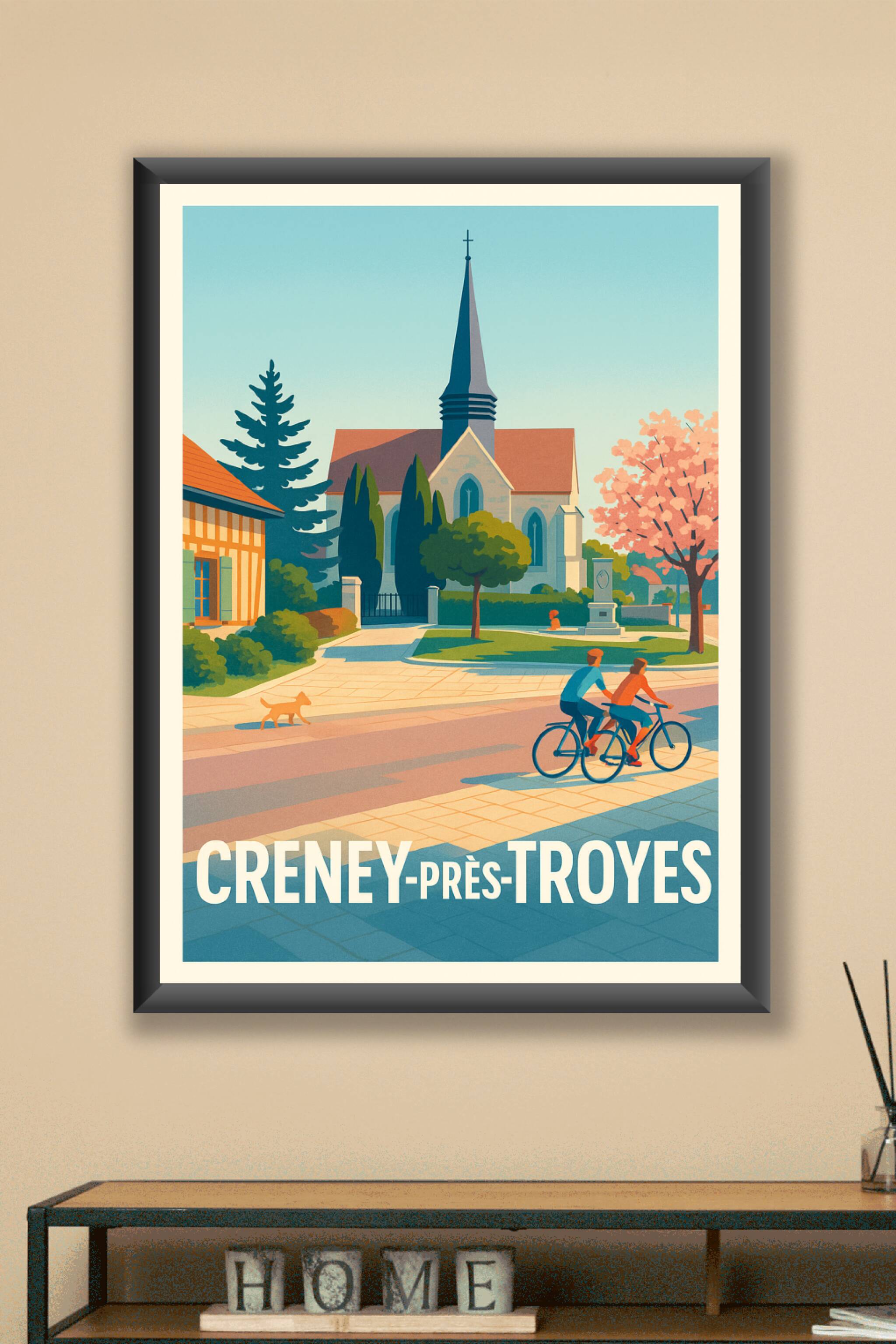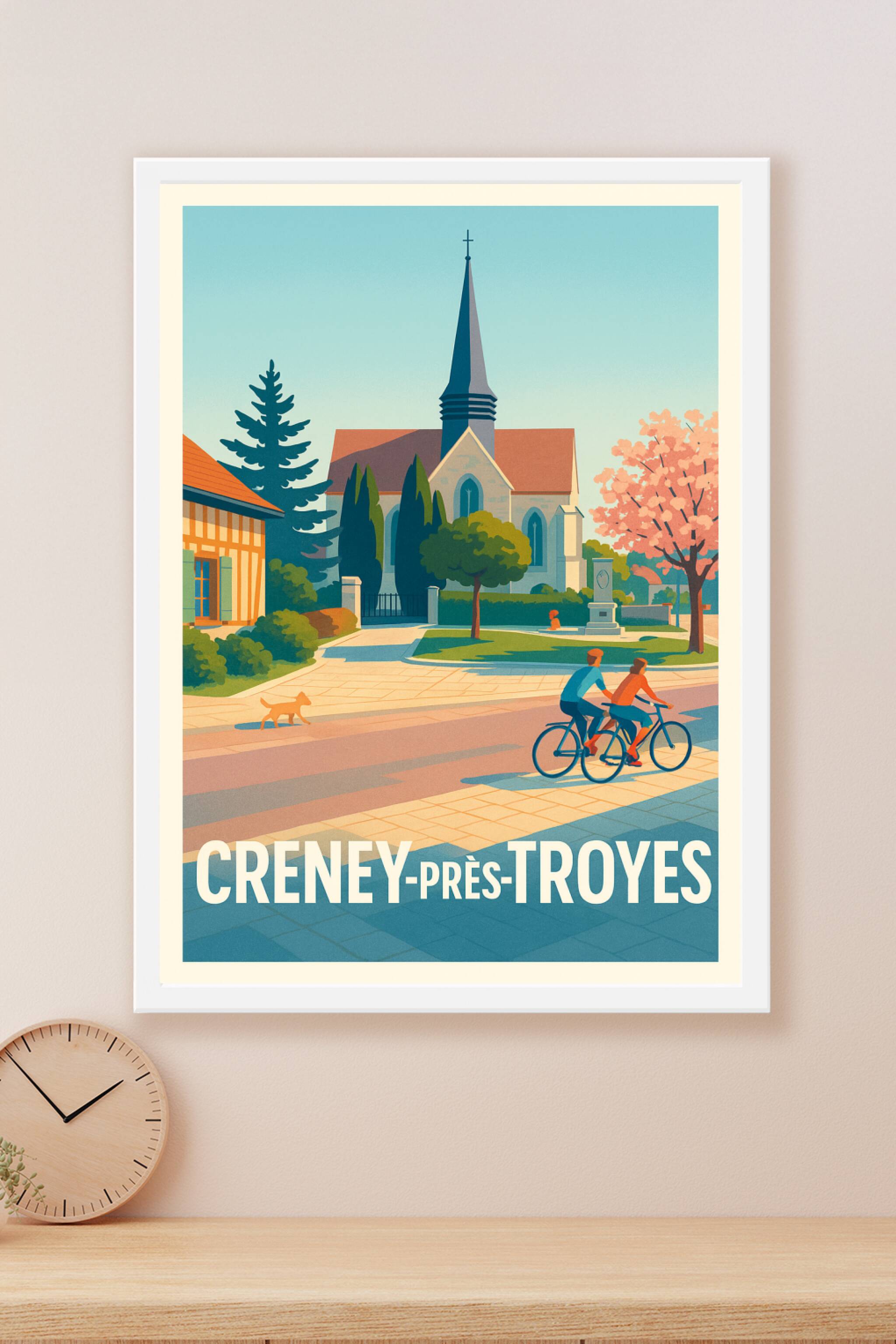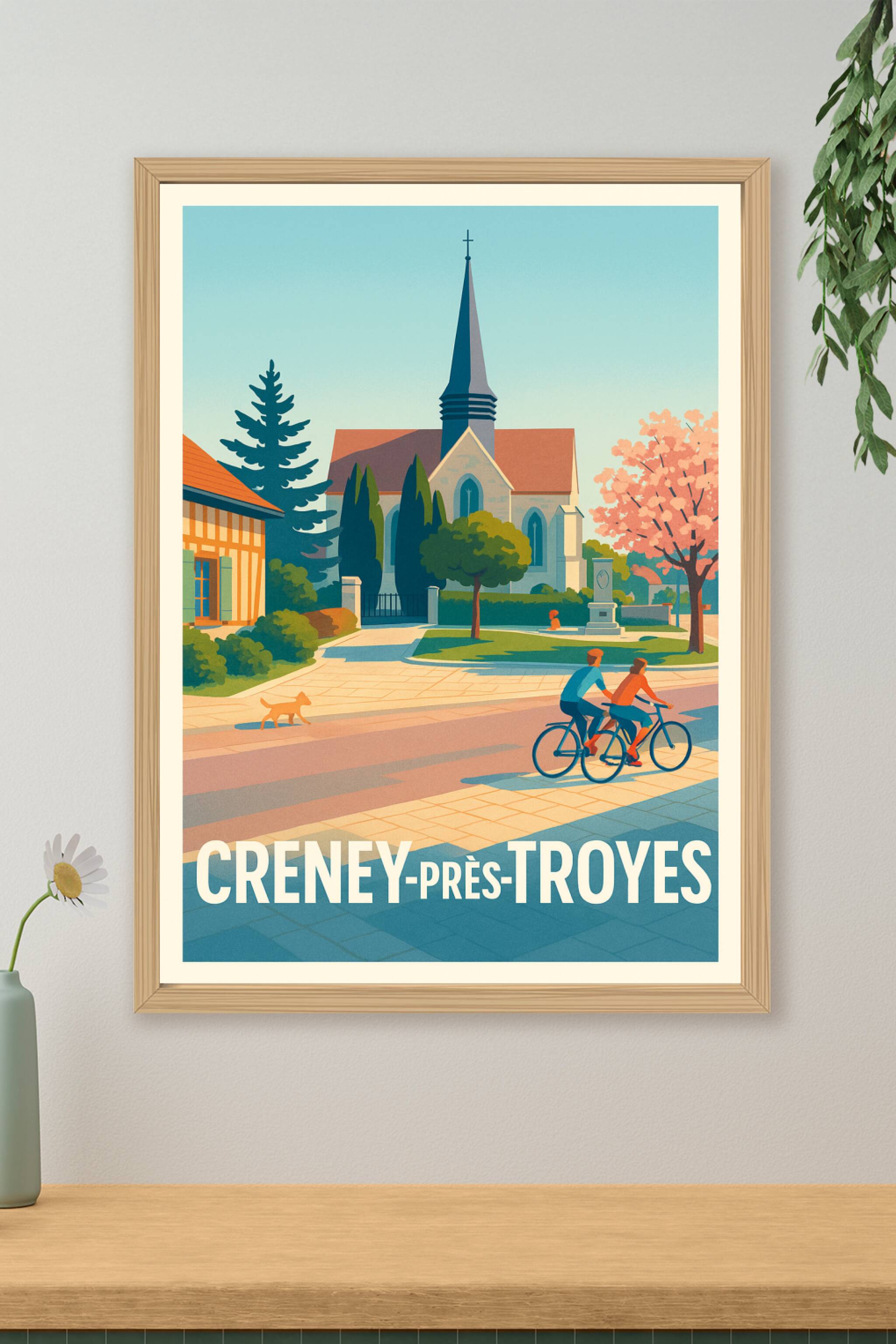 Découvrez la douceur de vivre à Creney-près-Troyes avec cette affiche illustrée qui capture un instant tranquille entre vélo, nature et architectur...
