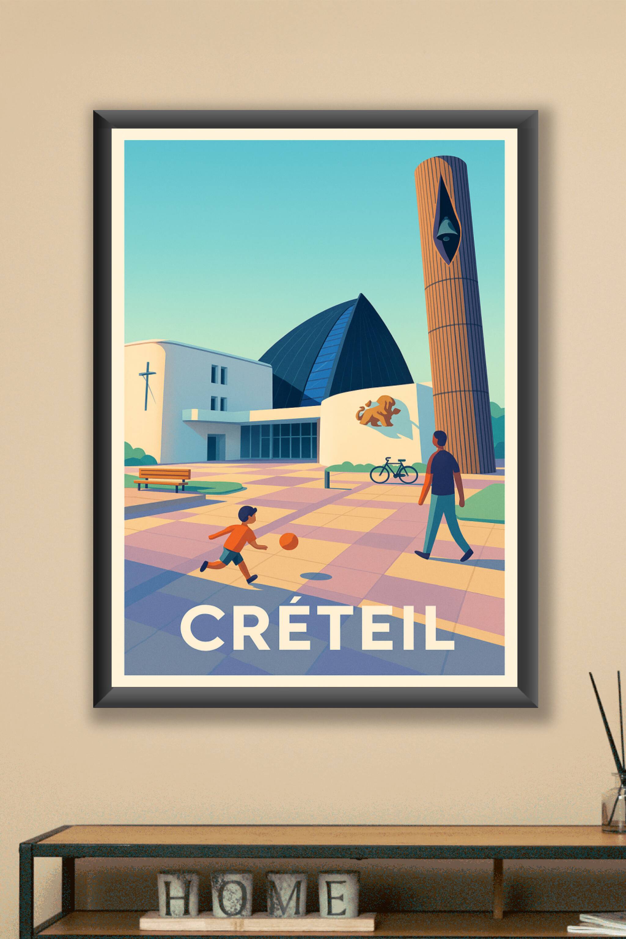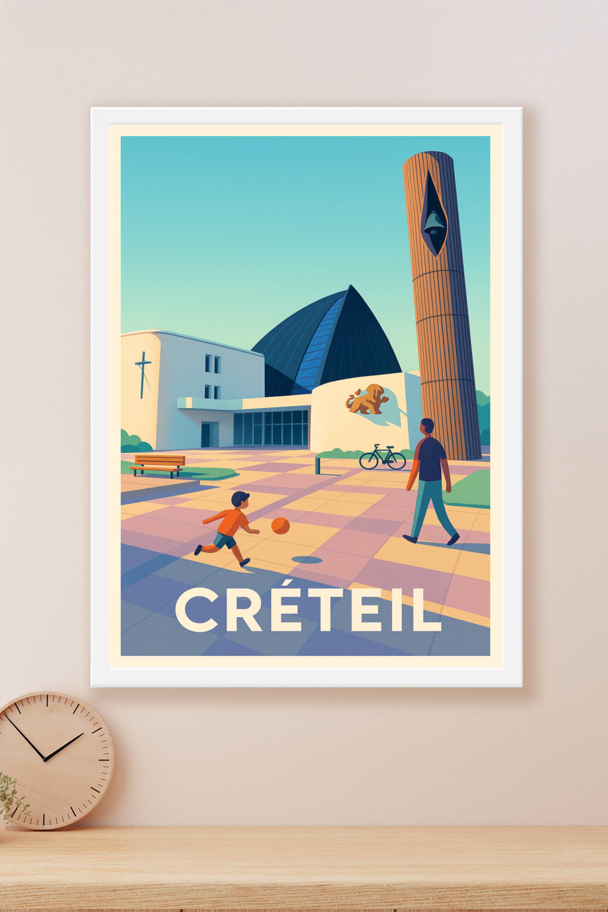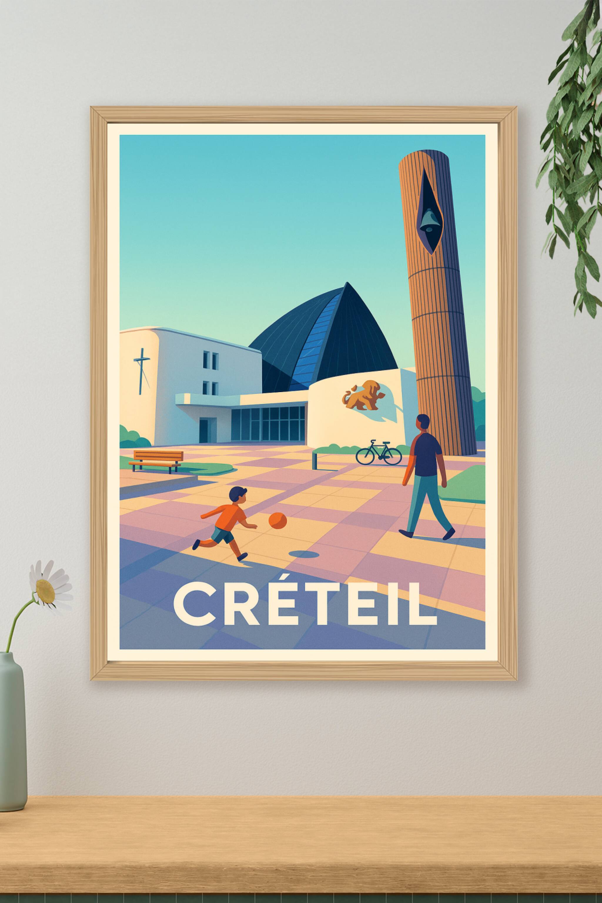 Découvrez le charme doux et lumineux de Créteil avec cette affiche illustrée, mettant en scène une scène paisible où un enfant joue au ballon sous ...