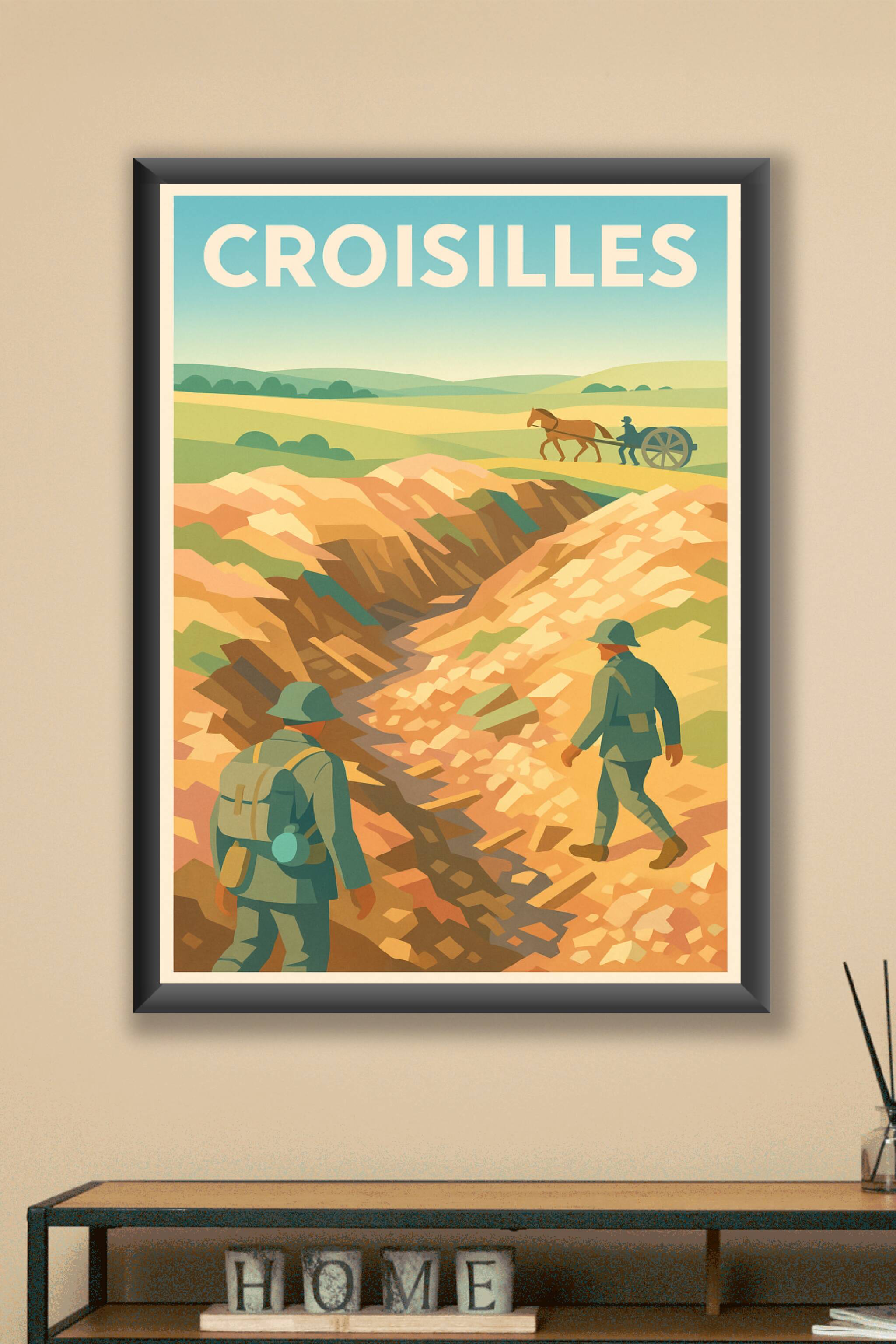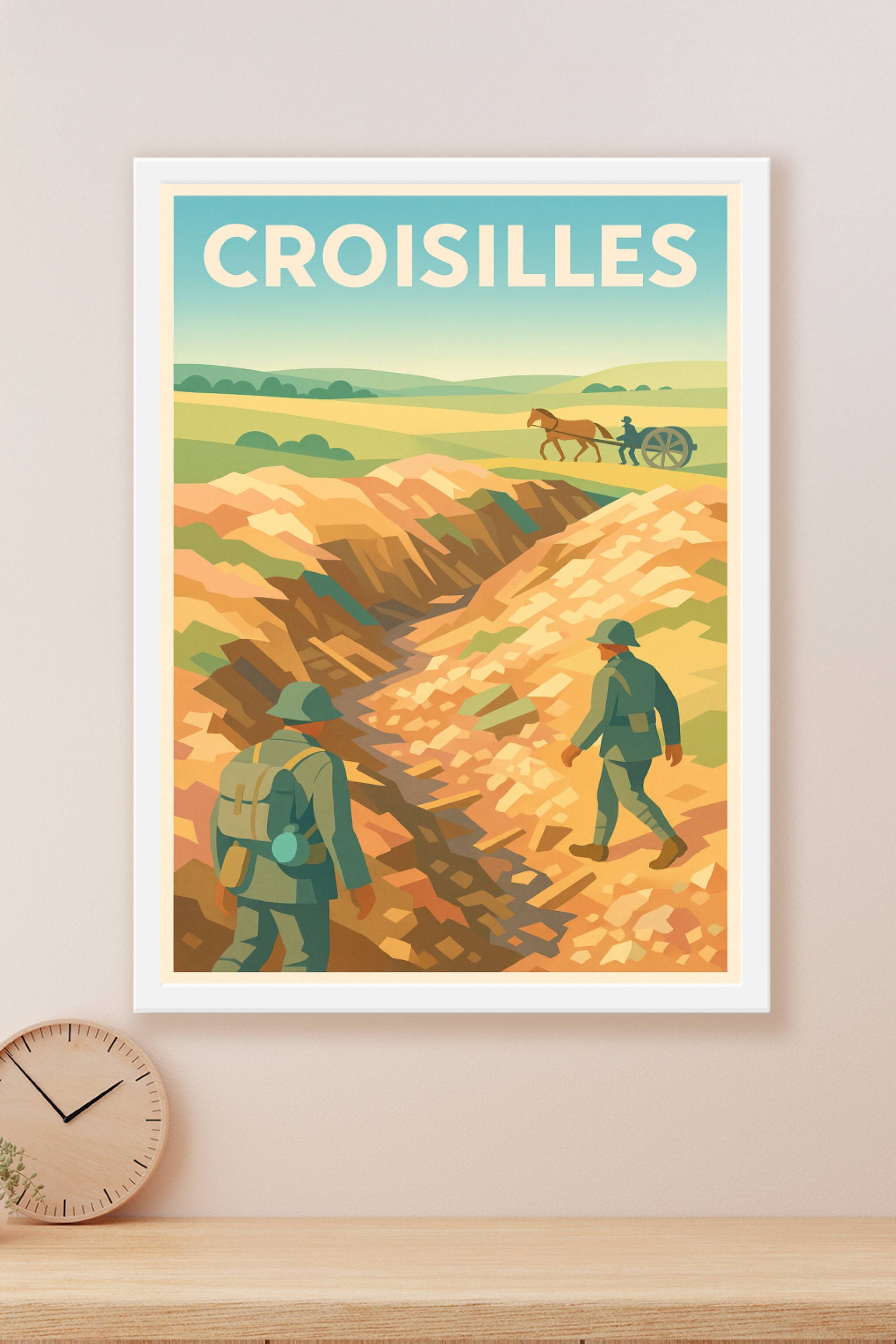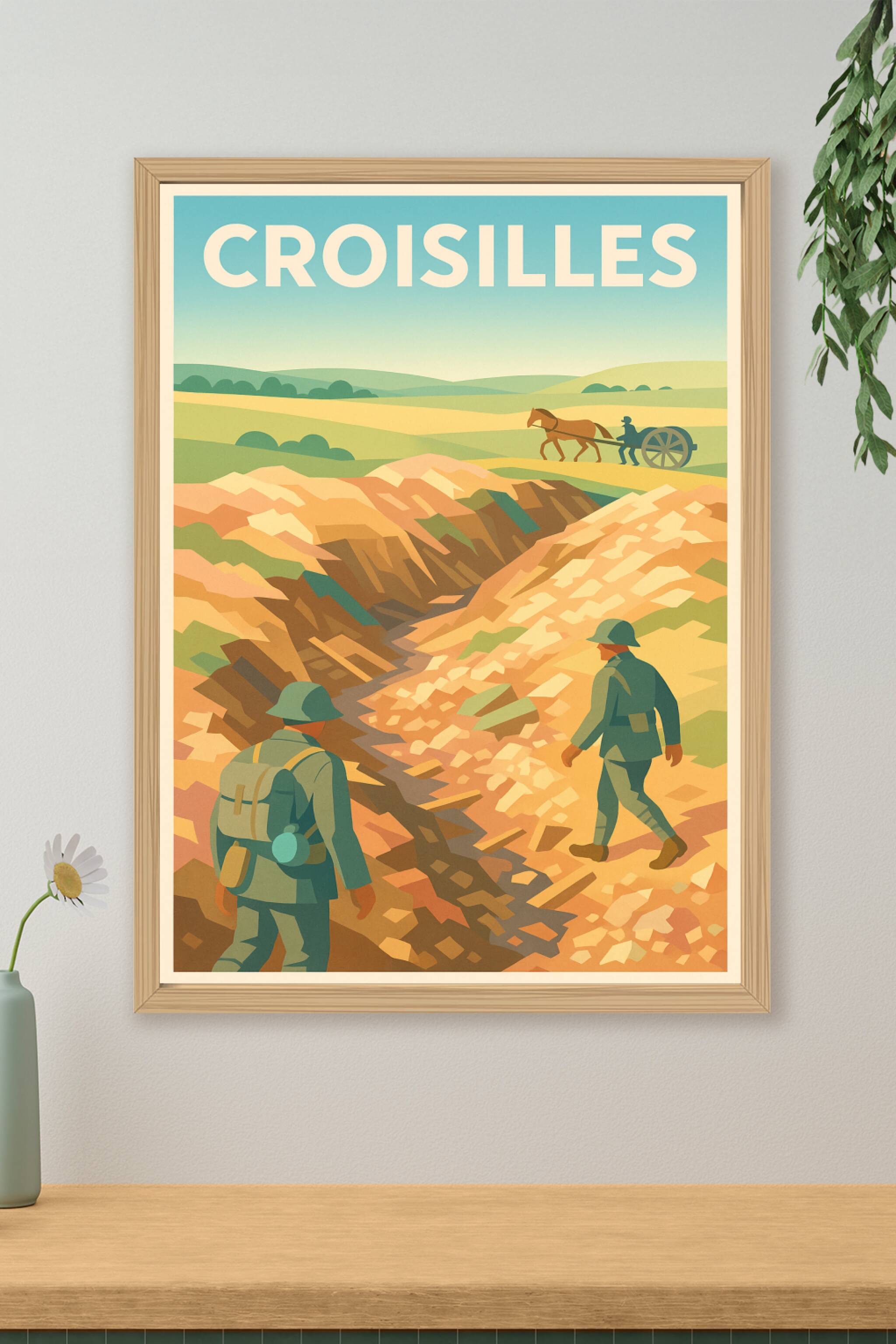 Revivez l'atmosphère historique et poignante des combats à Croisilles avec cette affiche au style vintage inspiré des années 1920. Le poster illust...