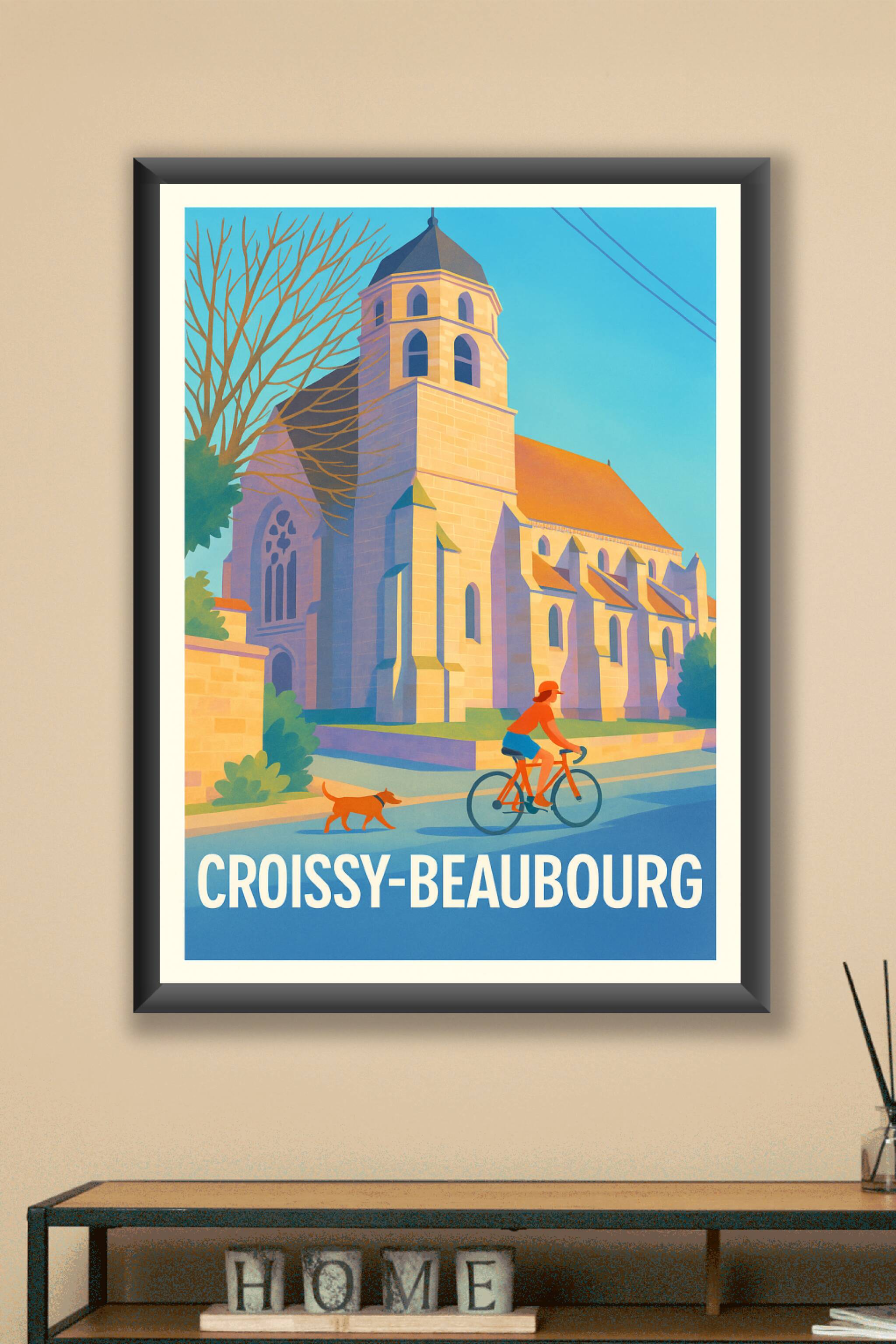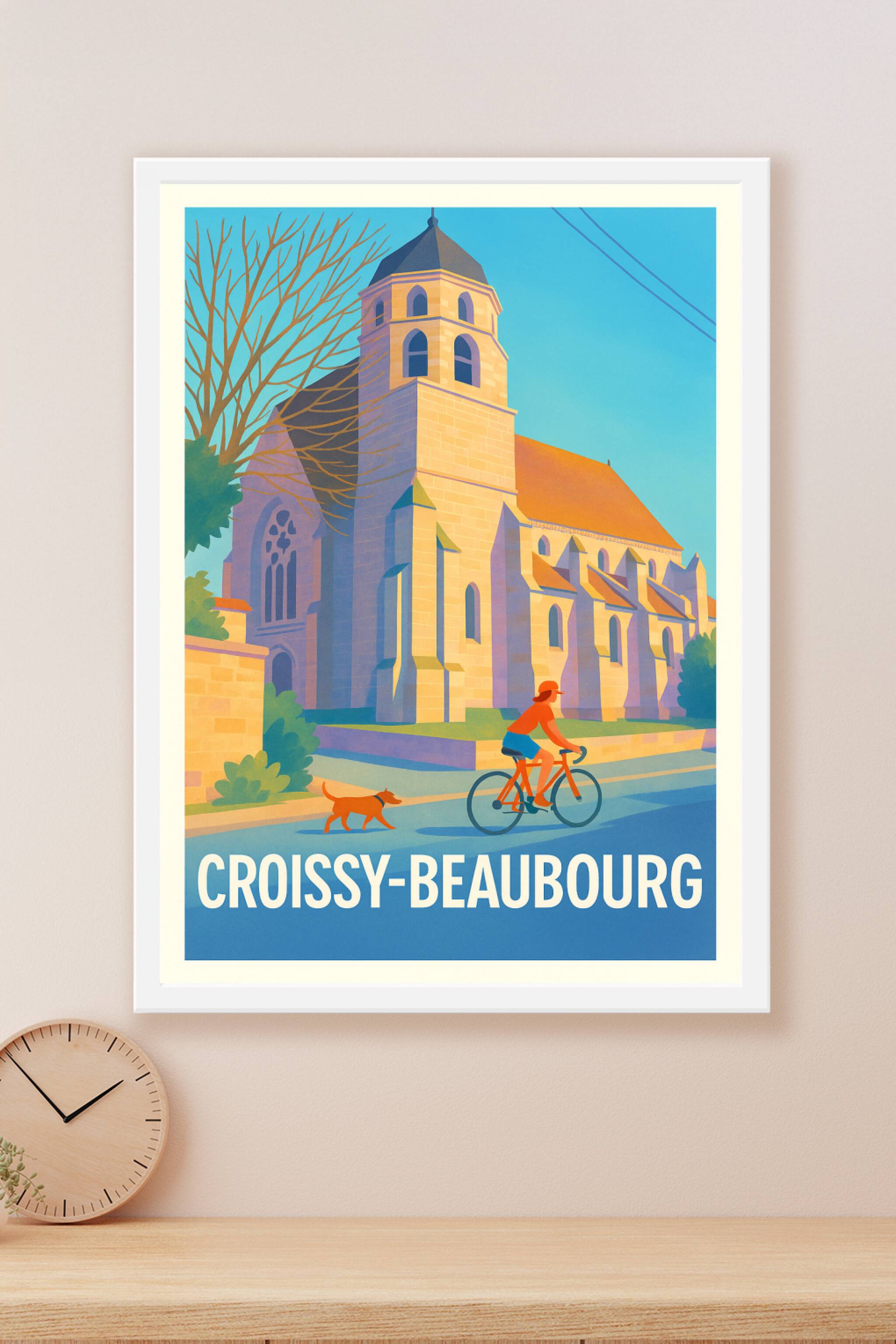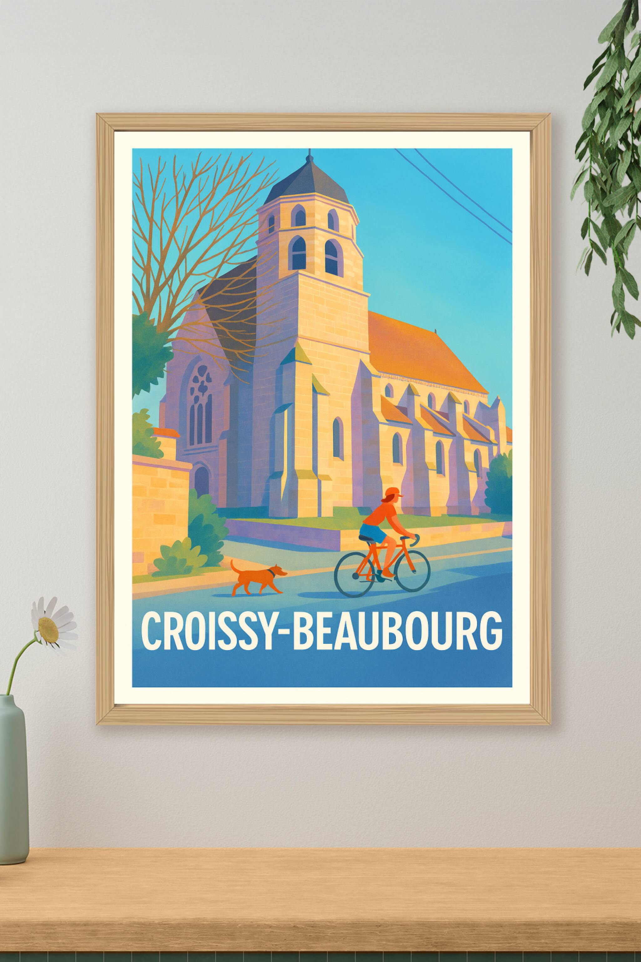 Découvrez l'élégance paisible de Croissy-Beaubourg à travers cette affiche illustrée mettant en scène une promenade à vélo devant une église histor...