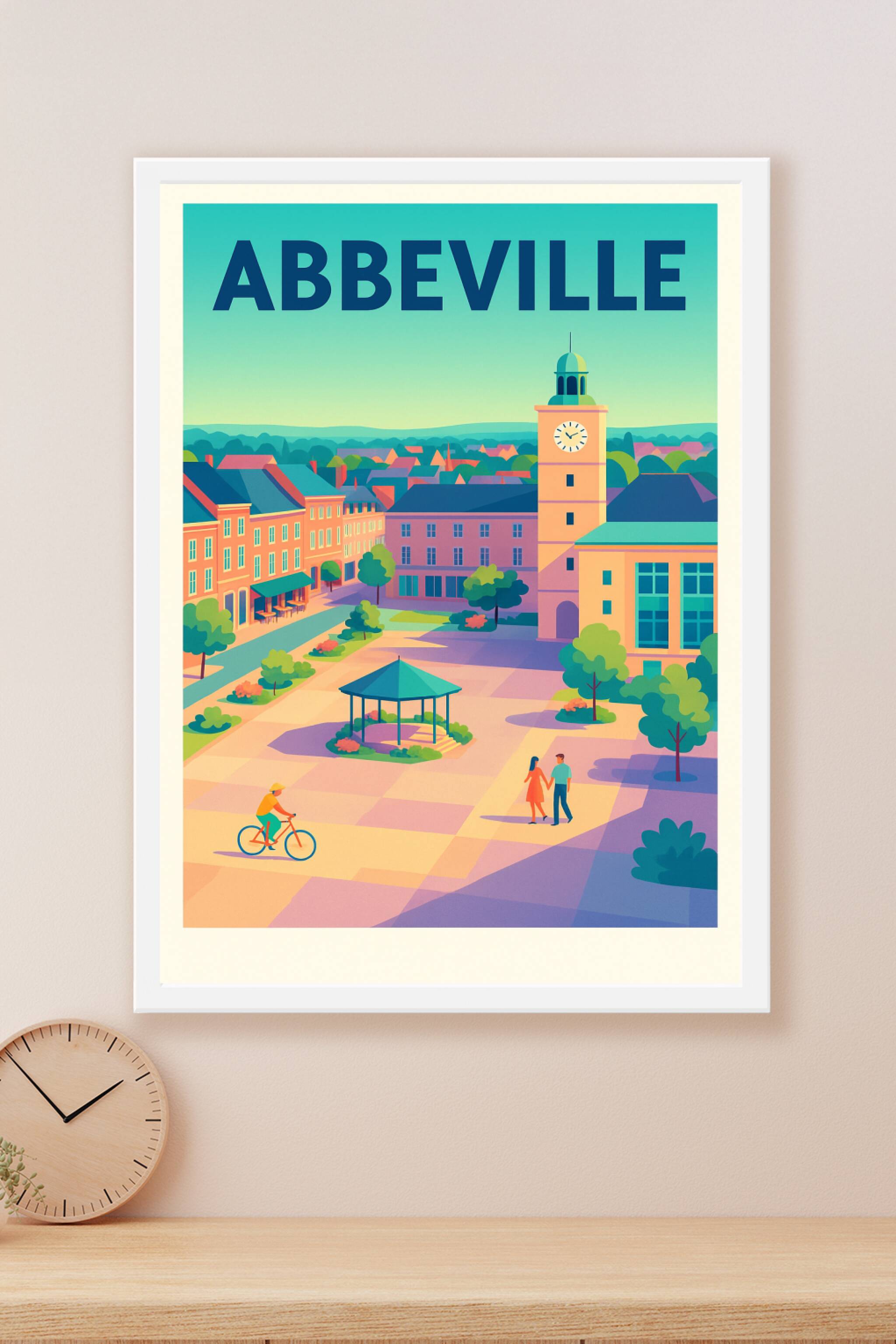Découvrez l'ambiance paisible et chaleureuse d'Abbeville à travers cette affiche illustrée au style coloré et lumineux. Le poster met en avant la p...