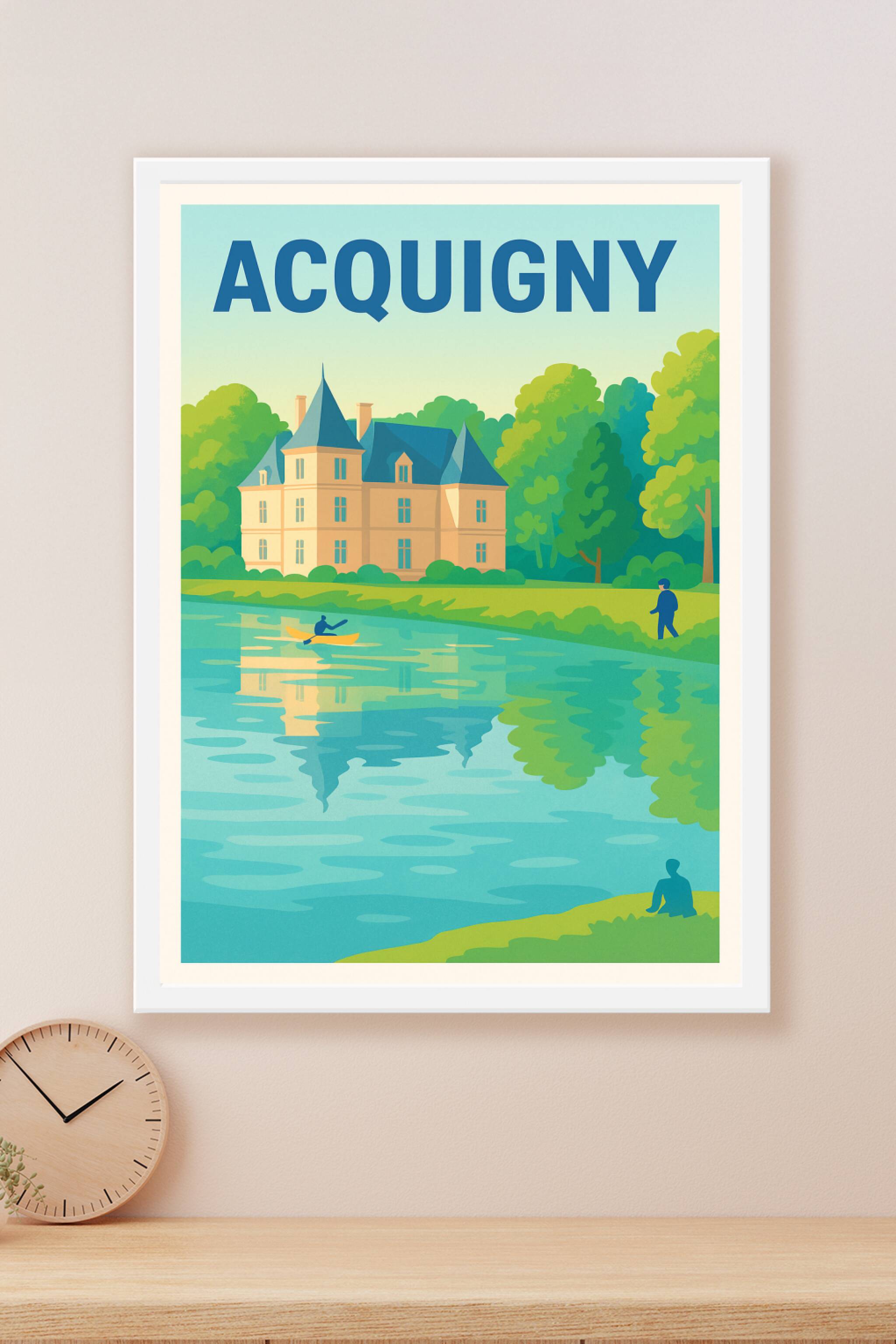 Découvrez l'élégance paisible d'Acquigny à travers cette affiche illustrée mettant en scène son château emblématique au bord d'un plan d'eau calme....