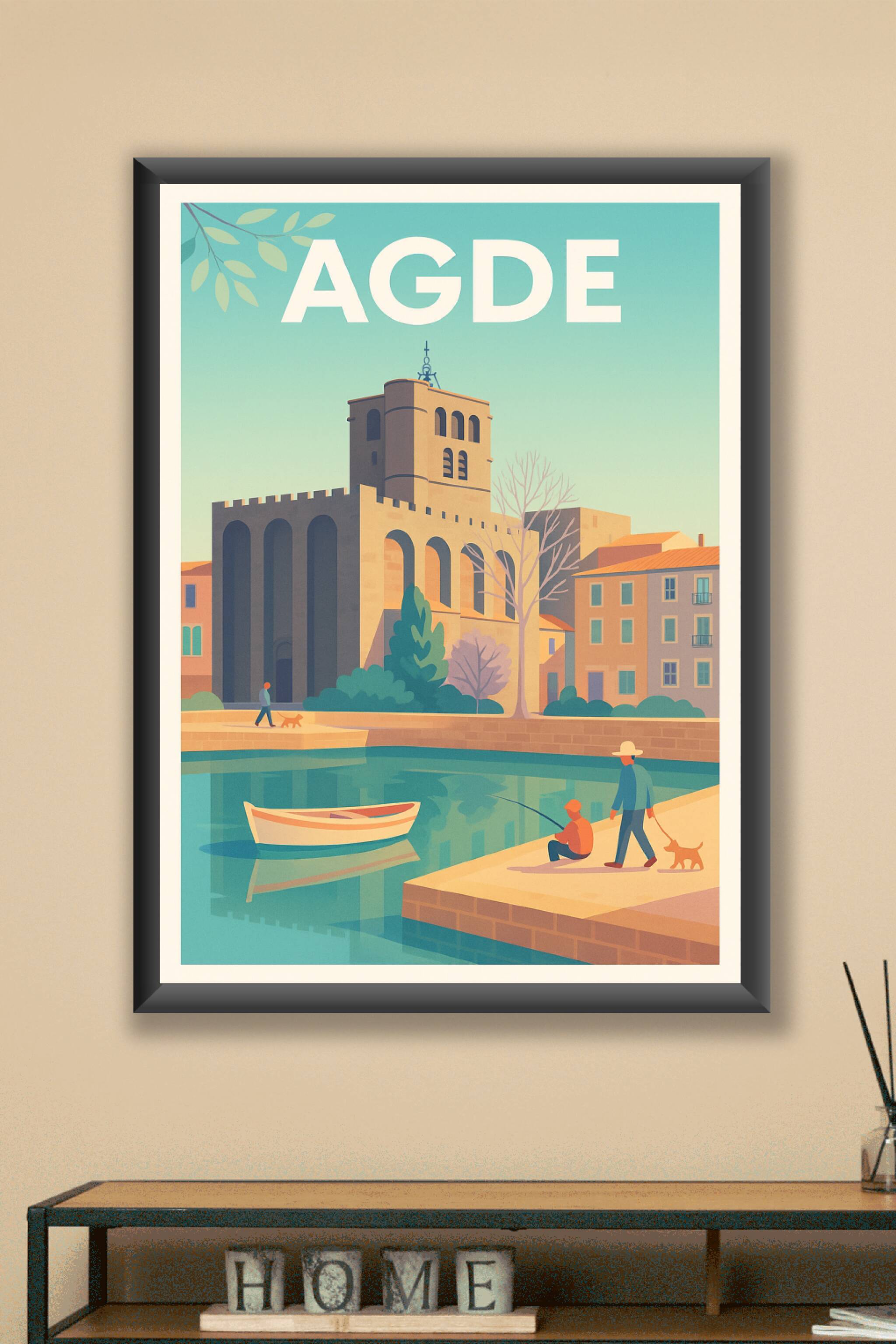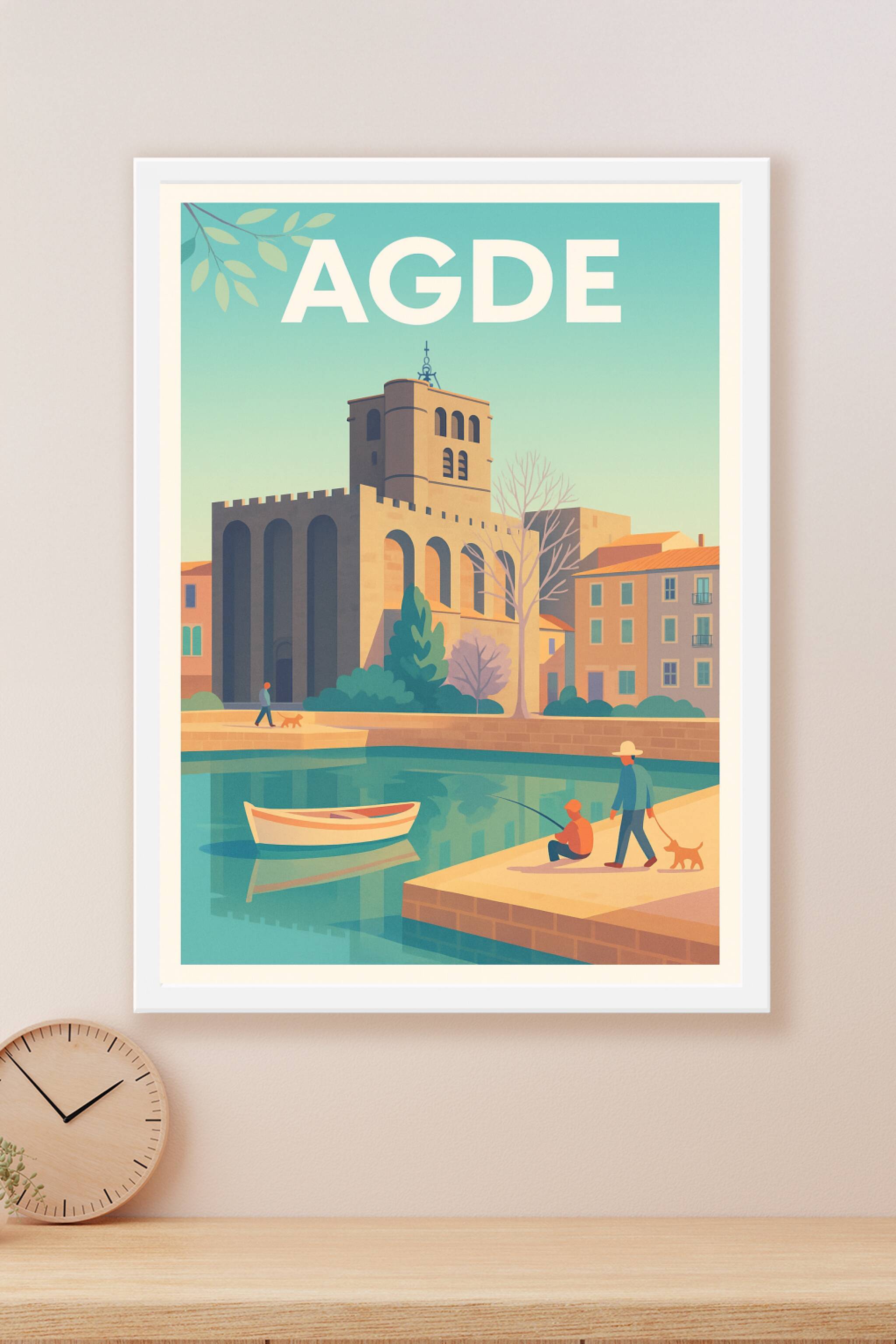 Découvrez le charme intemporel d'Agde avec cette affiche au style rétro mettant en scène son architecture emblématique et son cadre paisible au bor...