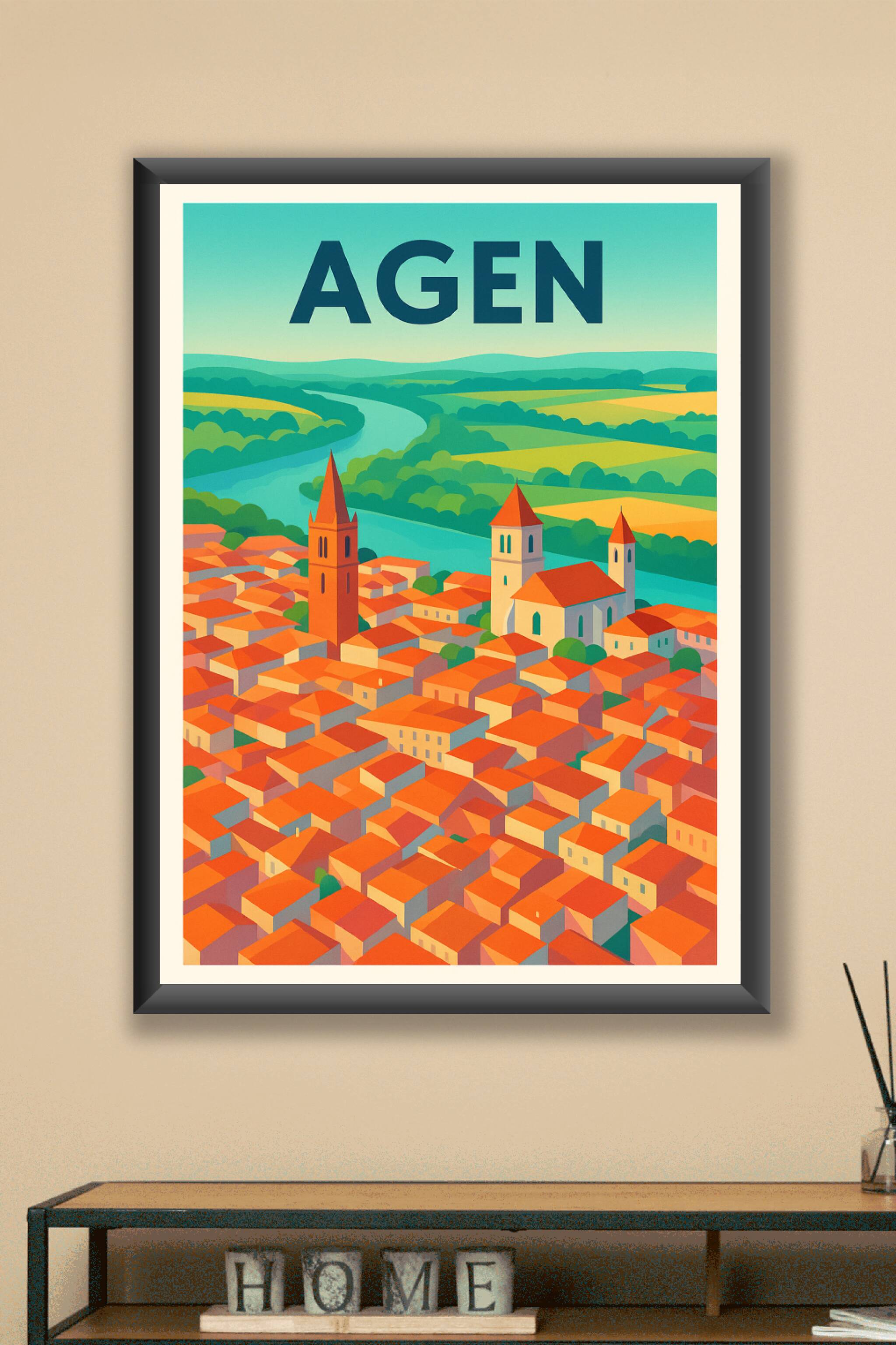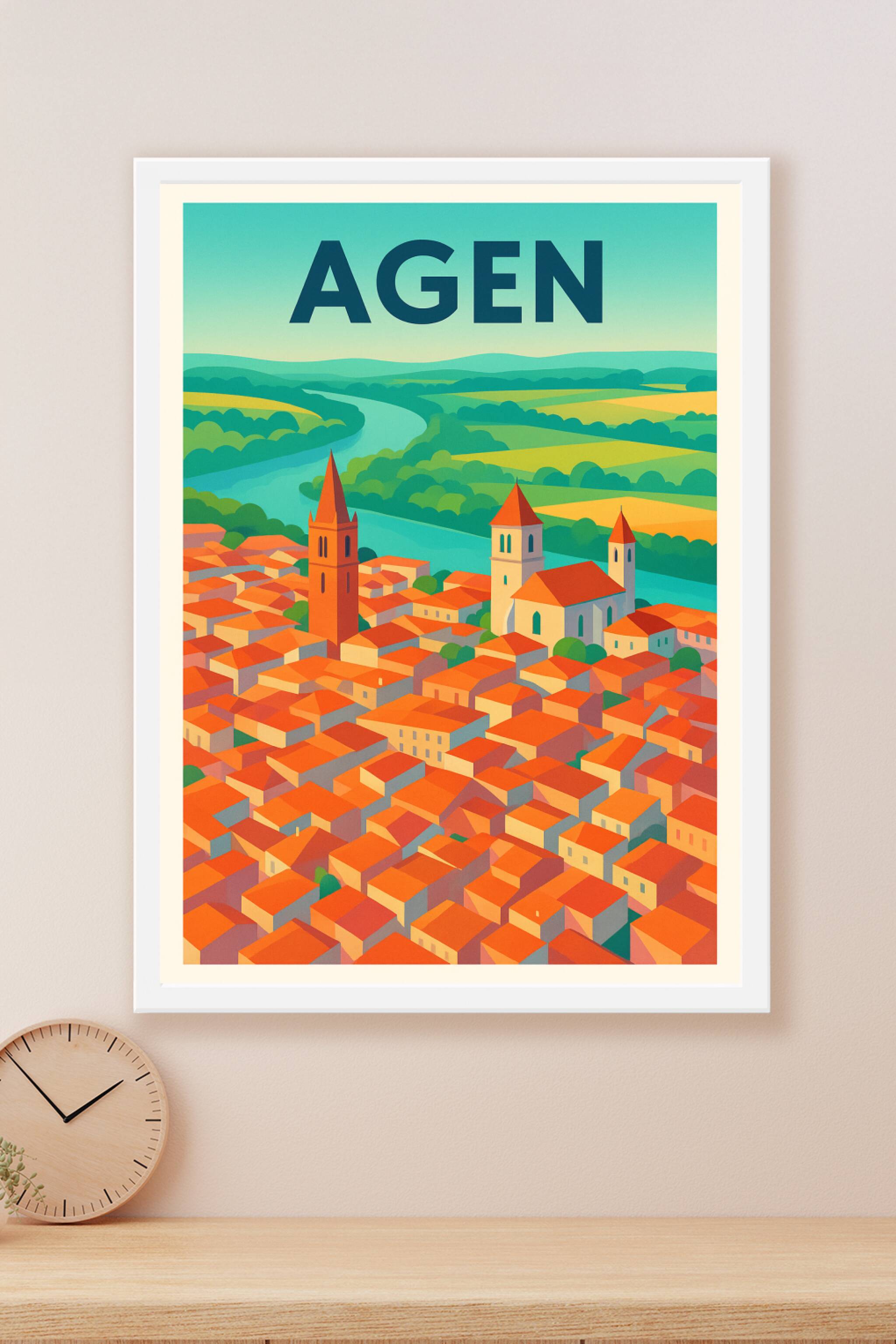 Découvrez le charme intemporel d'Agen avec cette affiche illustrée qui met en lumière les toits orangés typiques et le paysage verdoyant bordé par ...
