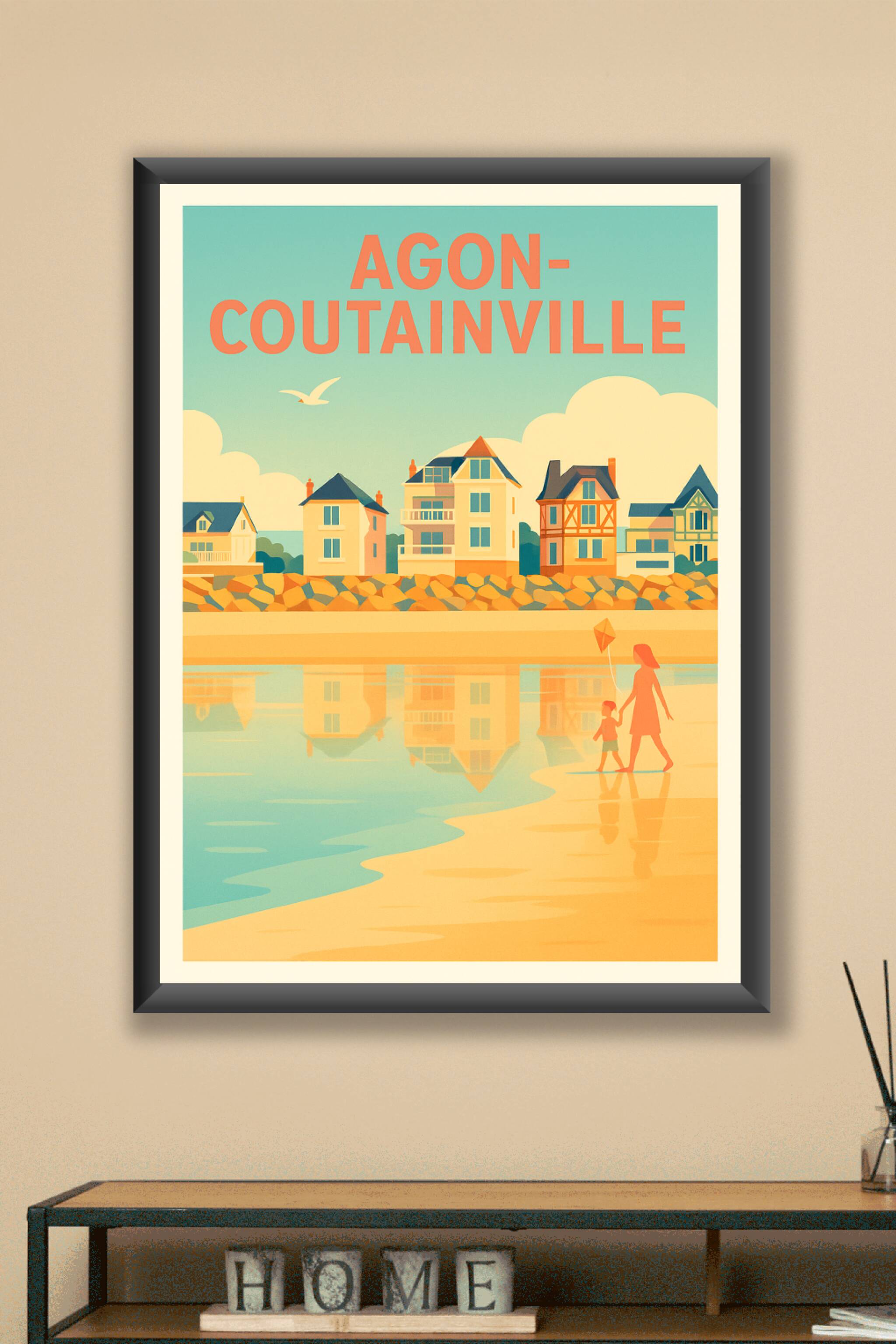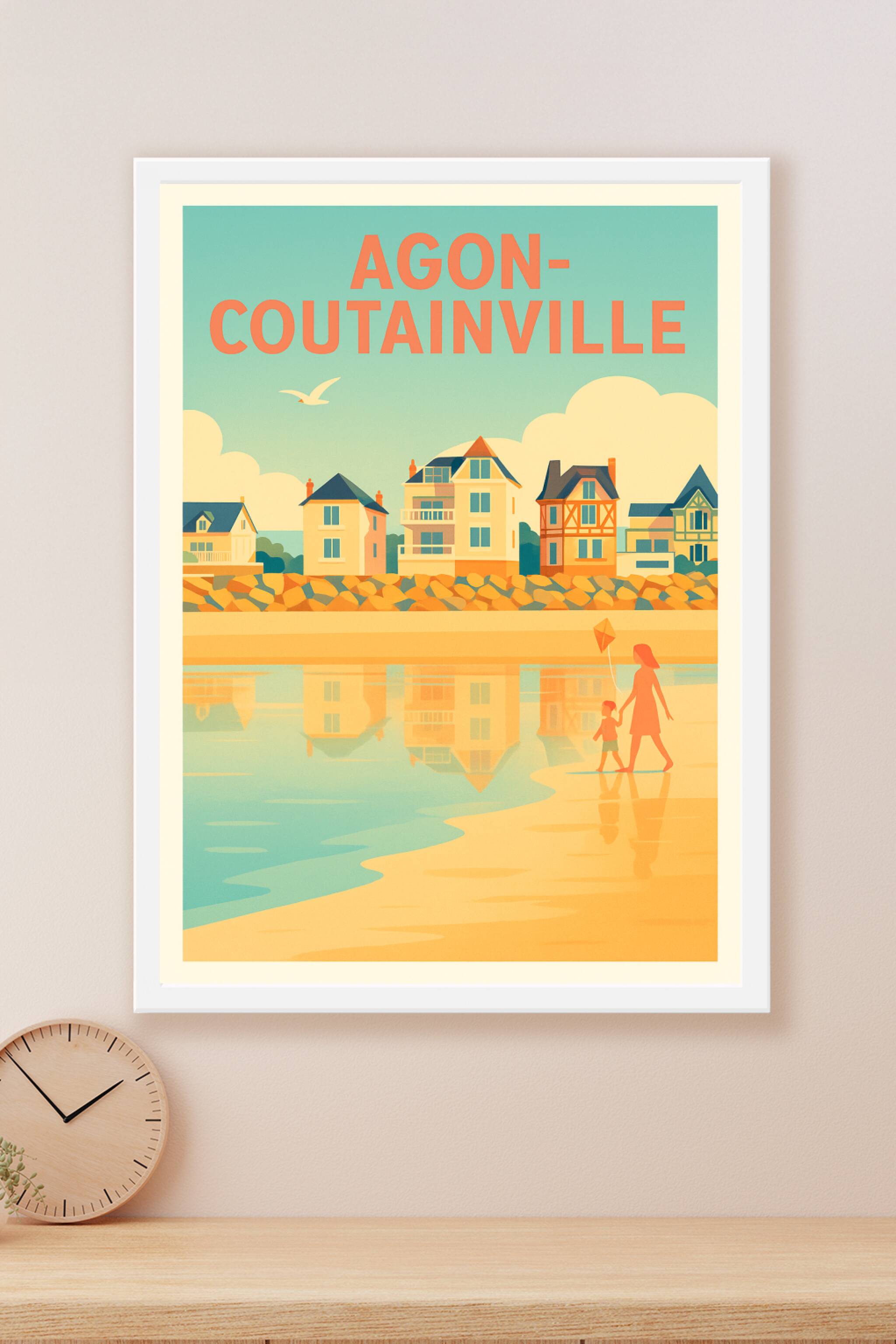 Offrez-vous une escapade paisible avec cette affiche illustrée représentant la charmante station balnéaire d'Agon-Coutainville. La scène délicate m...
