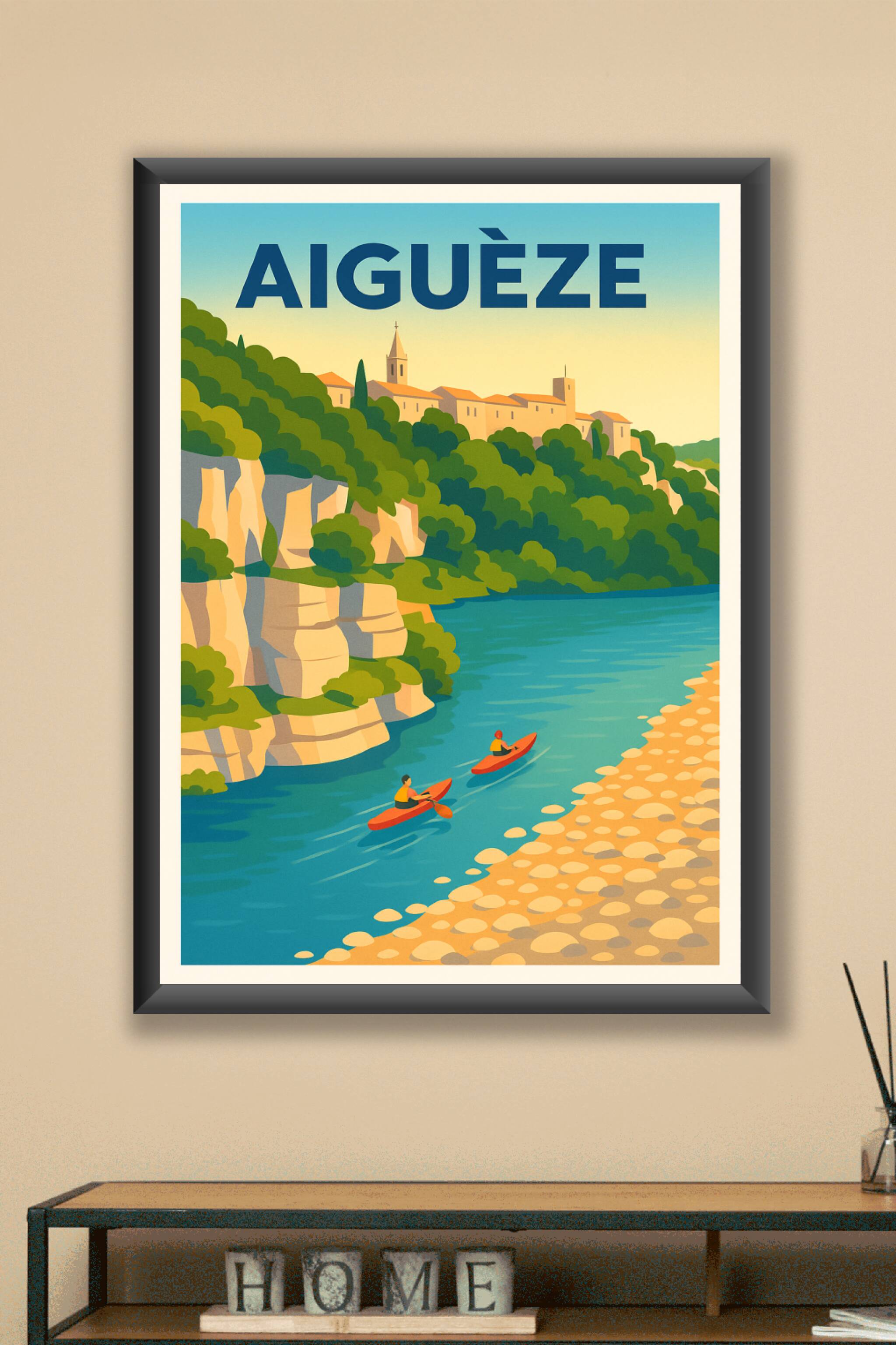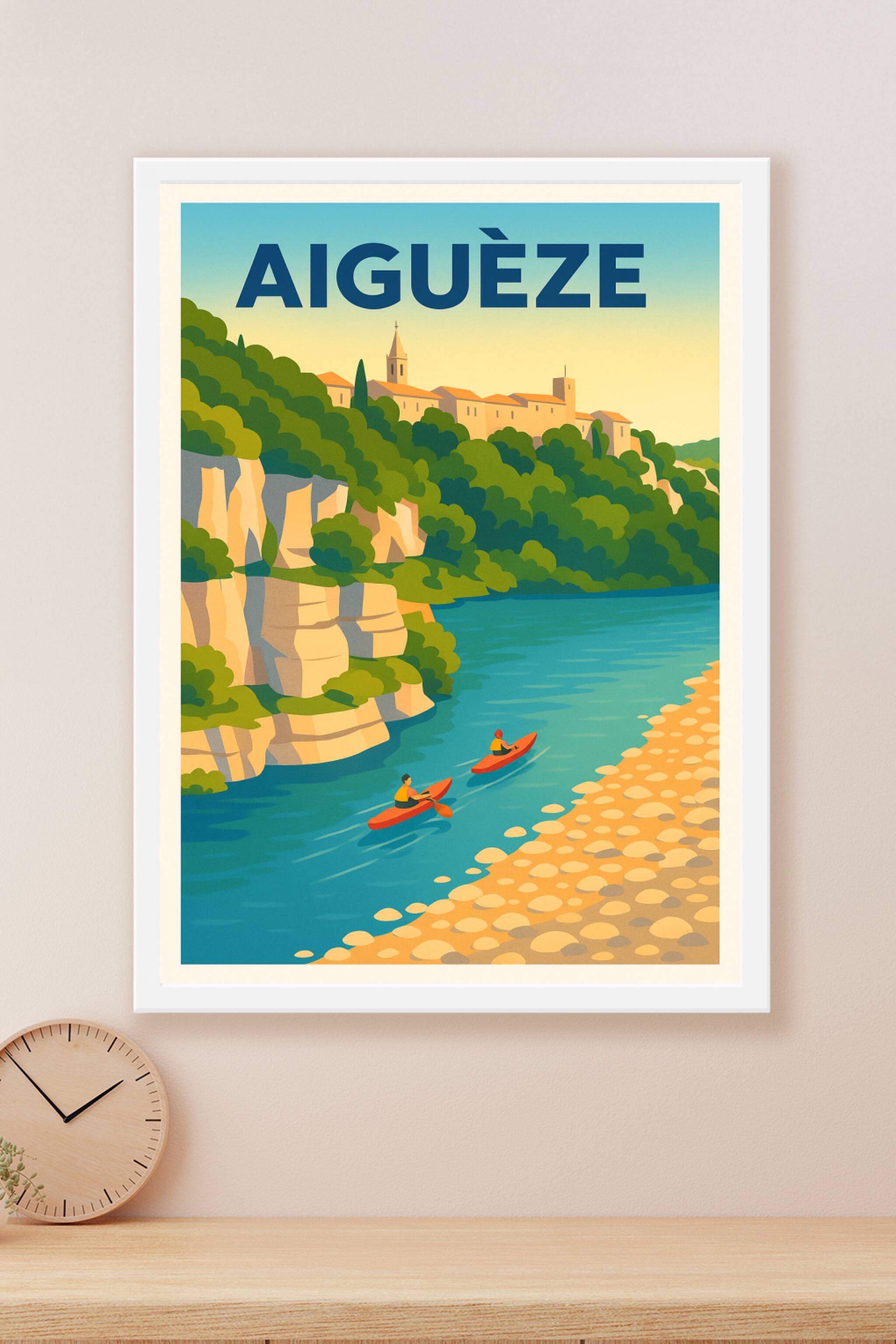 Découvrez le charme pittoresque du village d'Aiguèze avec cette affiche illustrée qui capture à merveille la douceur de vivre au bord de la rivière...