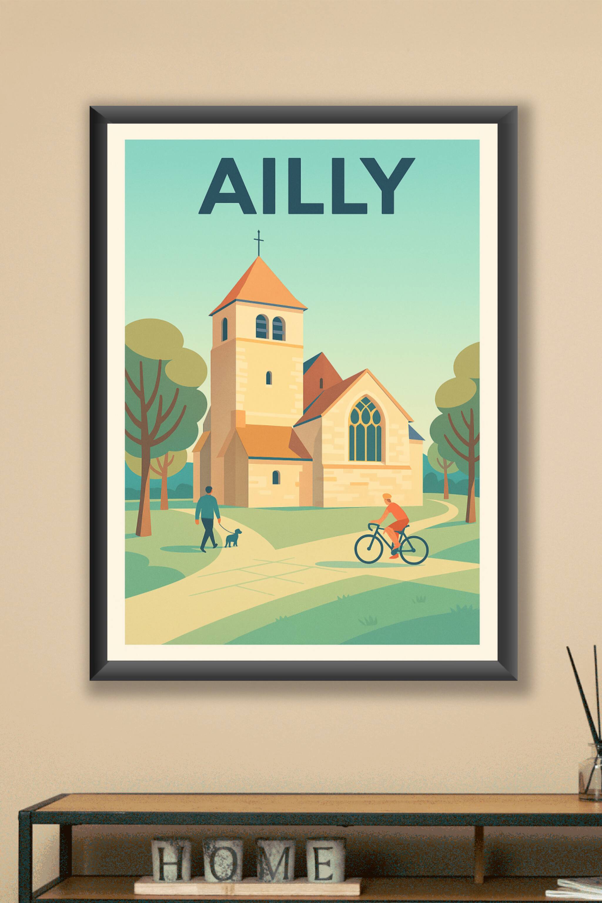 Découvrez le calme et la douceur de vivre d'Ailly avec cette affiche au graphisme épuré et moderne représentant une église typique au milieu d'un parc verdoyant. Ce poster met en scène des instants de quiétude avec un promeneur et un cycliste, symbole d'une vie harmonieuse au rythme de la nature.Cette affiche est imprimée en tirage "Fine Art" sur un papier 305g coton de haute qualité garantissant des couleurs éclatantes et une durabilité optimale. Disponible dans les formats A1, A2, A3 et A4, avec ou sans cadre, ce poster s'adapte parfaitement à tous les espaces, que ce soit pour un intérieur cosy ou un bureau accueillant.Apportez une touche d'authenticité et de sérénité à votre décoration avec cette pièce unique, 100% fabriquée en France, idéale pour les amoureux des petits villages et du patrimoine local.