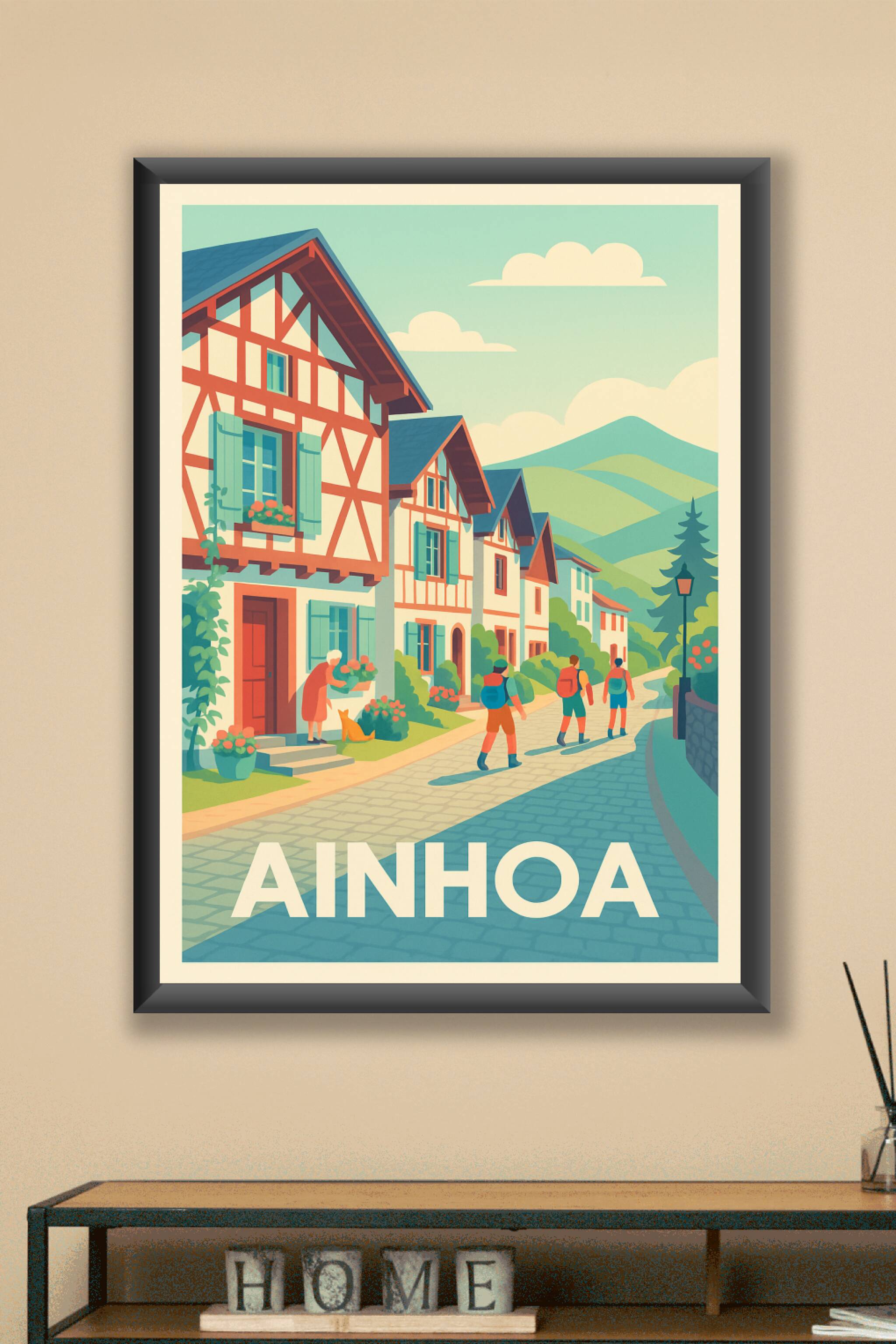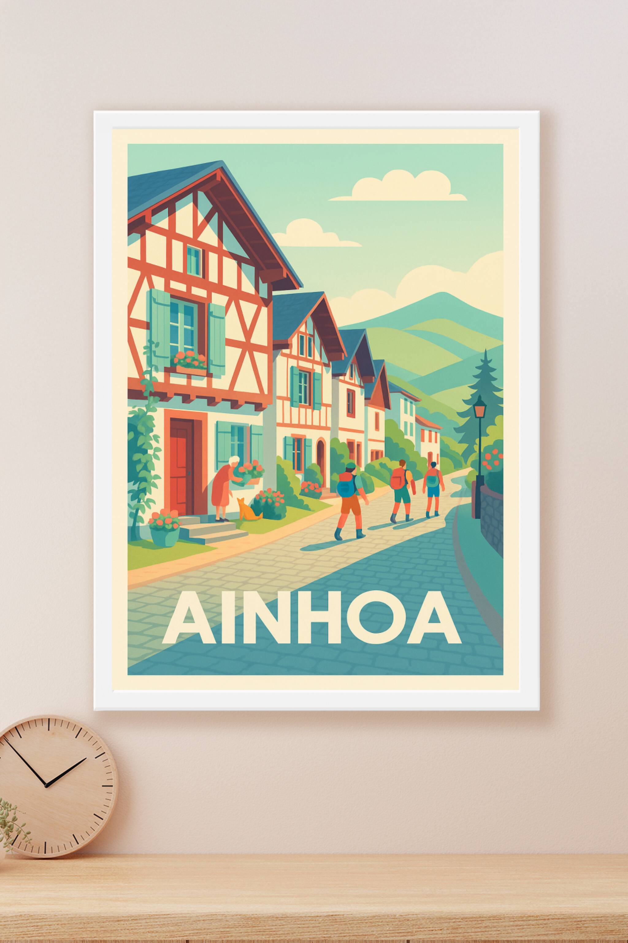 Découvrez la douceur de vivre à Ainhoa avec cette affiche illustrée mettant en scène ses maisons traditionnelles basques au colombage rouge et vole...