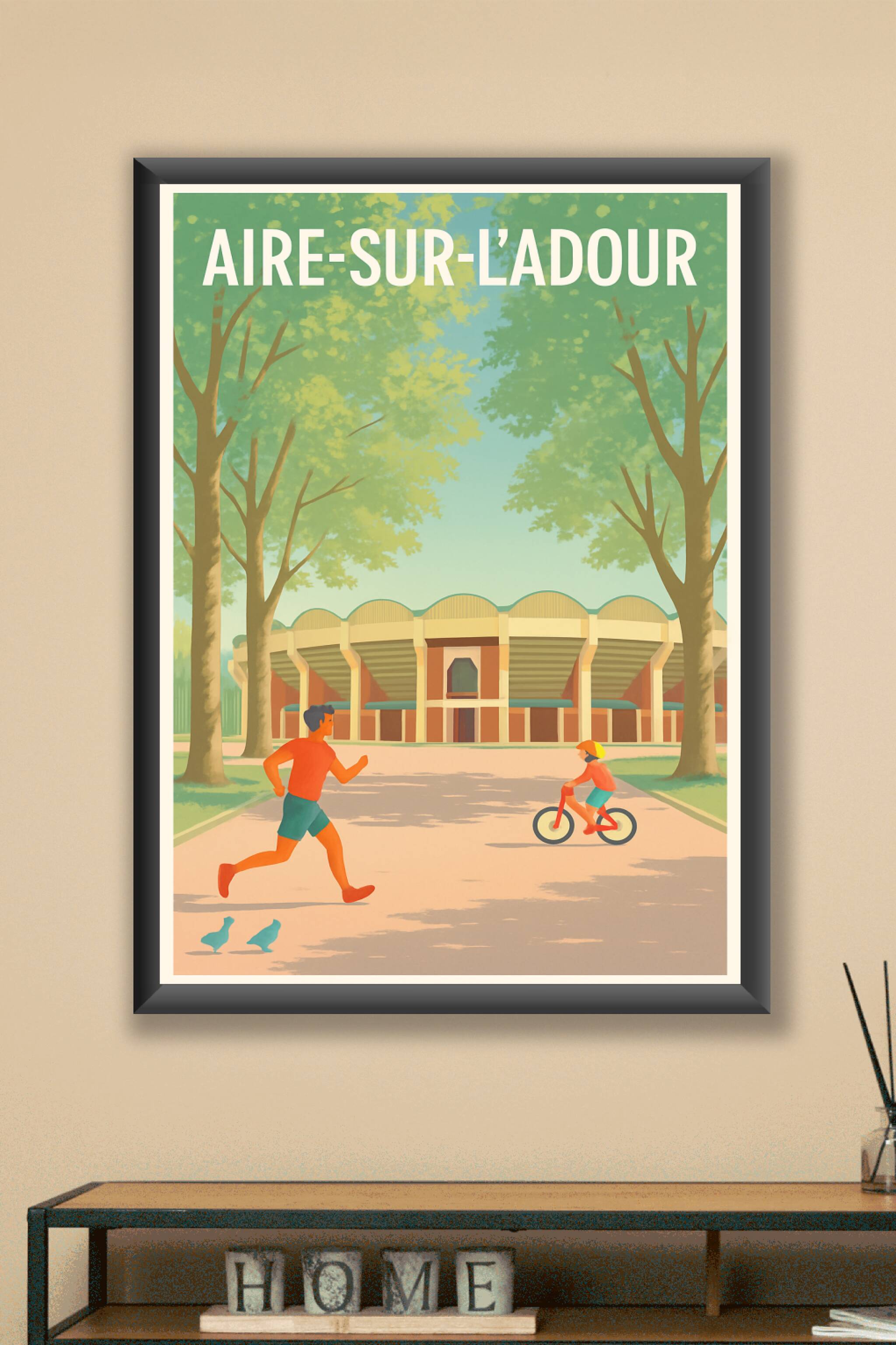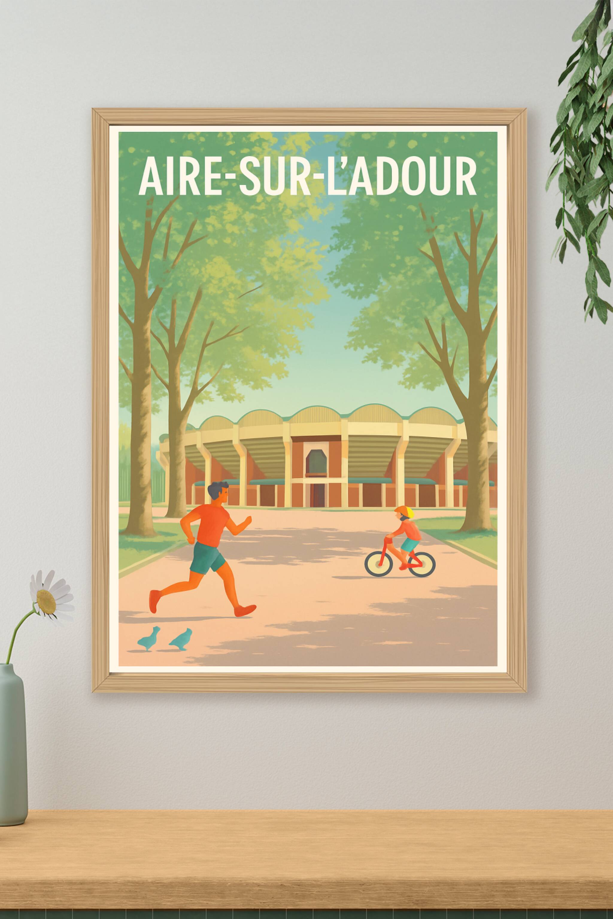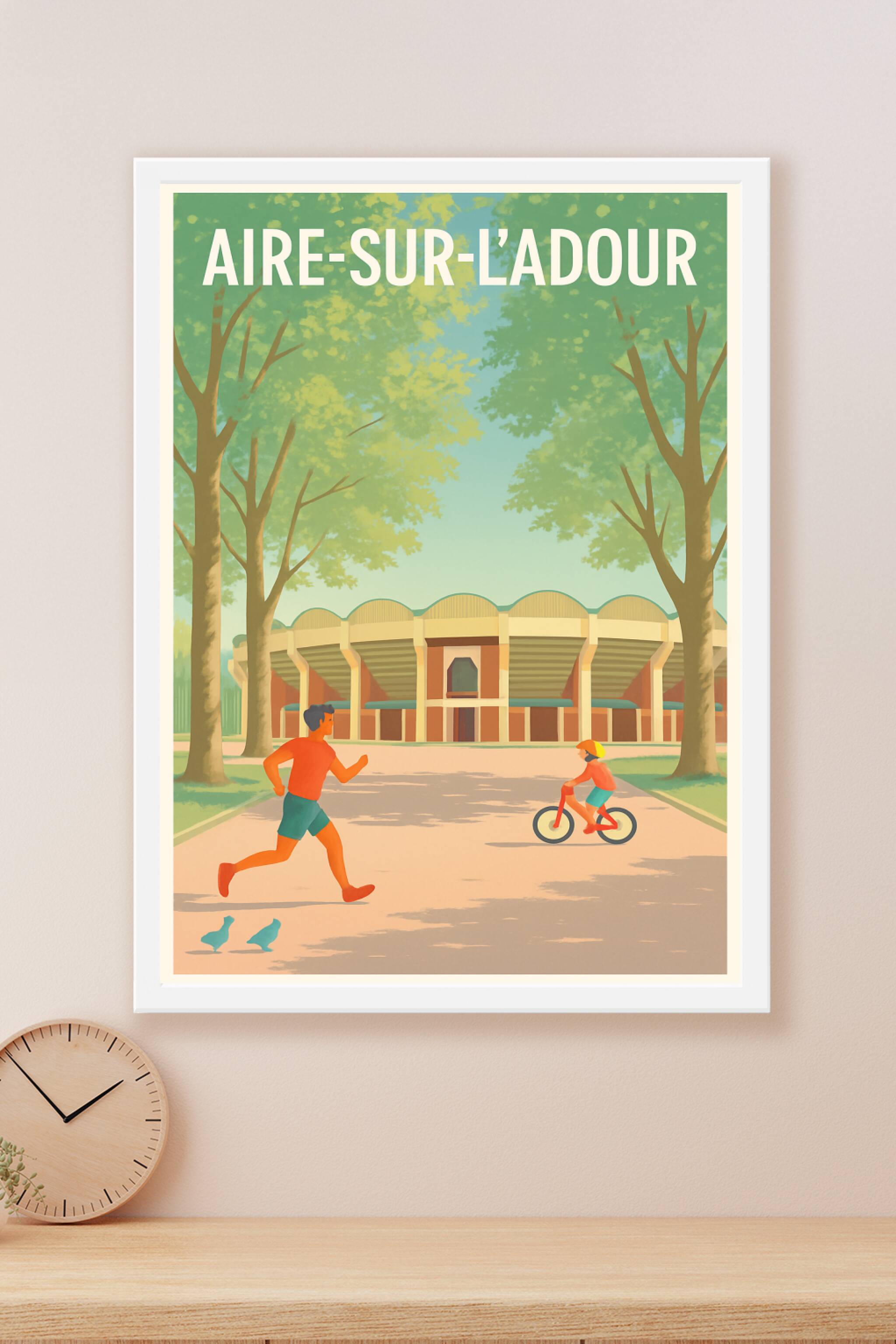 Découvrez ce poster illustré qui capture l'ambiance paisible et dynamique d'Aire-sur-l'Adour, où un coureur et un enfant à vélo évoluent sous les f...