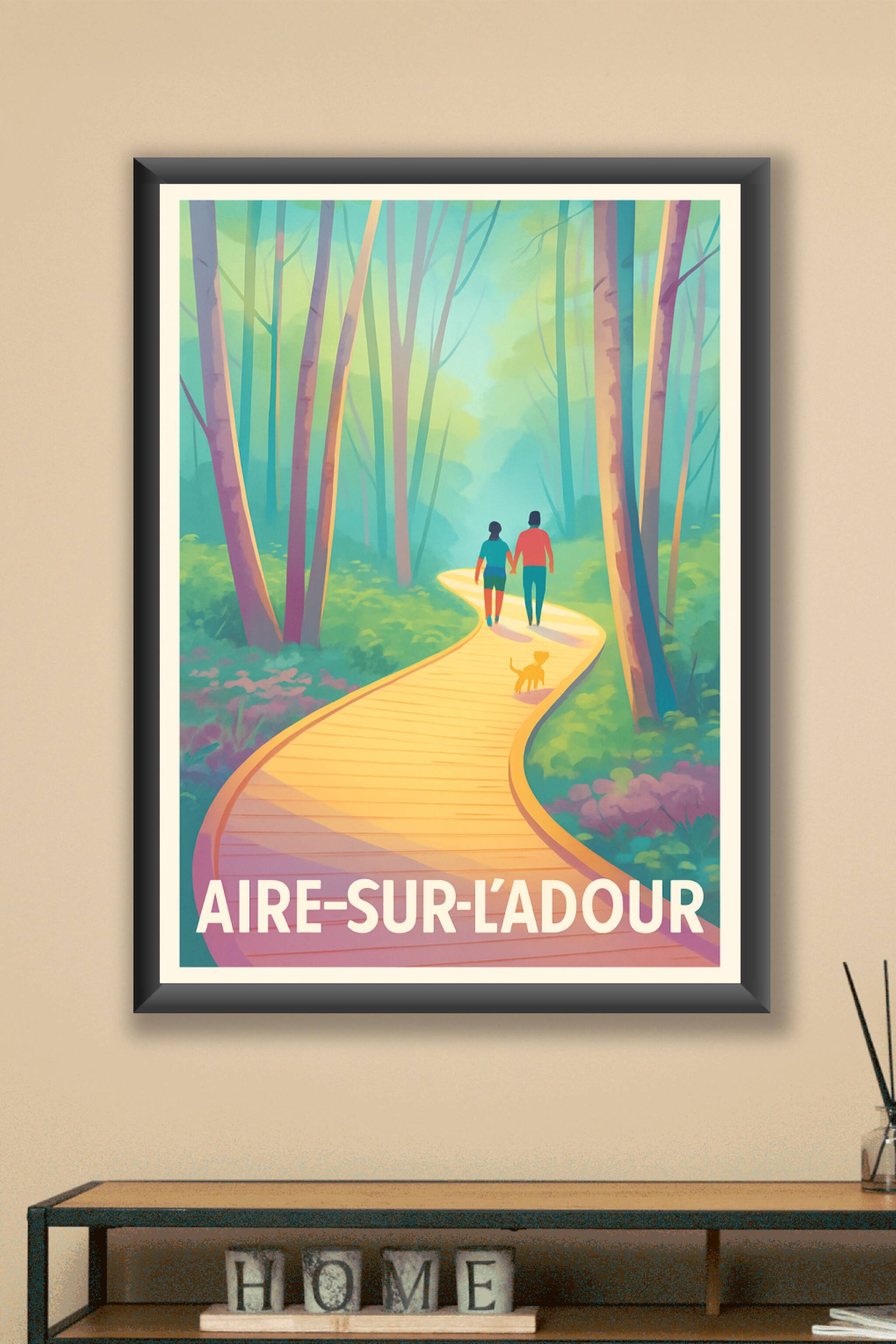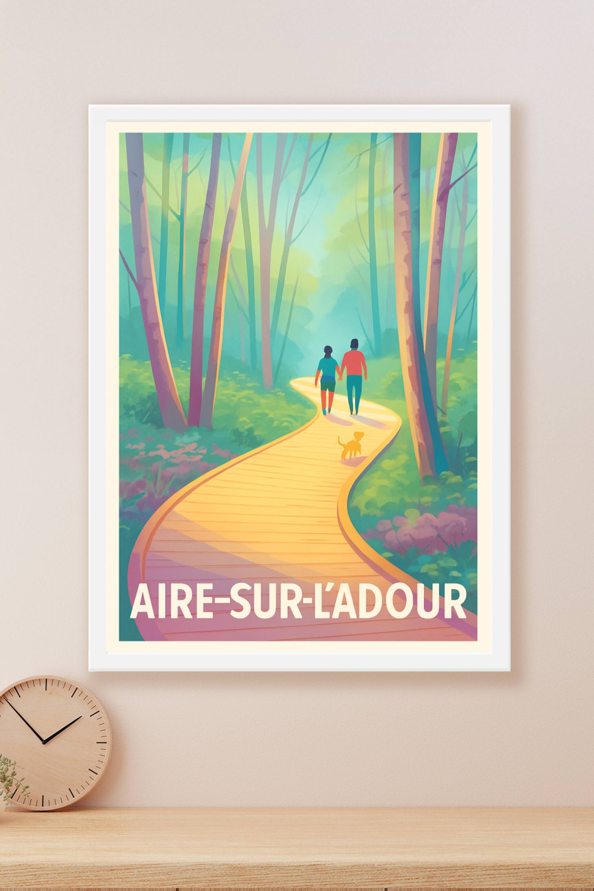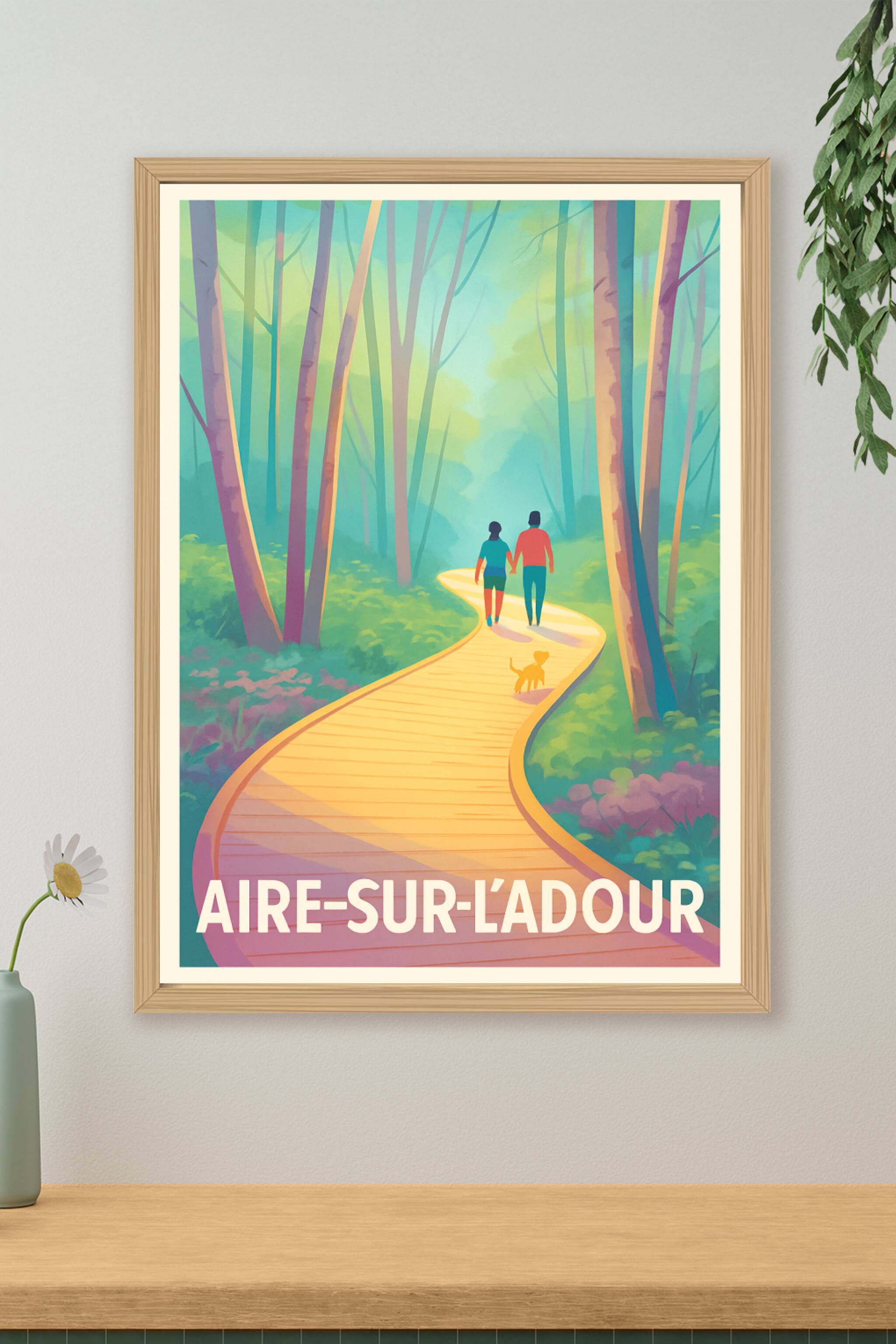 Découvrez la sérénité et la douceur de vivre d'Aire-sur-l'Adour à travers cette affiche illustrée mettant en scène un couple et leur chien lors d'u...