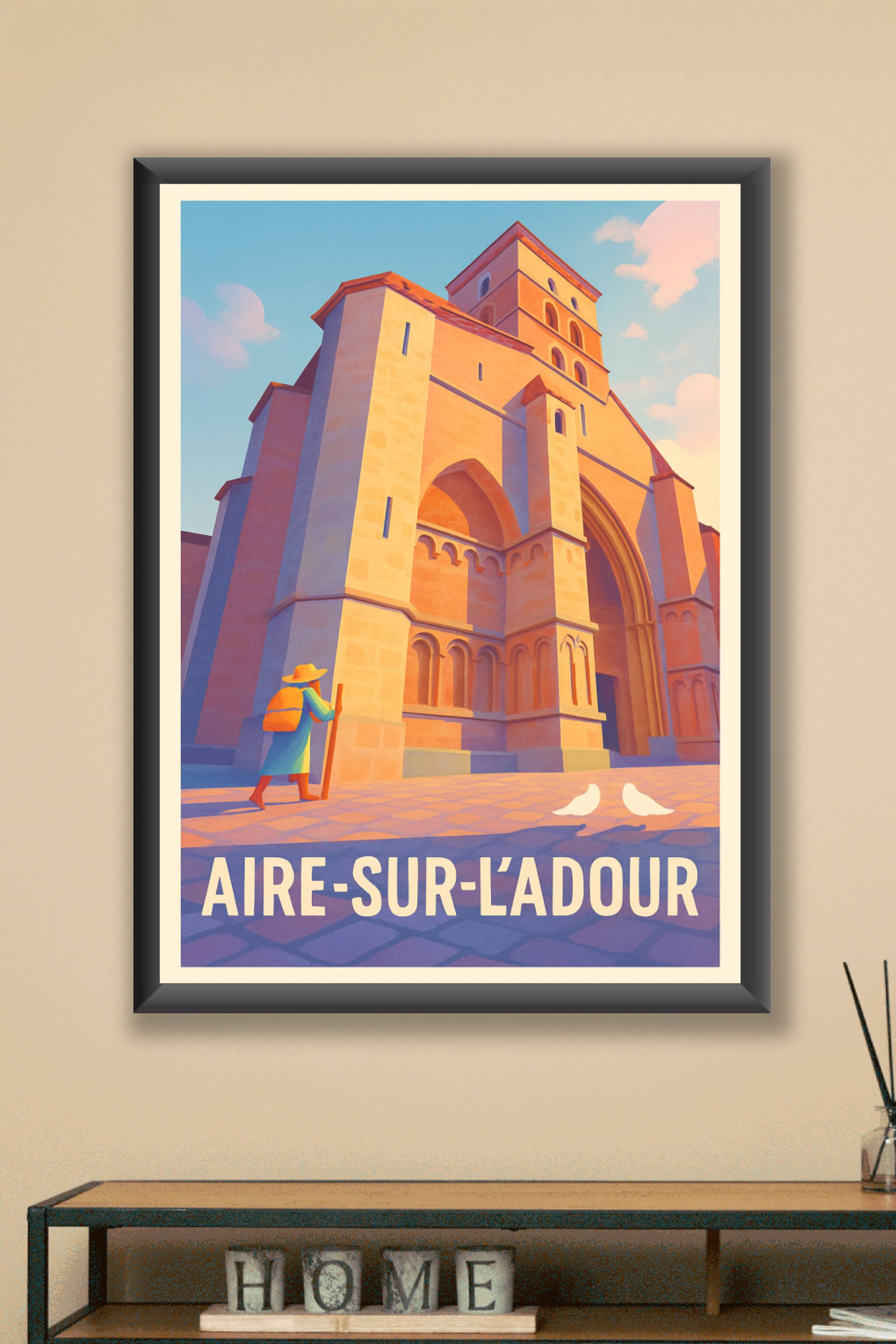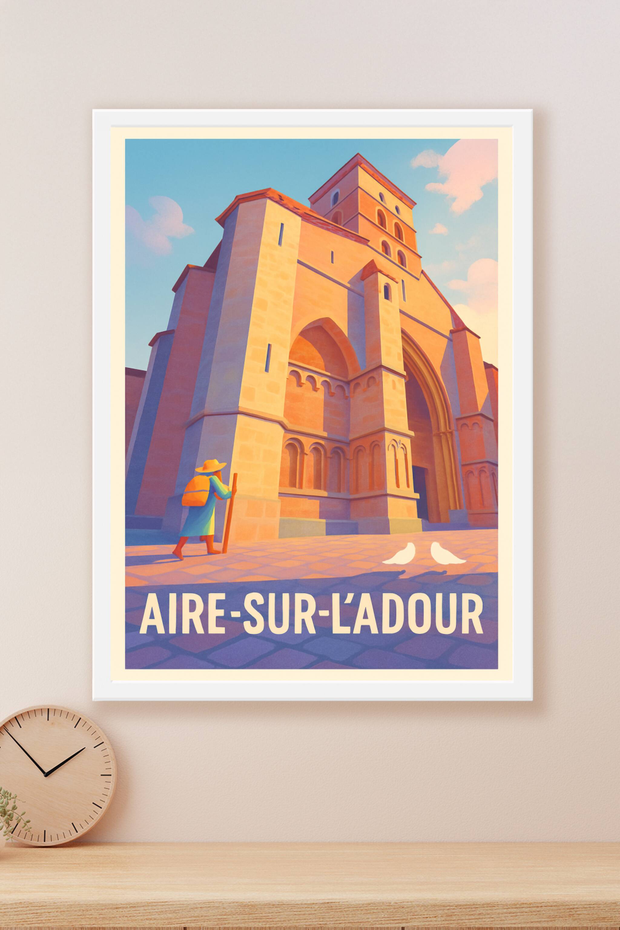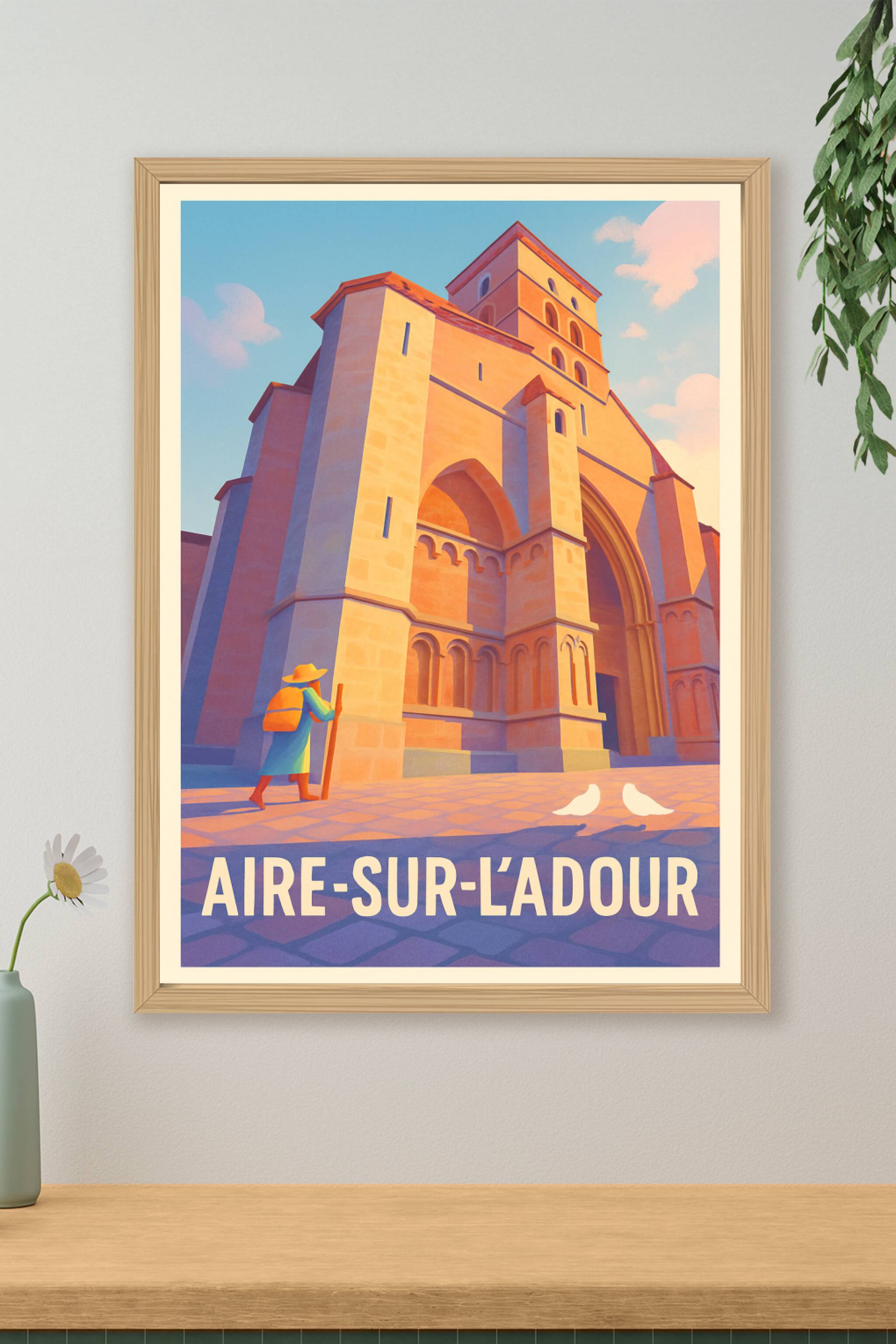 Découvrez l'élégance intemporelle d'Aire-sur-l'Adour avec cette affiche aux couleurs chaudes et apaisantes, qui met en valeur l'architecture impres...