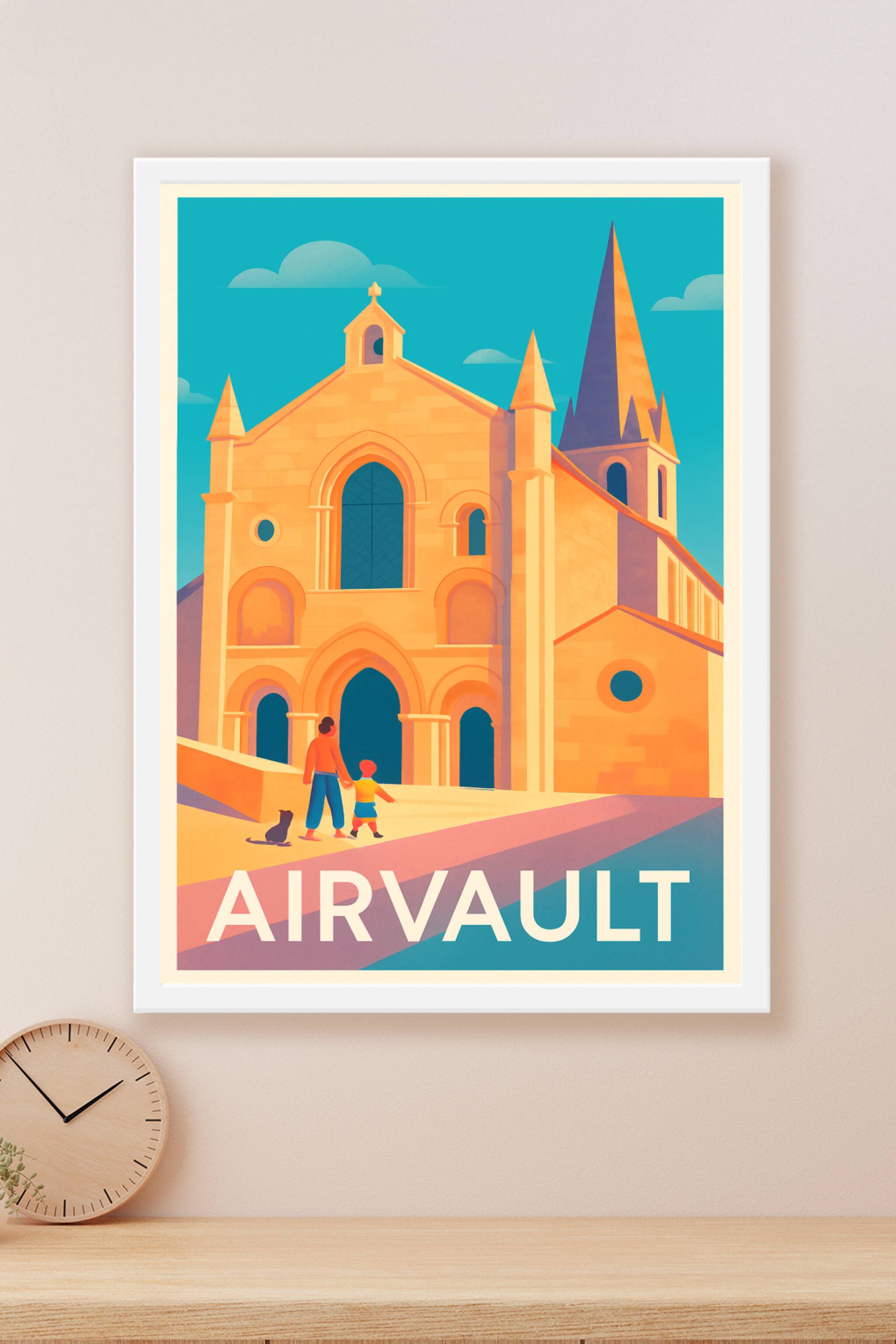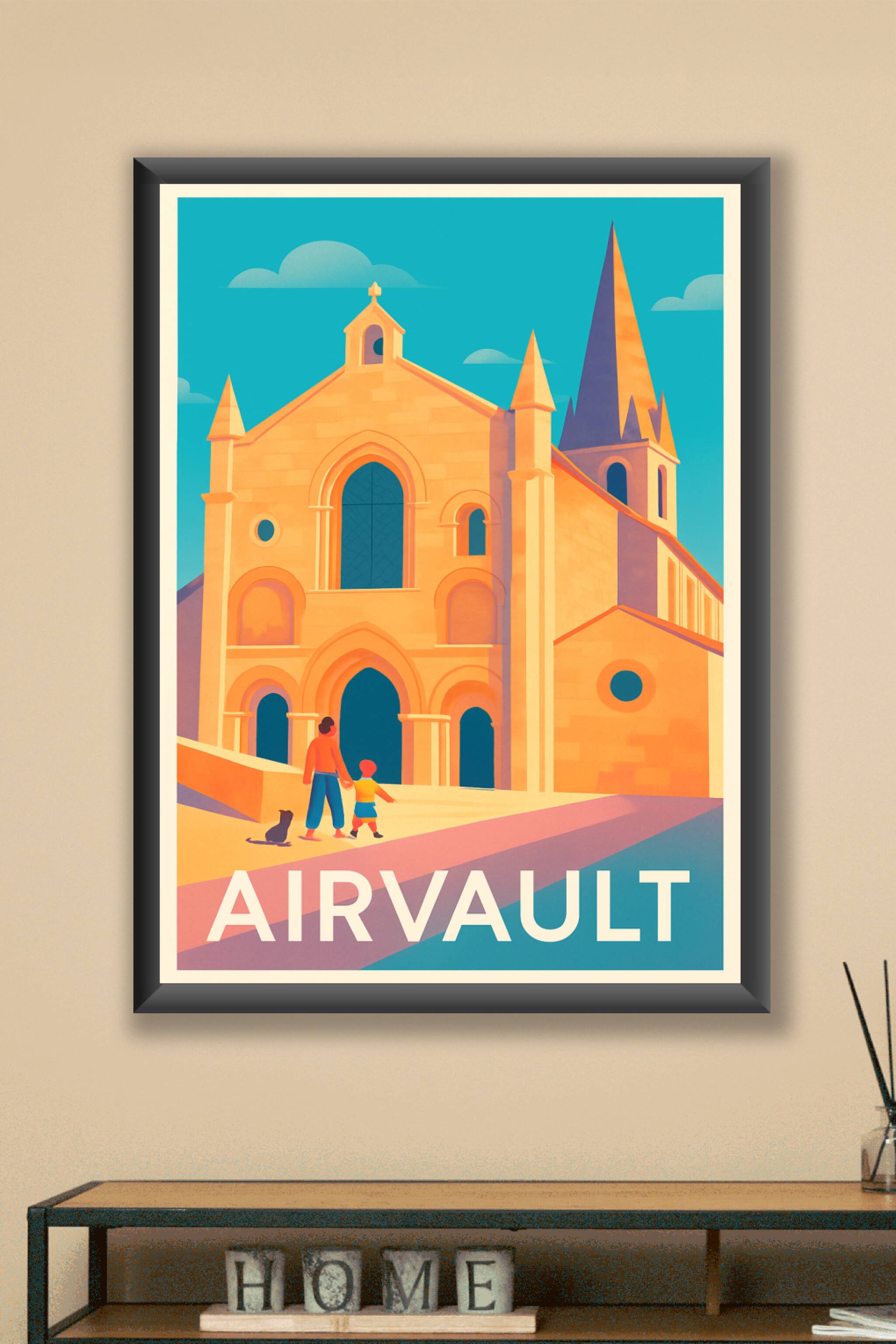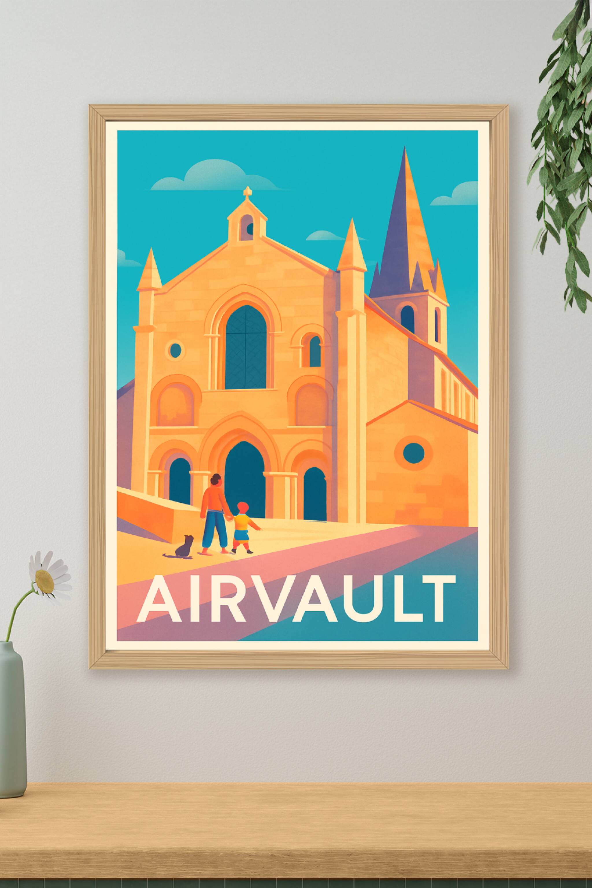 Découvrez la beauté historique et architecturale d’Airvault avec cette affiche vintage illustrée, mettant en lumière l’abbaye sous une lumière douc...