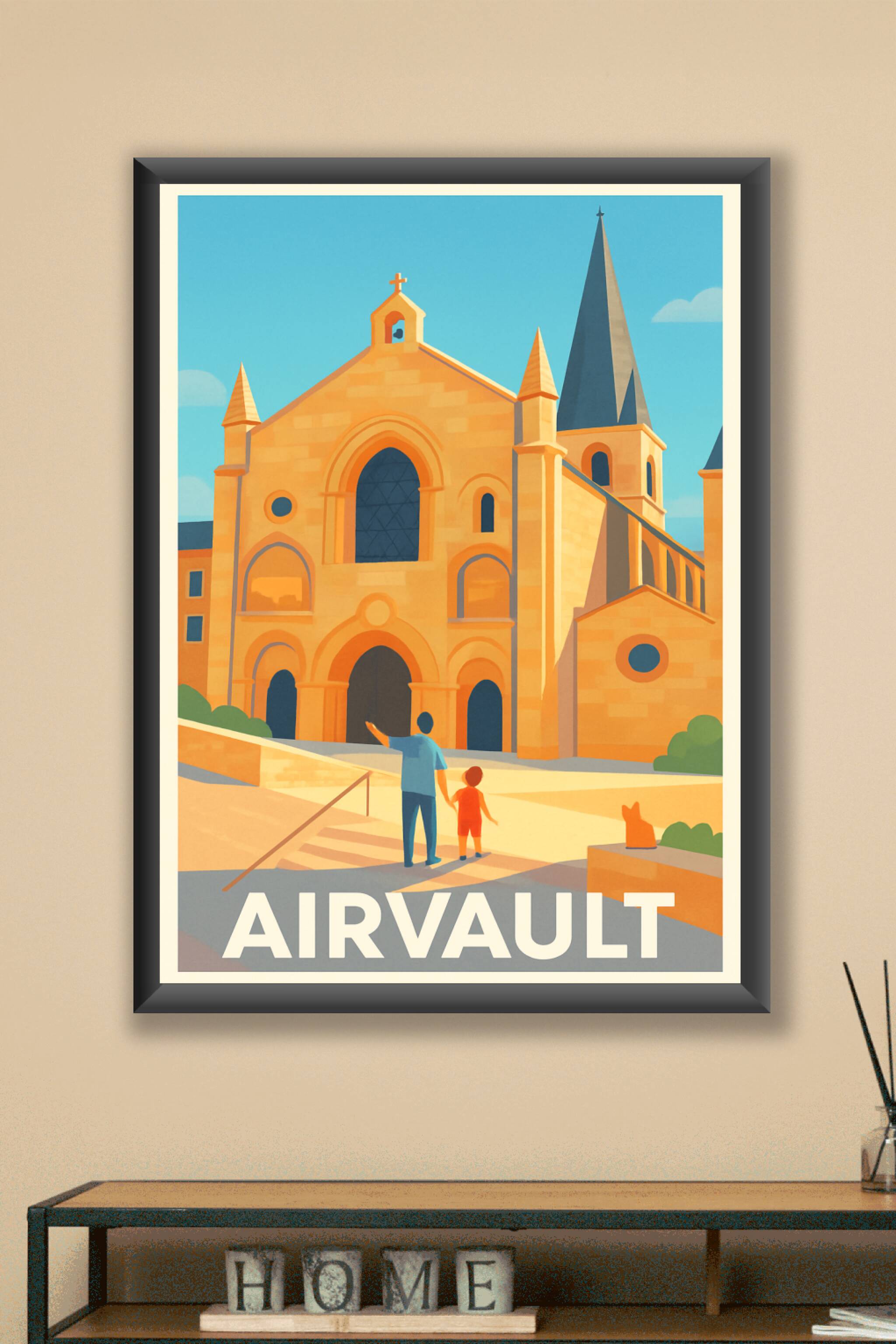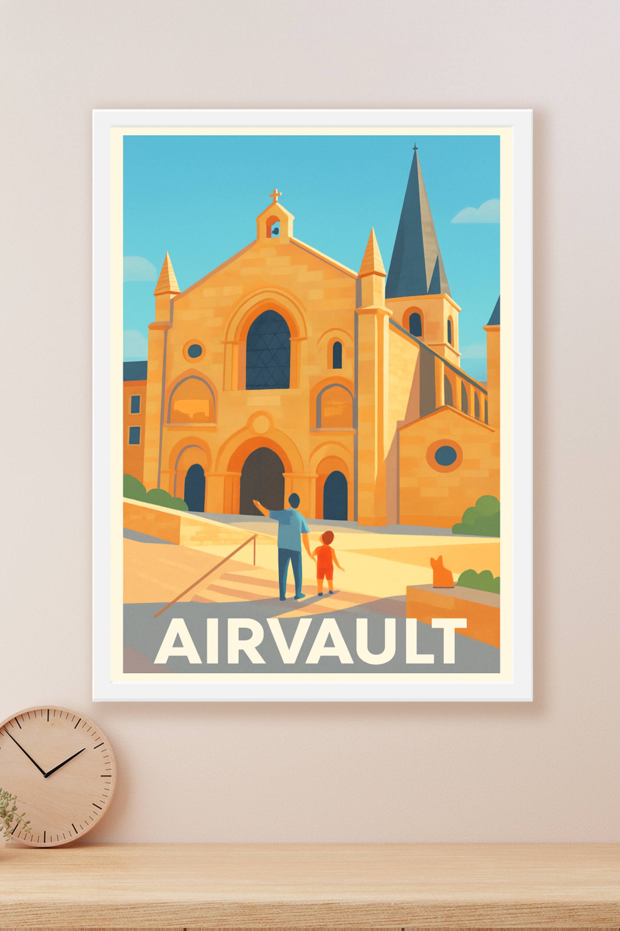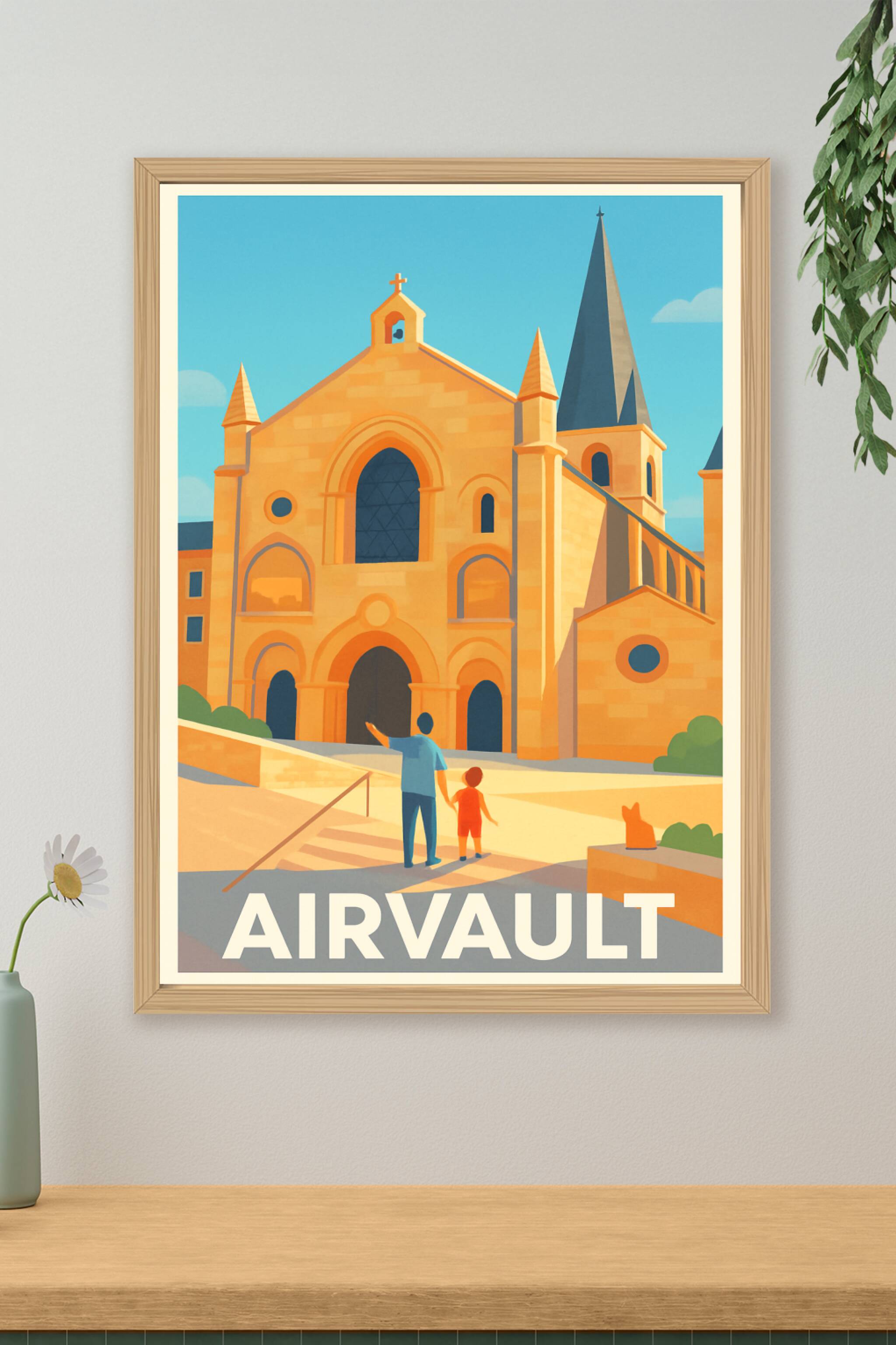 Découvrez la beauté intemporelle d'Airvault à travers cette affiche illustrée mettant en avant l'architecture remarquable de son église. Cette scèn...
