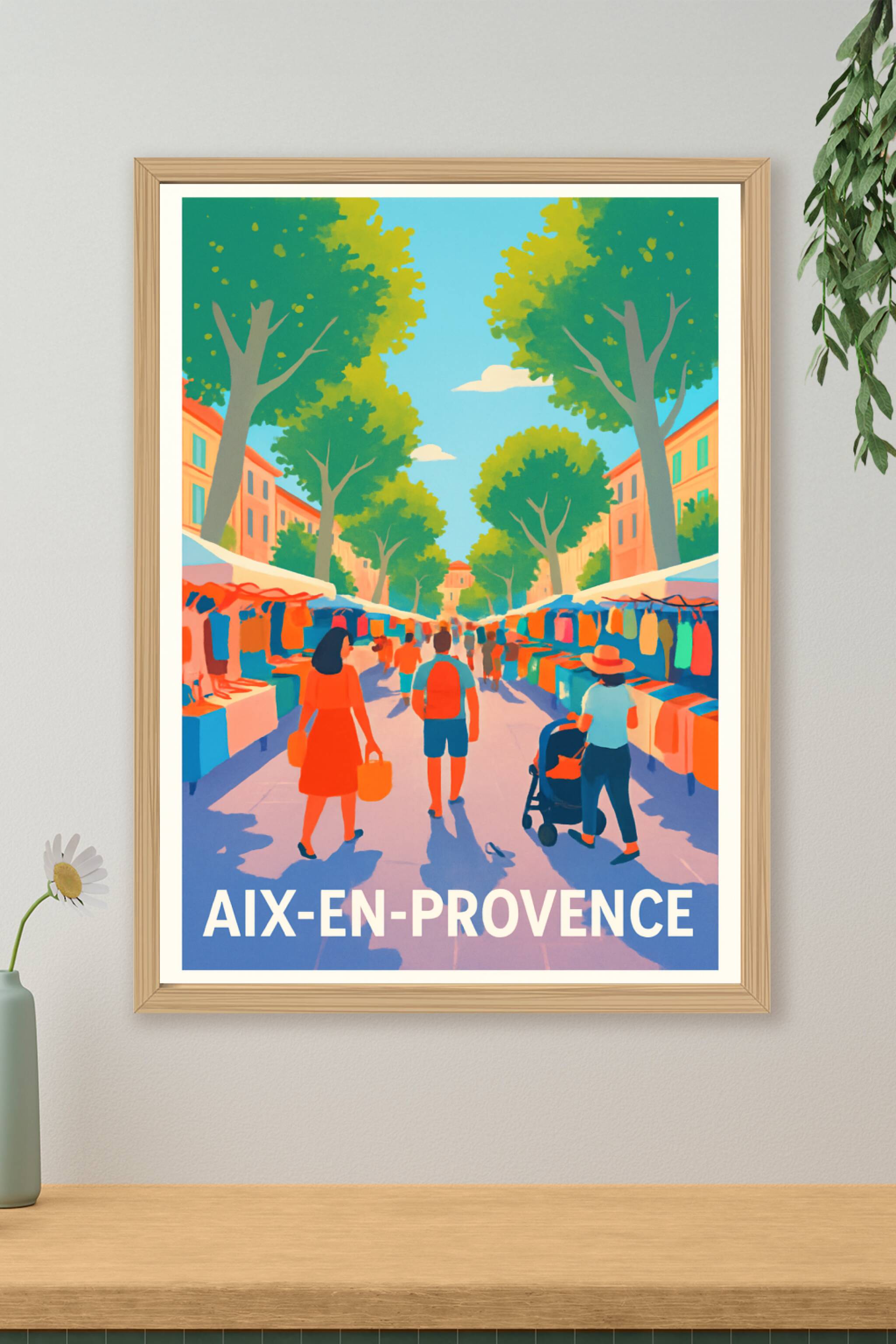 Découvrez l'atmosphère chaleureuse et colorée d'Aix-en-Provence avec cette affiche illustrant un marché typique sous un ciel bleu éclatant. Les arb...