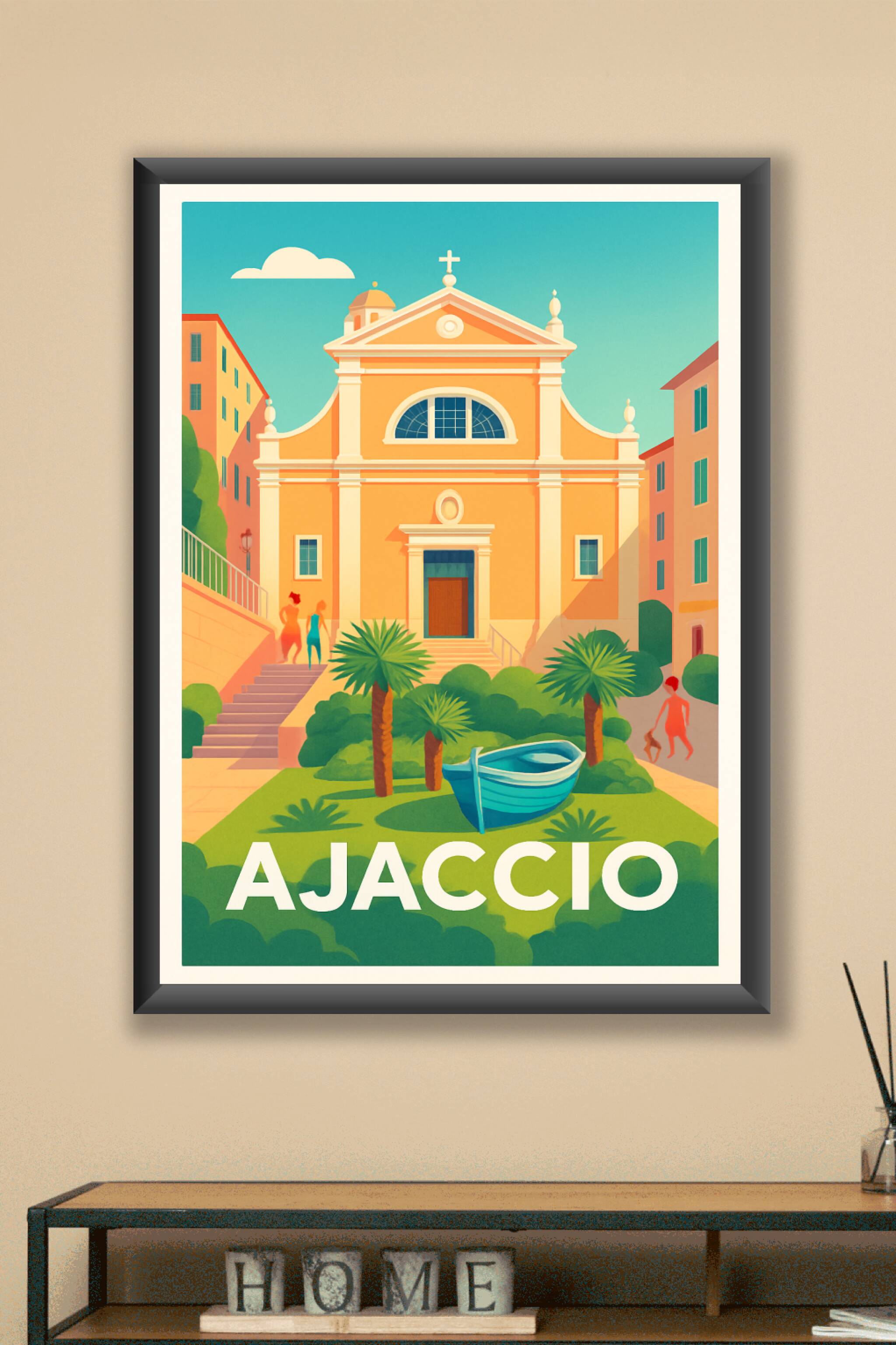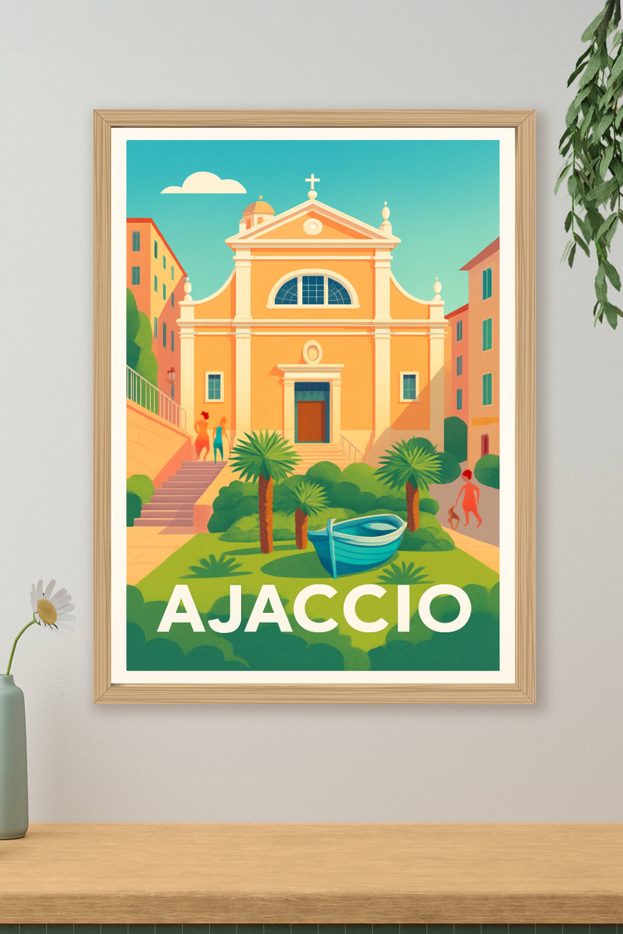 Découvrez le charme unique d'Ajaccio à travers cette affiche illustrée qui capture l'élégance chaleureuse de son architecture et ses tons ensoleill...
