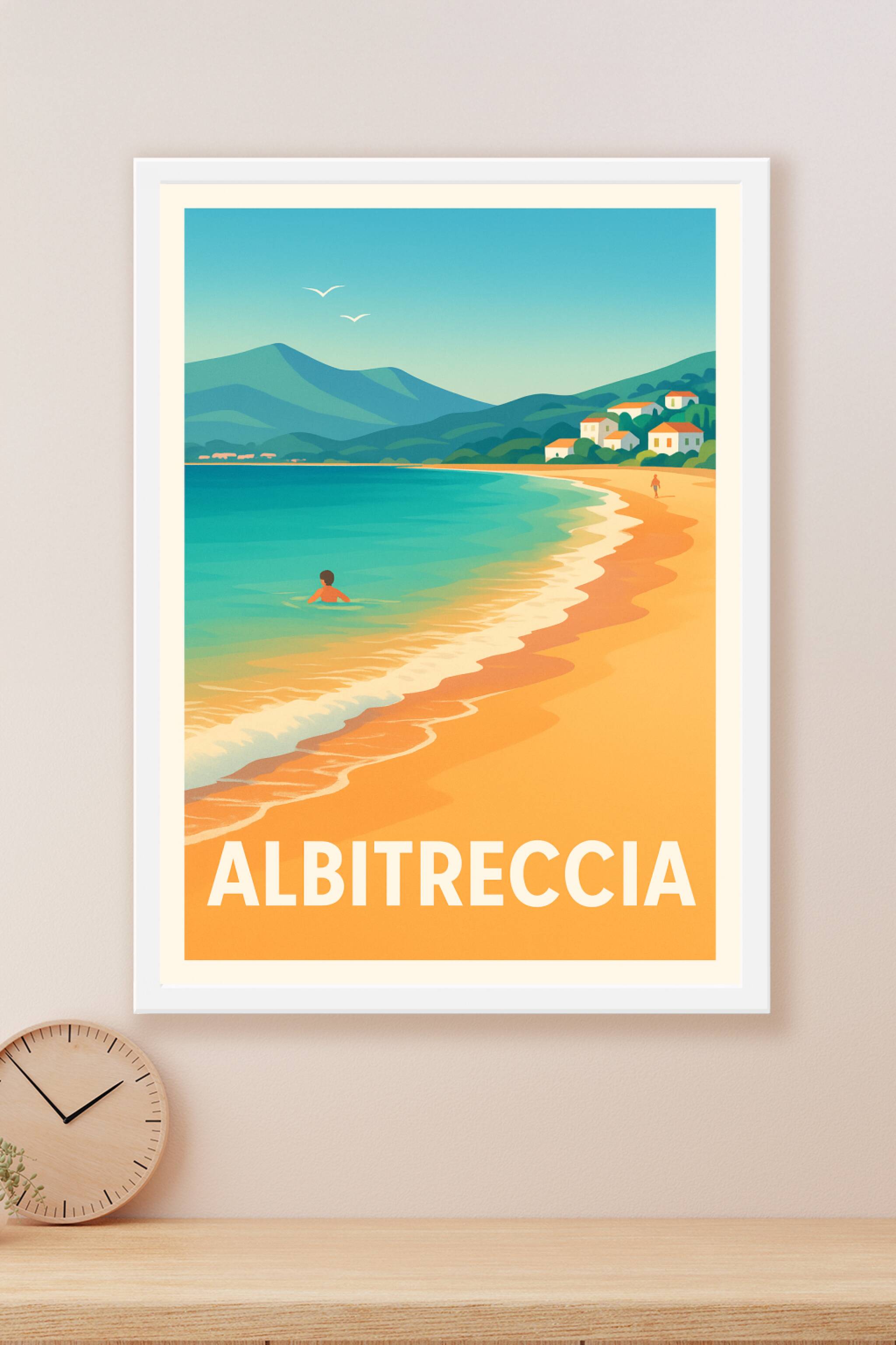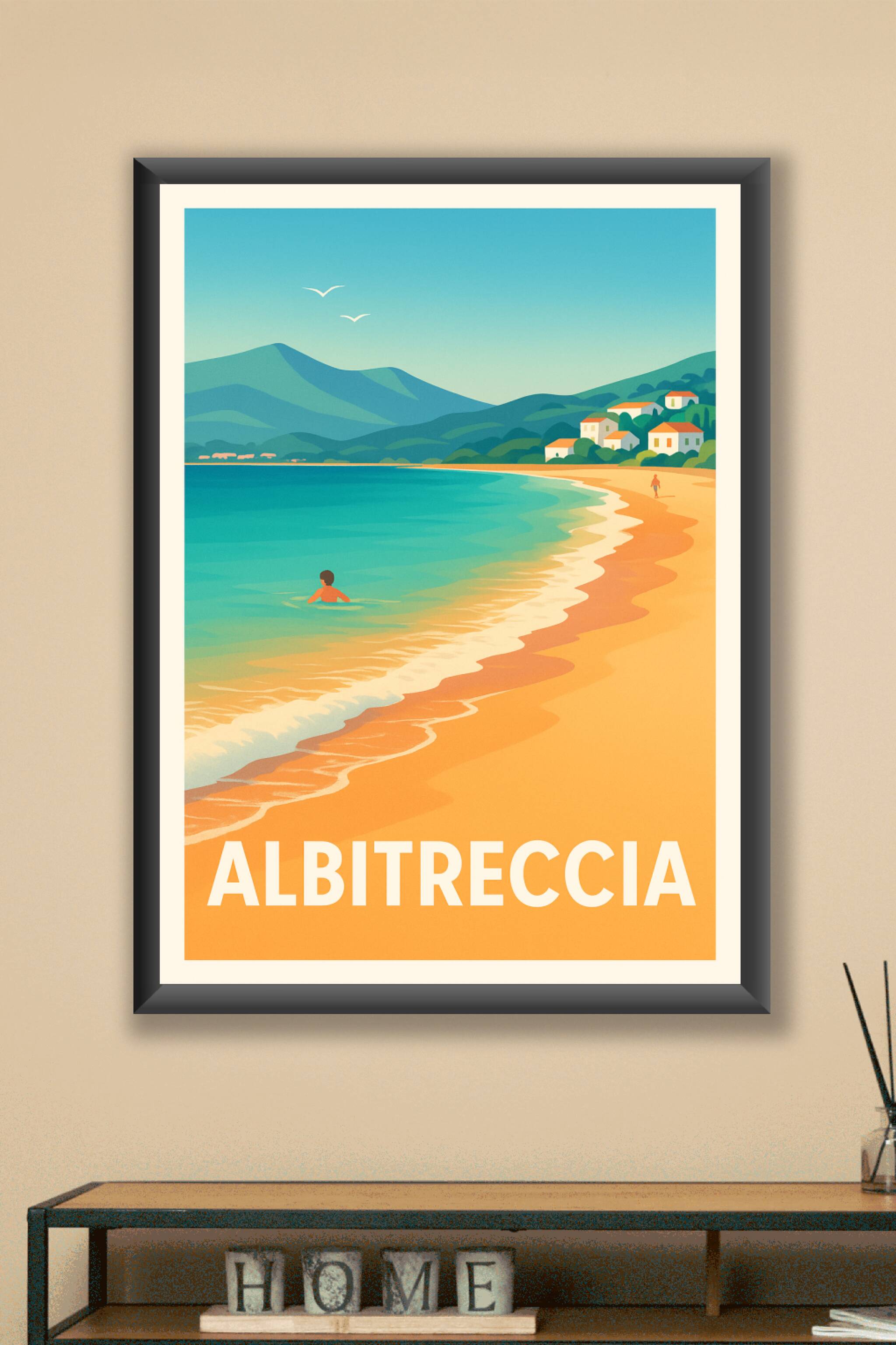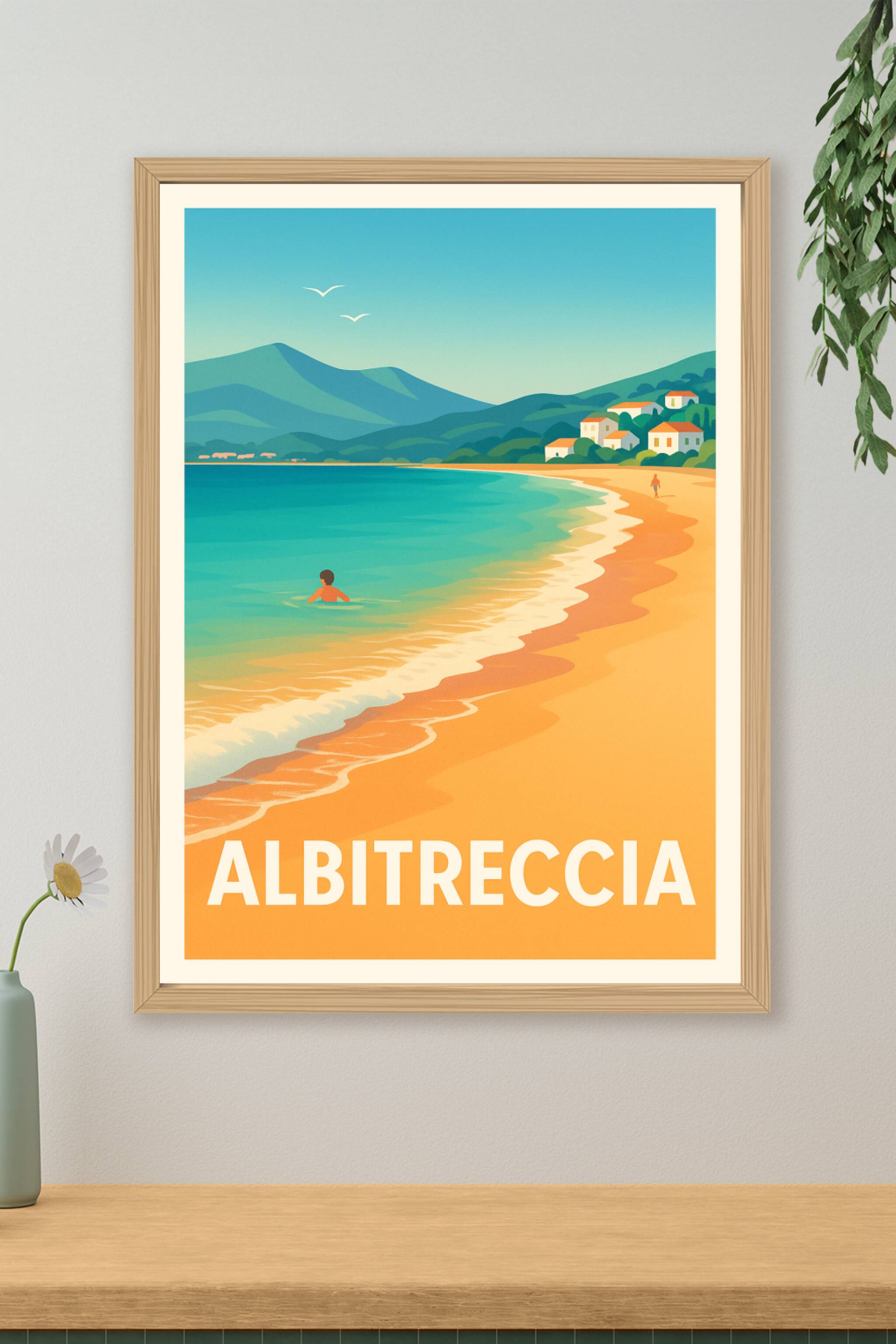 Découvrez l'élégance d'Albitreccia avec cette affiche illustrée qui capture la douceur de vivre balnéaire au cœur de la Corse. Ce poster met en scè...