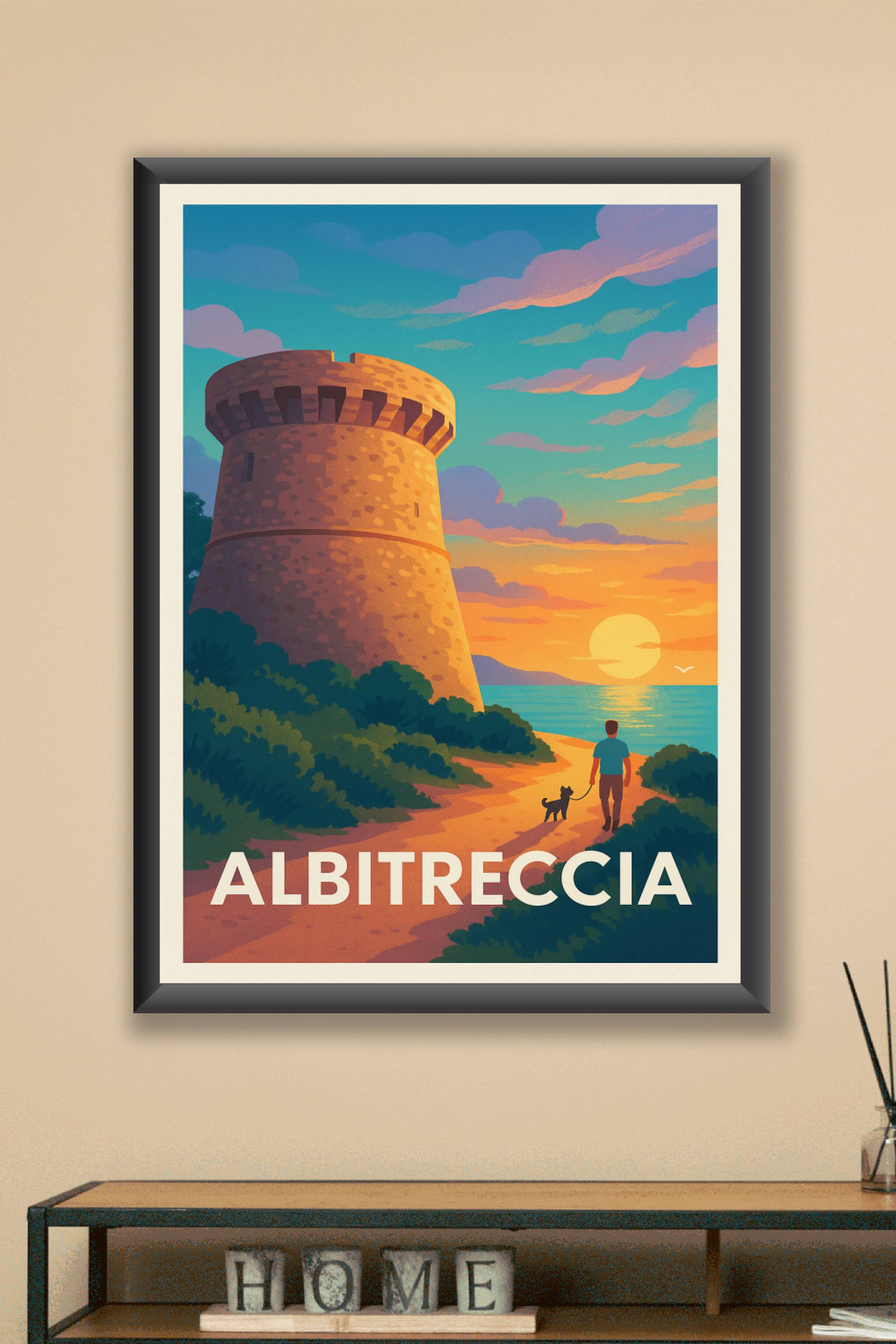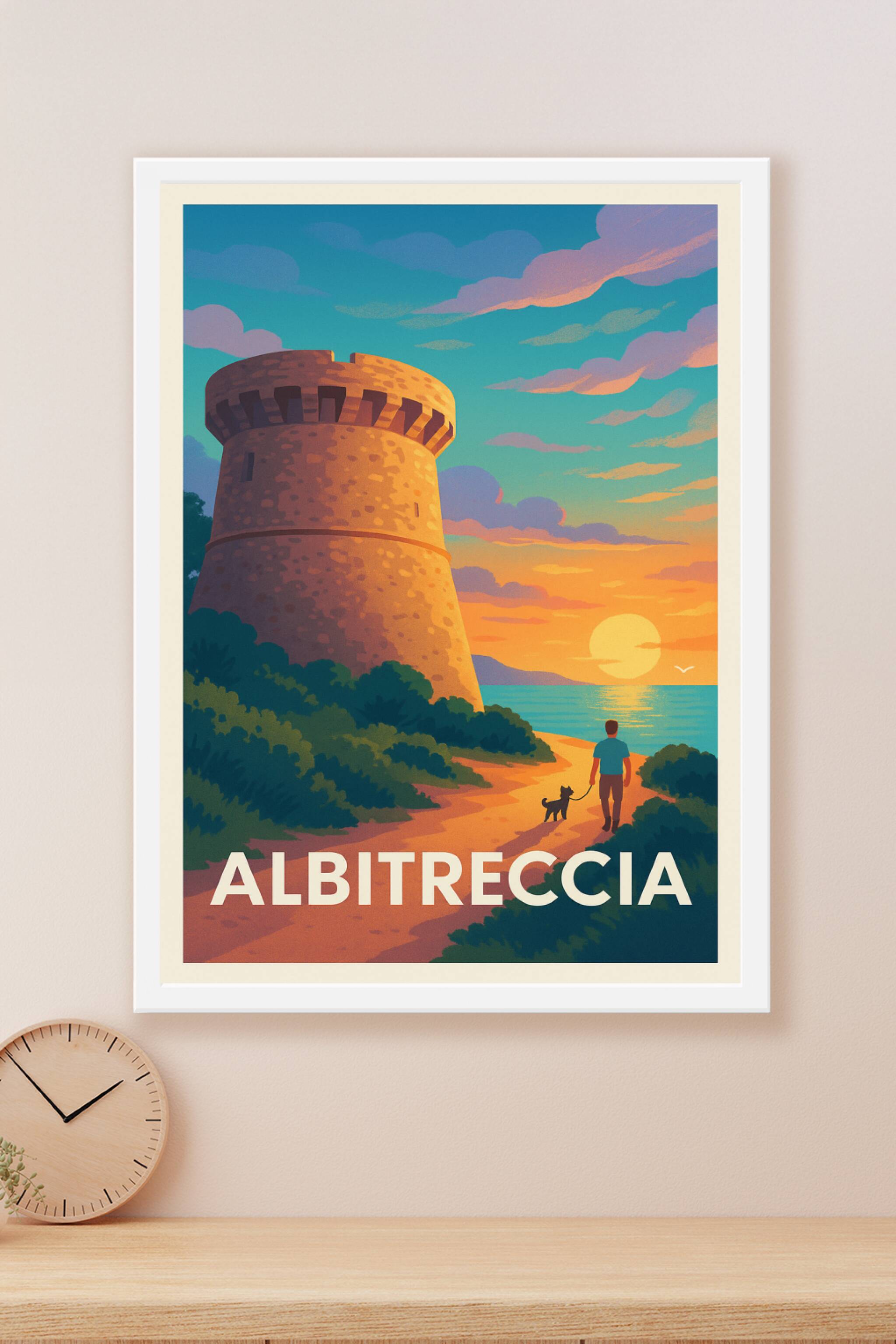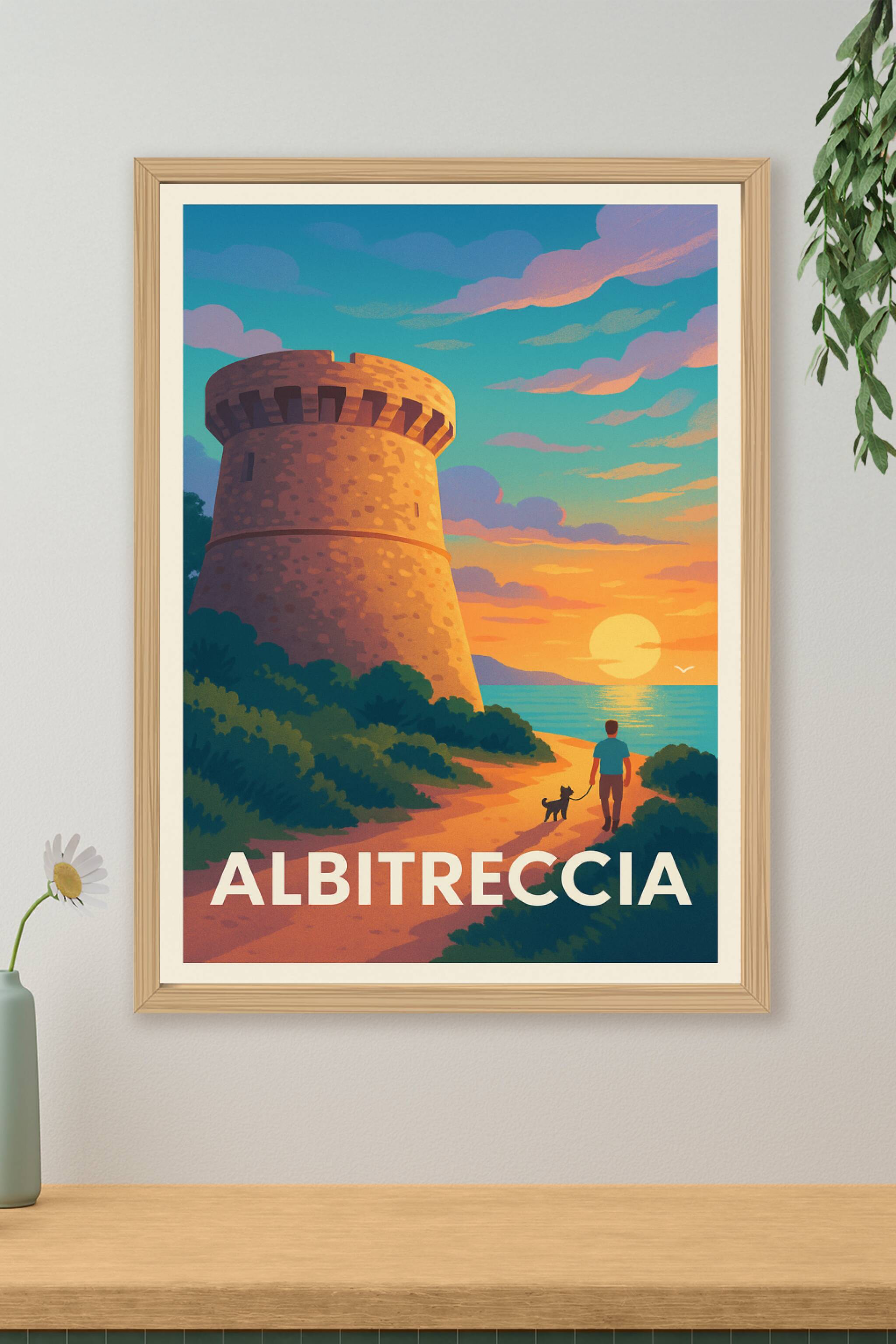 Découvrez la douceur d'Albitreccia avec cette affiche illustrée représentant une promenade paisible au coucher du soleil, à côté d'une tour histori...
