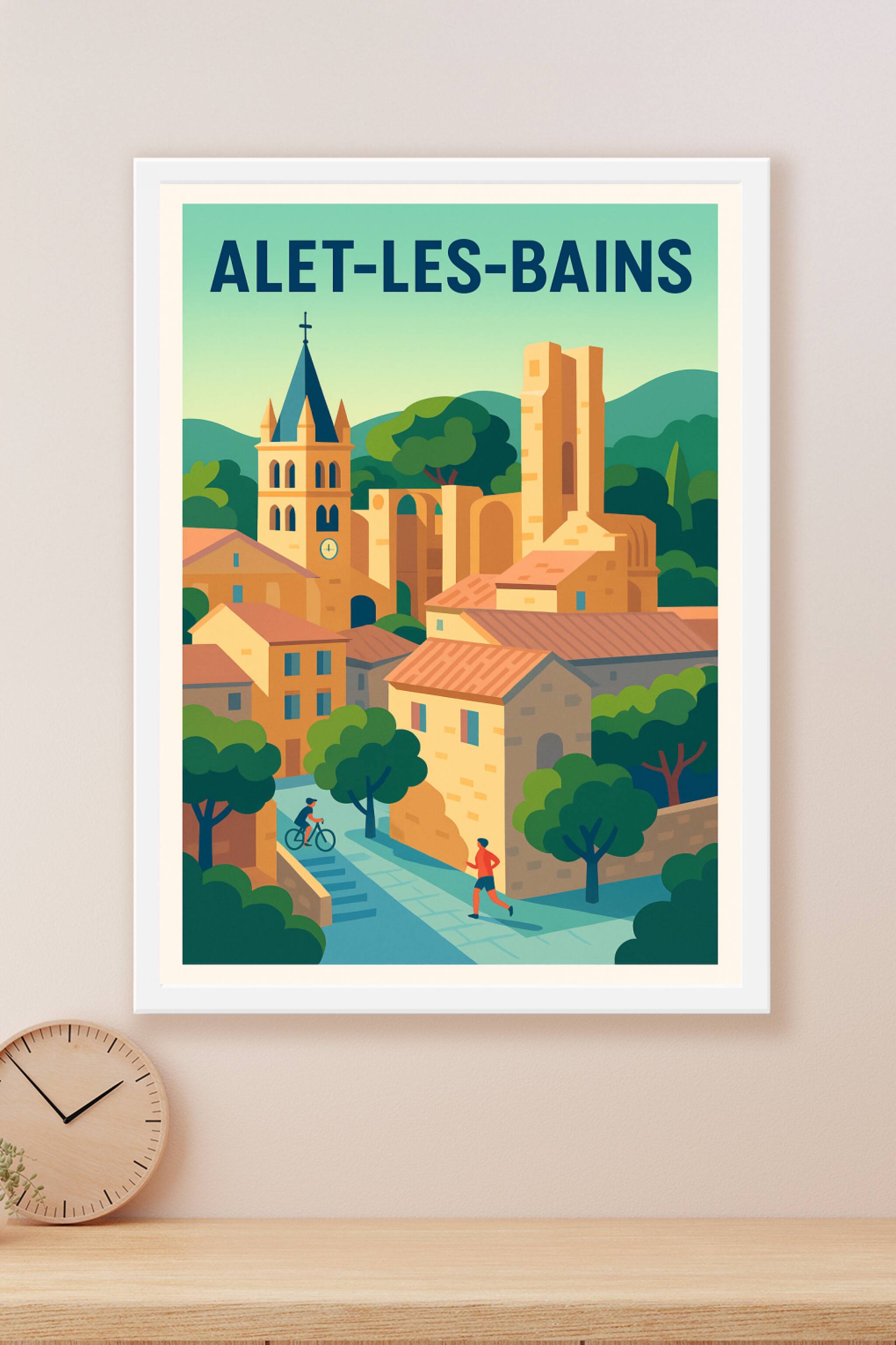 Découvrez l'élégance paisible d'Alet-les-Bains à travers cette affiche illustrée au style vintage et coloré. Cette représentation met en lumière le...