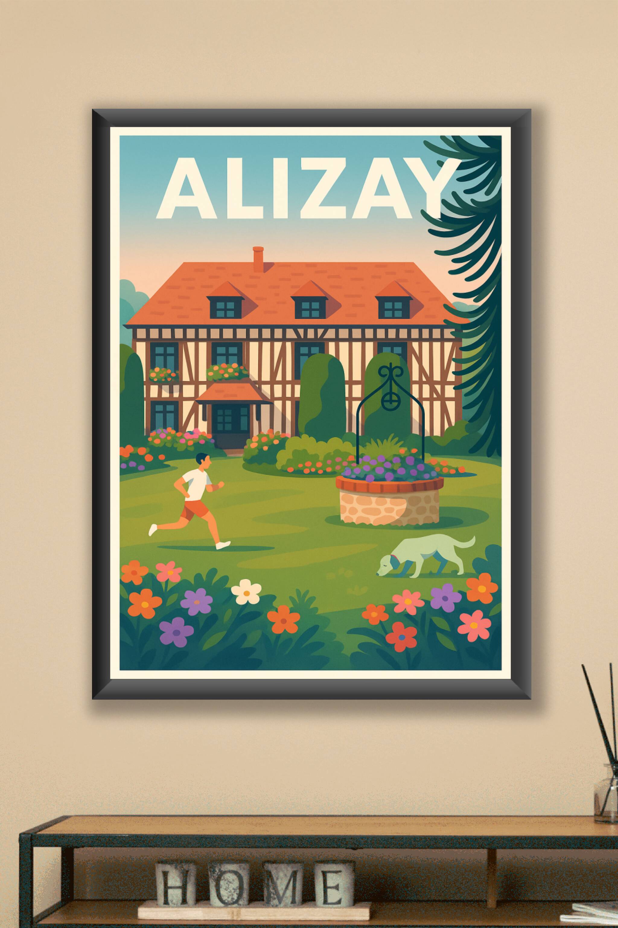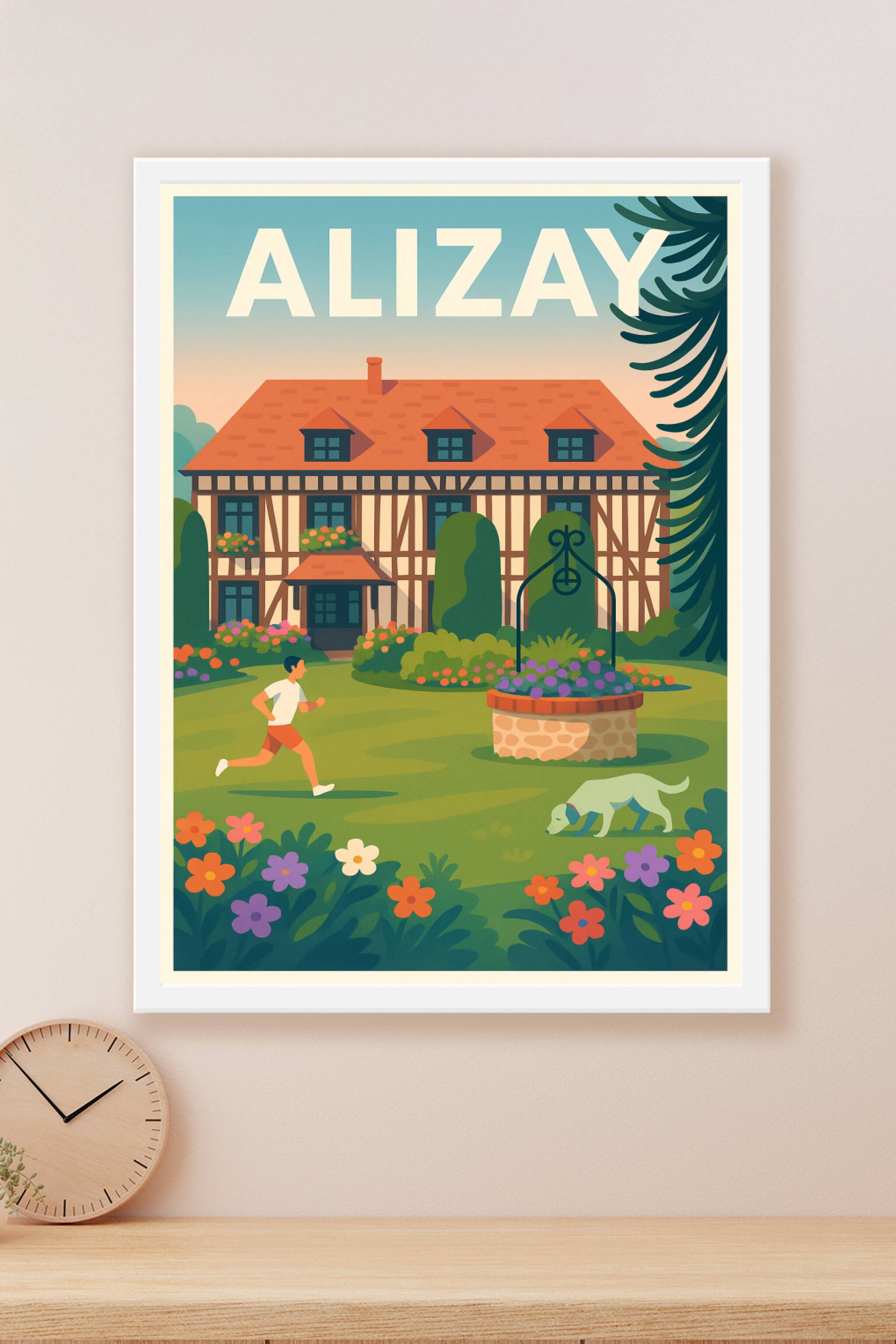 Découvrez le charme authentique d'Alizay avec cette affiche illustrant une maison à colombages typique, entourée d'un jardin fleuri et d'une atmosp...