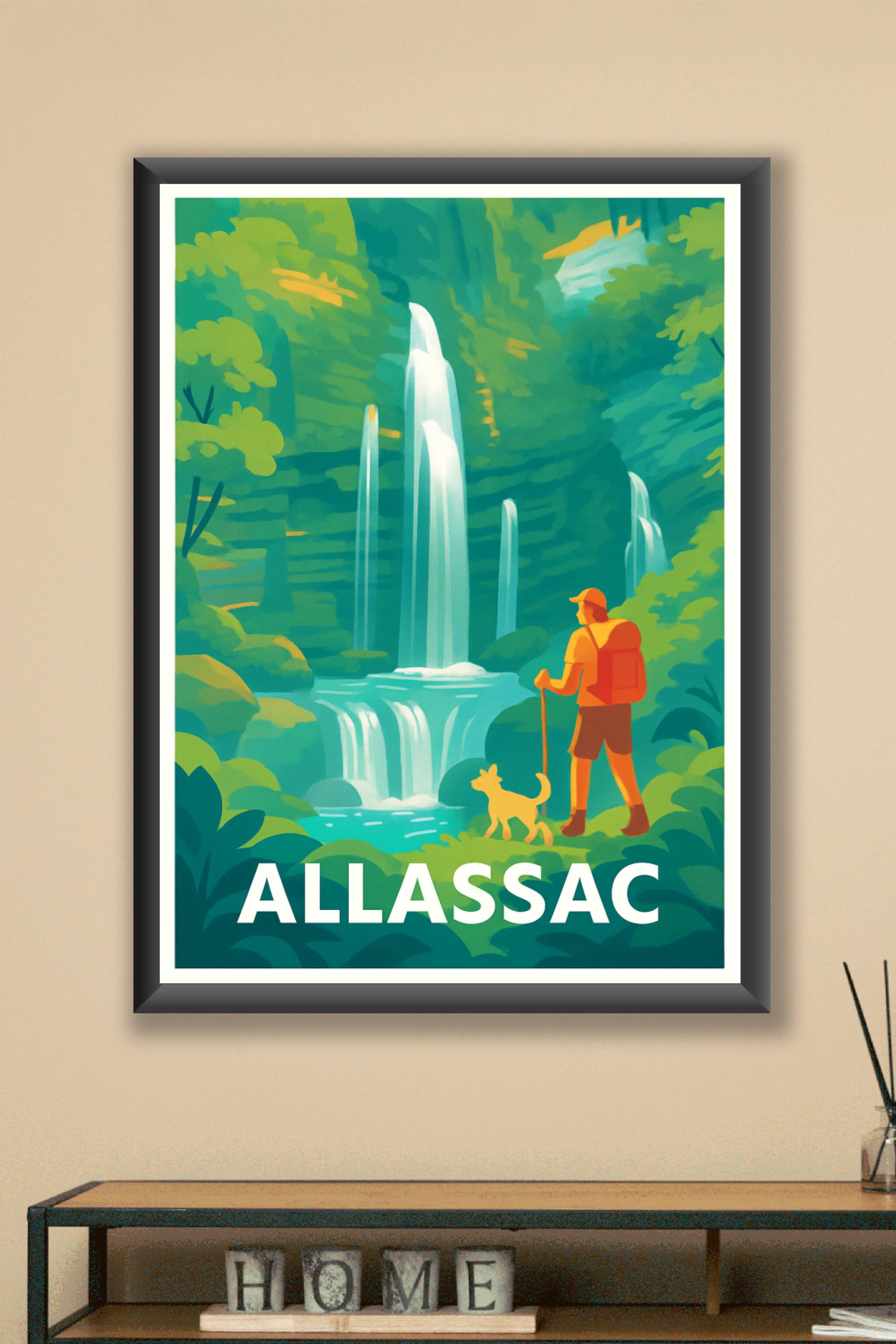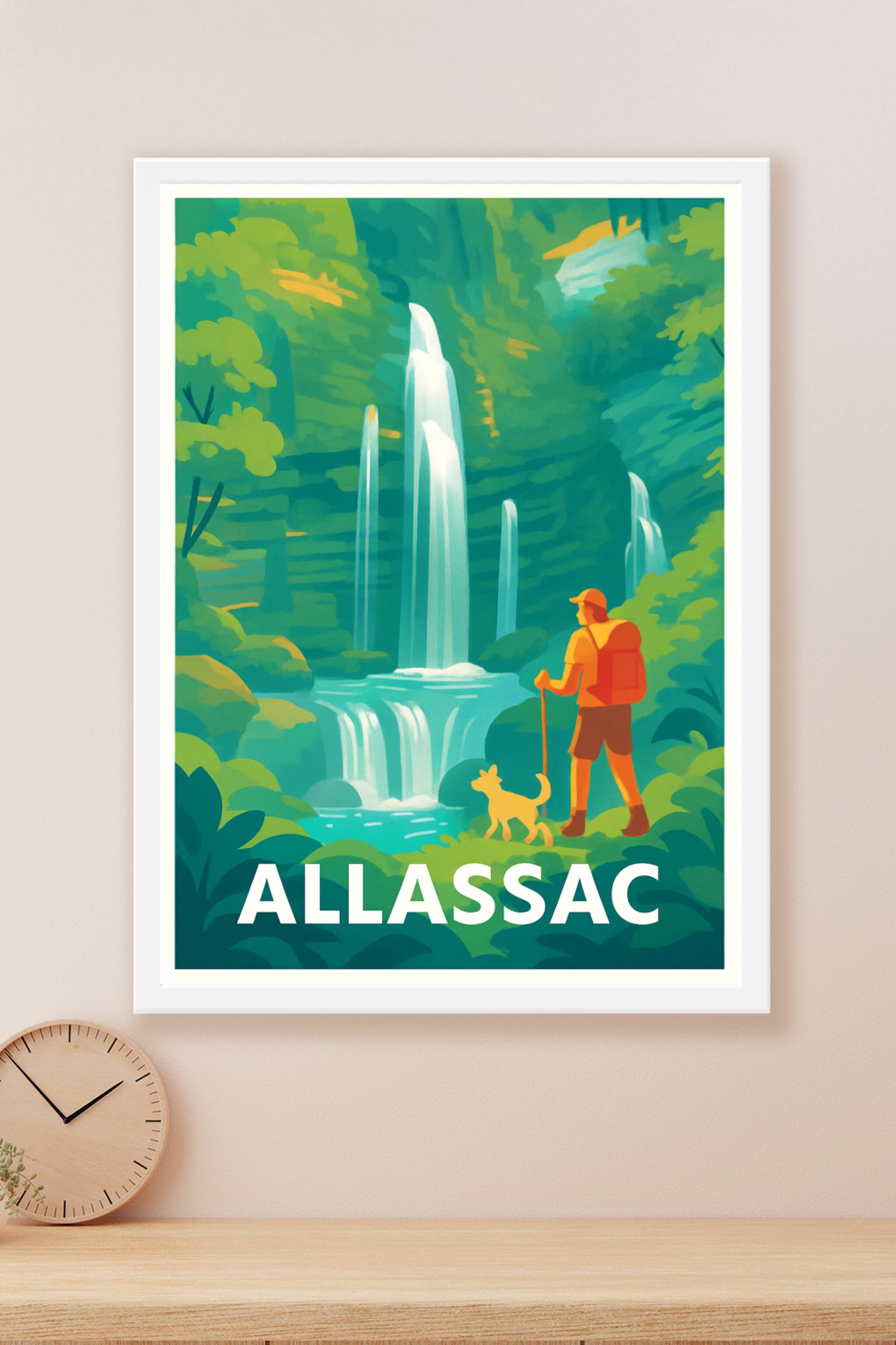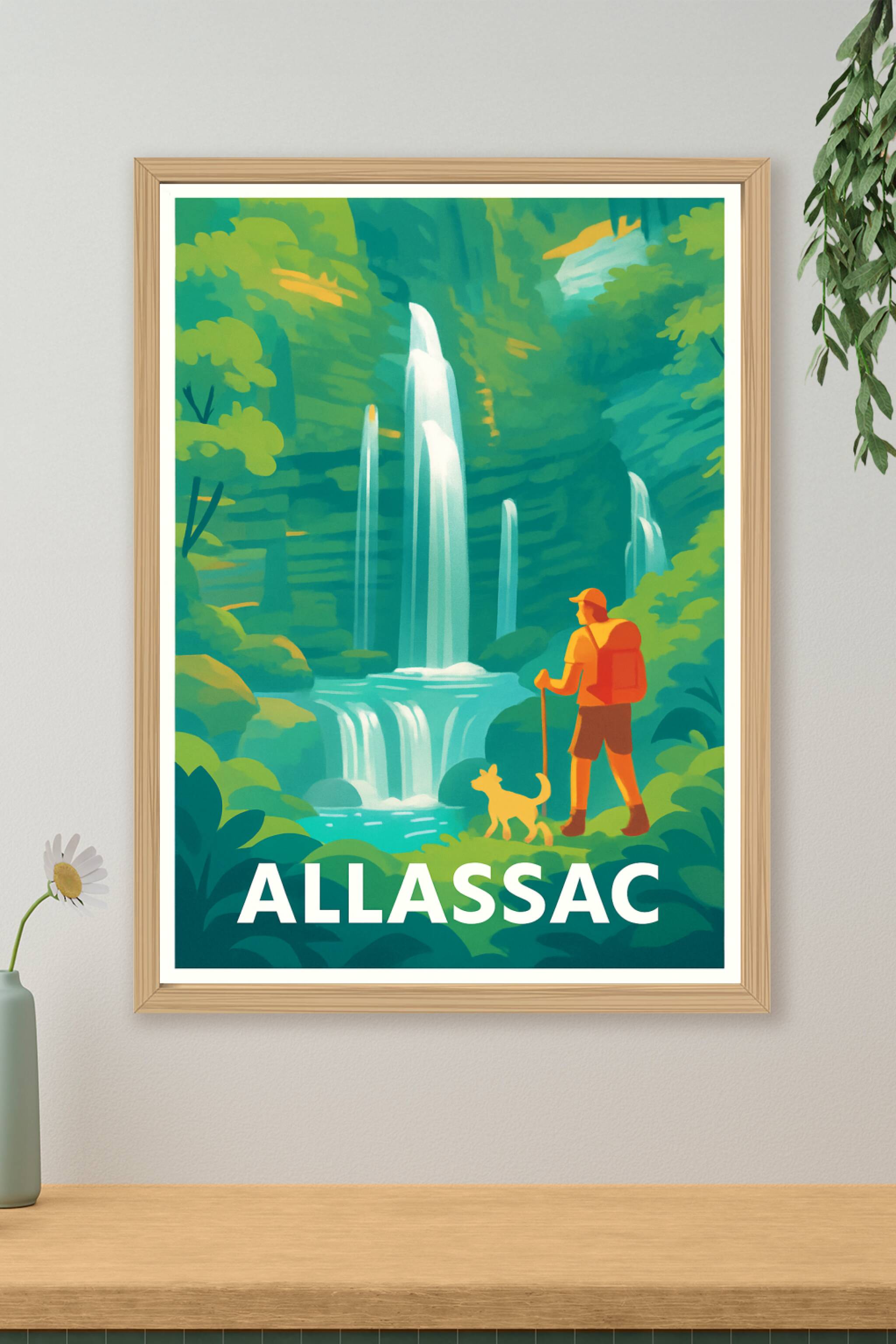 Découvrez la beauté paisible d'Allassac à travers cette affiche illustrée mettant en scène un randonneur et son chien face à des cascades majestueu...
