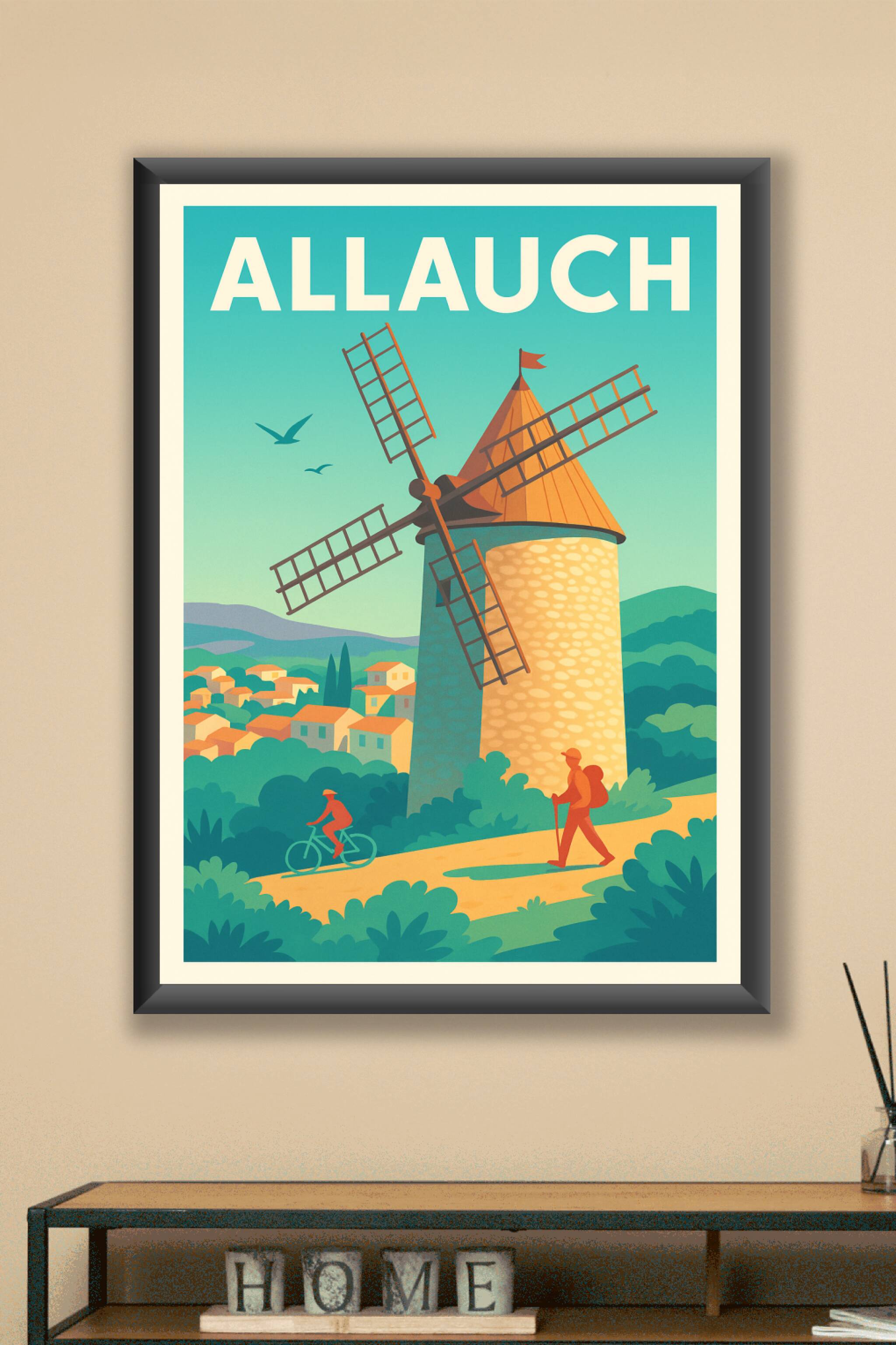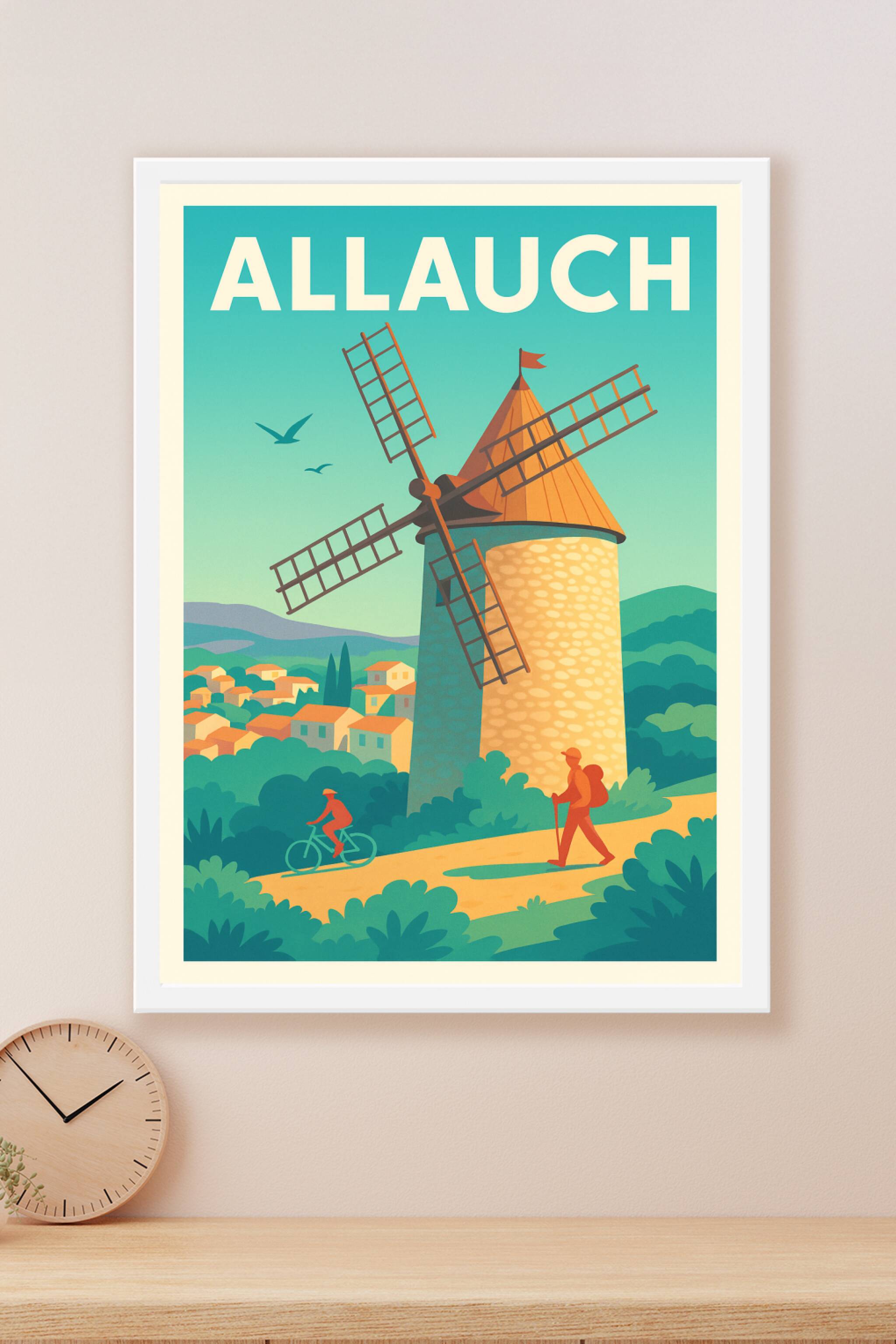 Découvrez le charme authentique d'Allauch avec cette affiche illustrée mettant en avant le célèbre moulin, symbole de la richesse historique et nat...