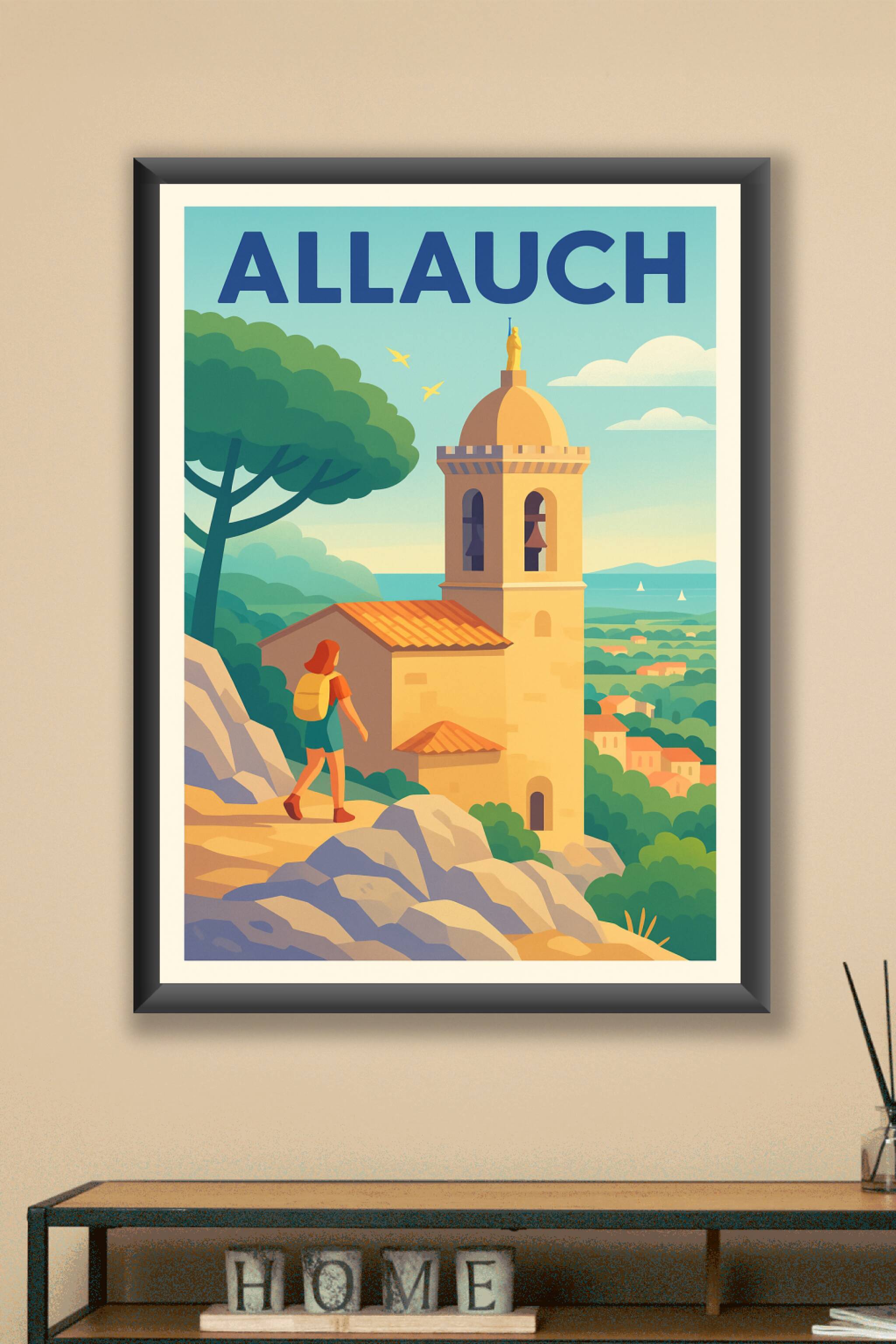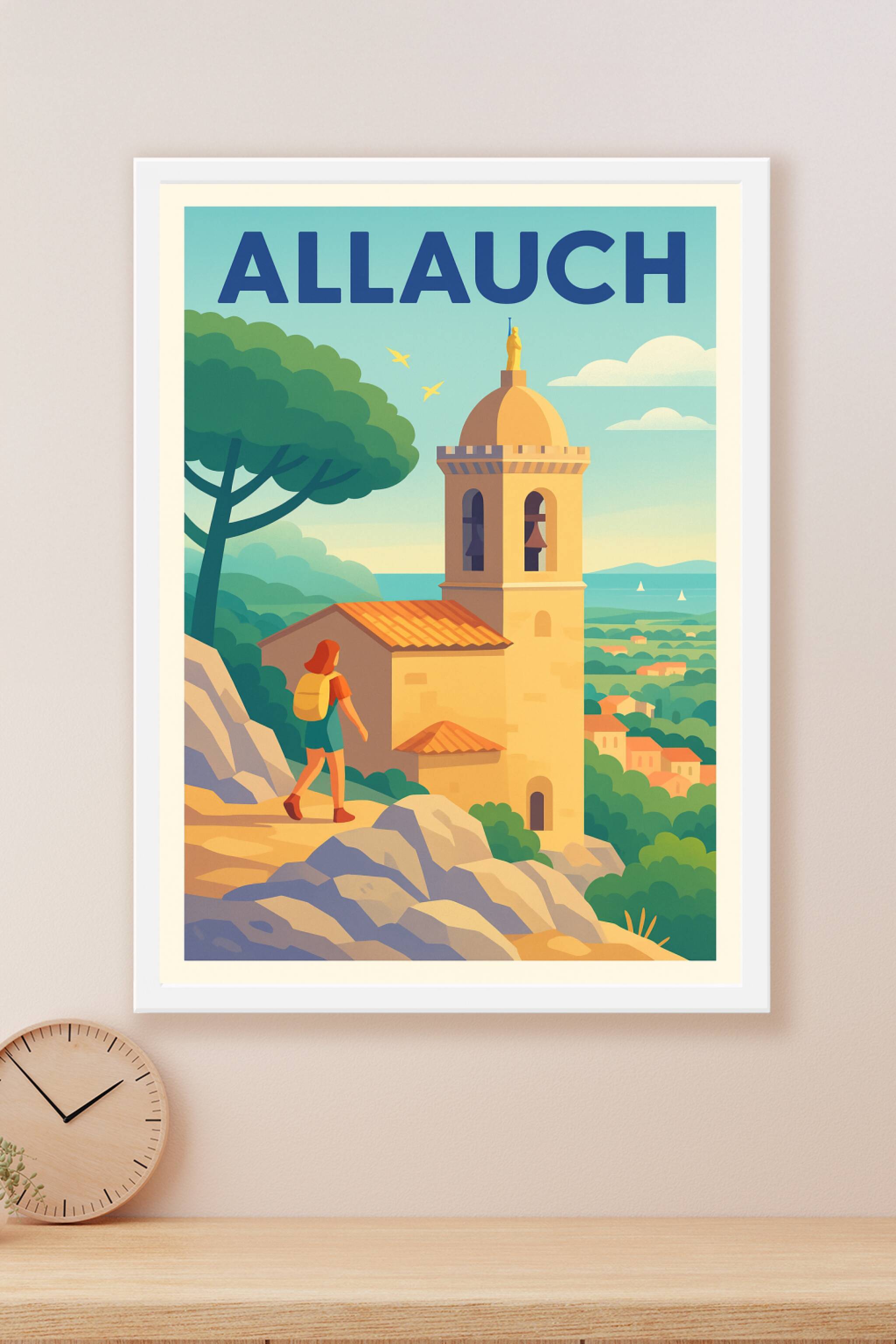 Découvrez l'atmosphère paisible et authentique d'Allauch avec cette affiche illustrée qui met en scène un paysage typique provençal entre collines,...